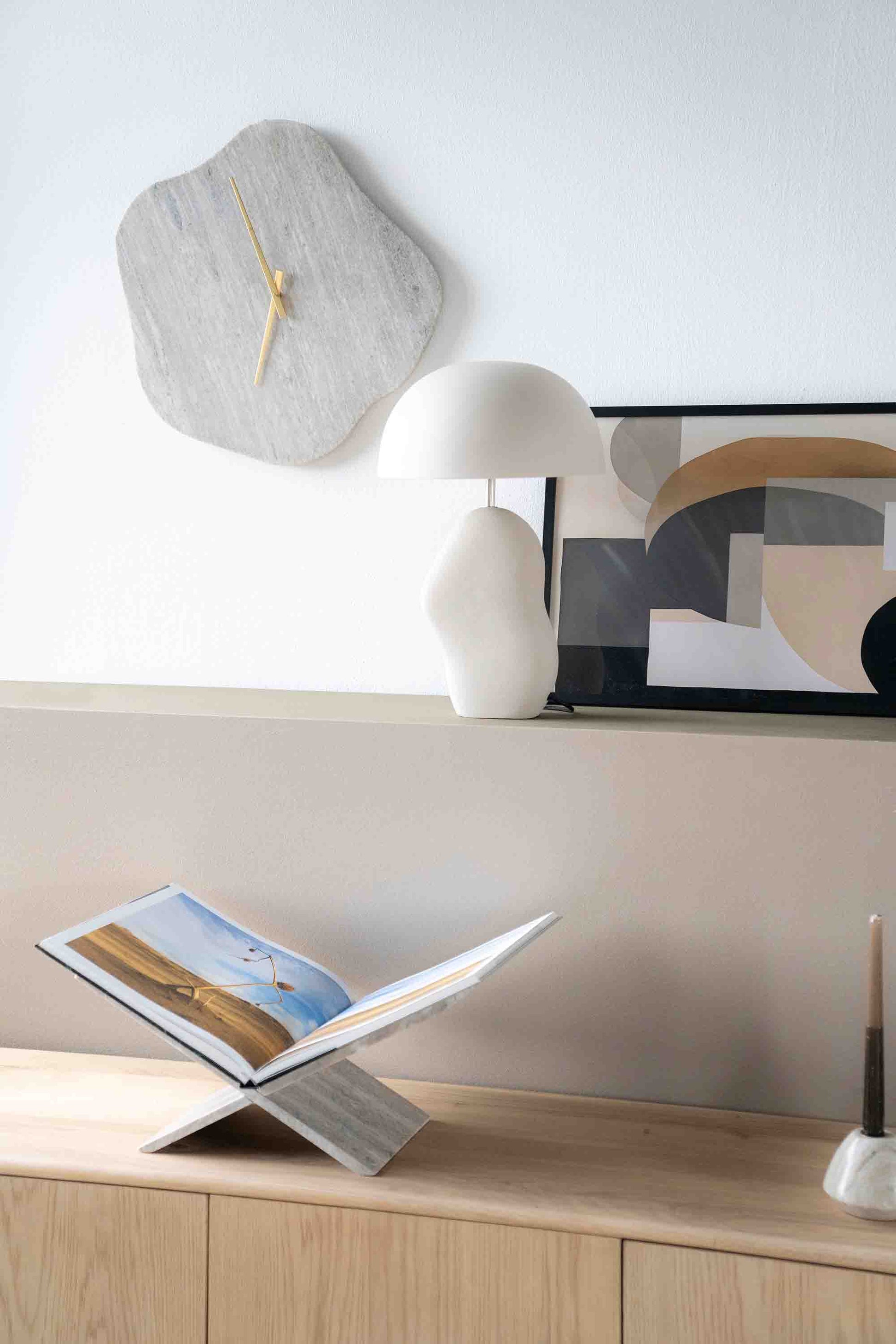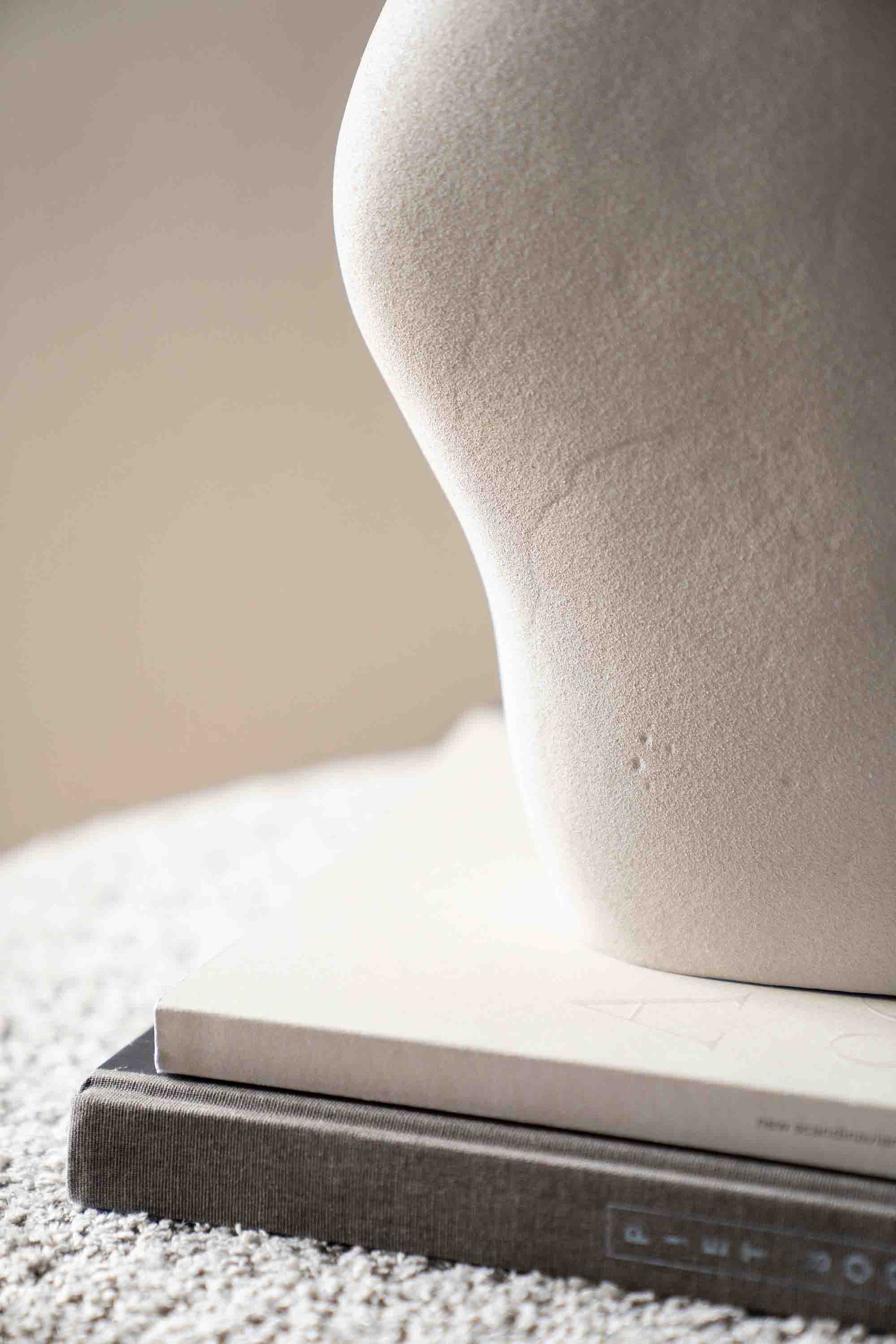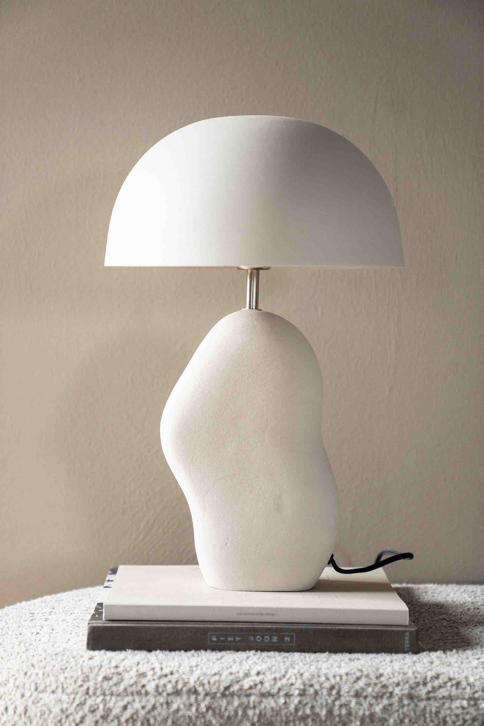 Denne stilrene bordlampen kombinerer moderne minimalisme med et organisk, skulpturelt uttrykk. Lampens base er formet som en myk, naturinspirert steinform, mens skjermen har en perfekt buet, sopp-lignende silhuett. Sammen skaper de et harmonisk og kunstnerisk blikkfang som passer like godt i stuen som på soverommet eller hjemmekontoret.