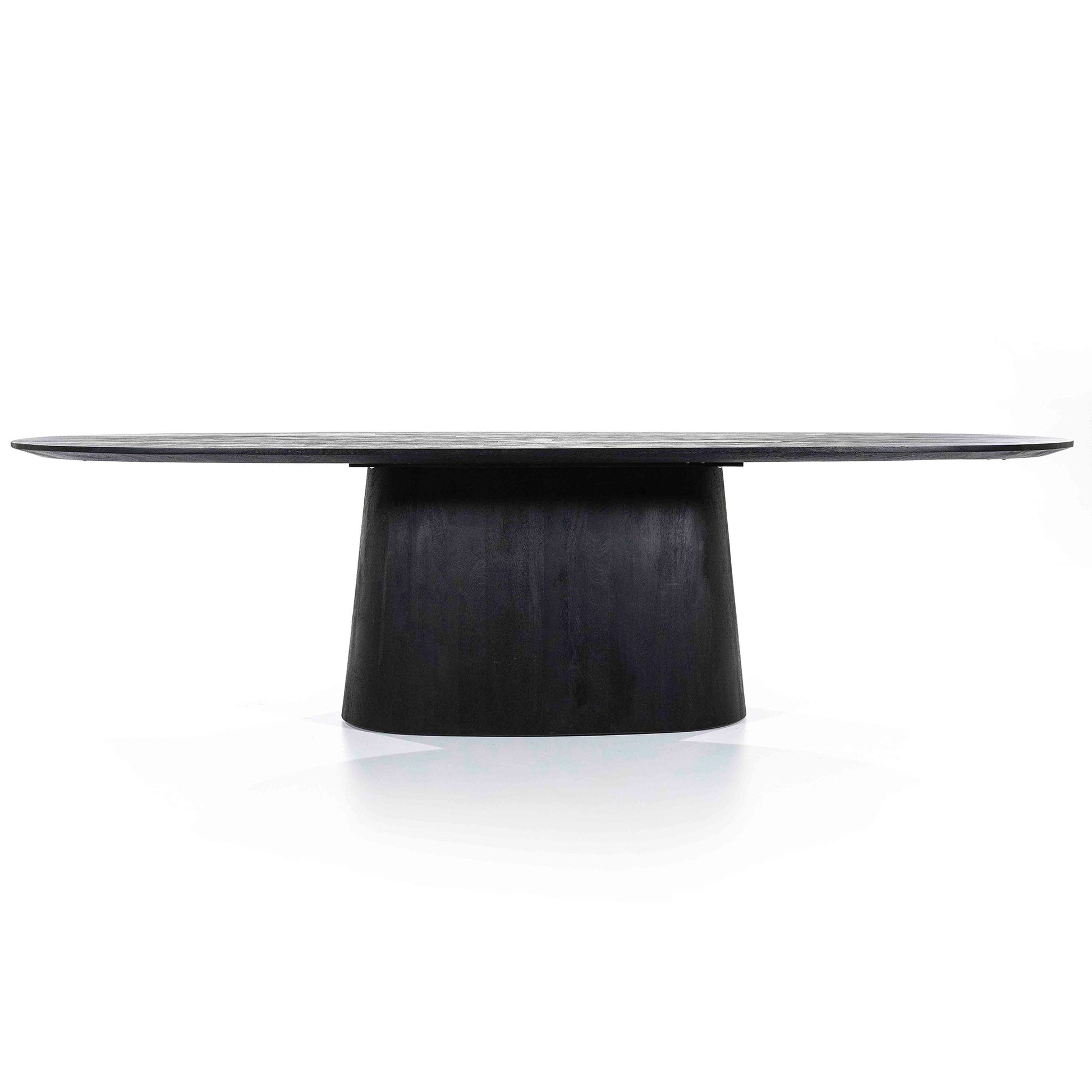 Dette ovale spisebordet kombinerer moderne design med naturlig varme. Bordet er laget i solid sort tre og har en karakteristisk konisk sokkel som gir et stabilt og eksklusivt uttrykk. Den ovale bordplaten gir god plass til familie og venner, og skaper en mer intim atmosfære enn et tradisjonelt rektangulært bord.