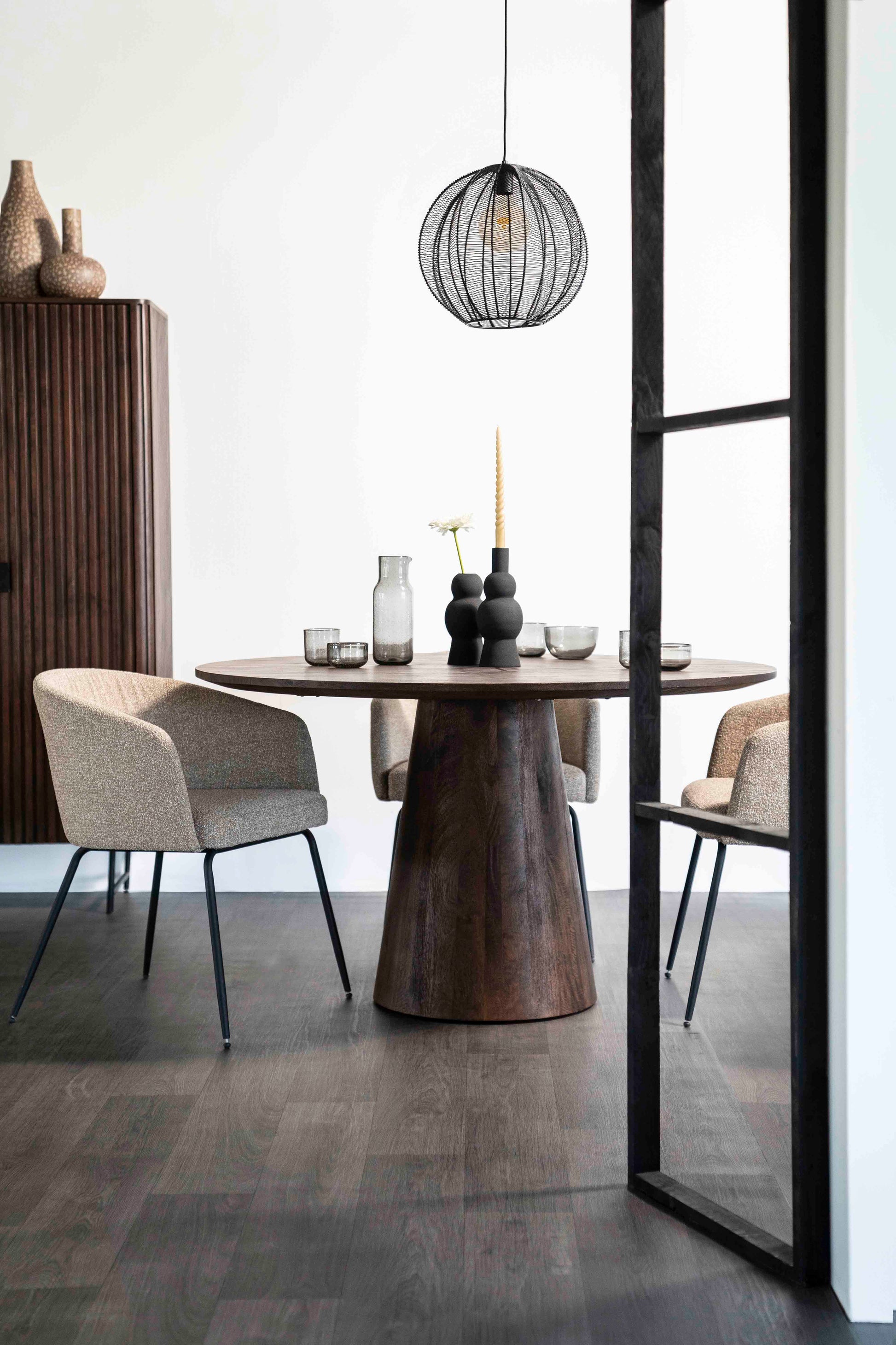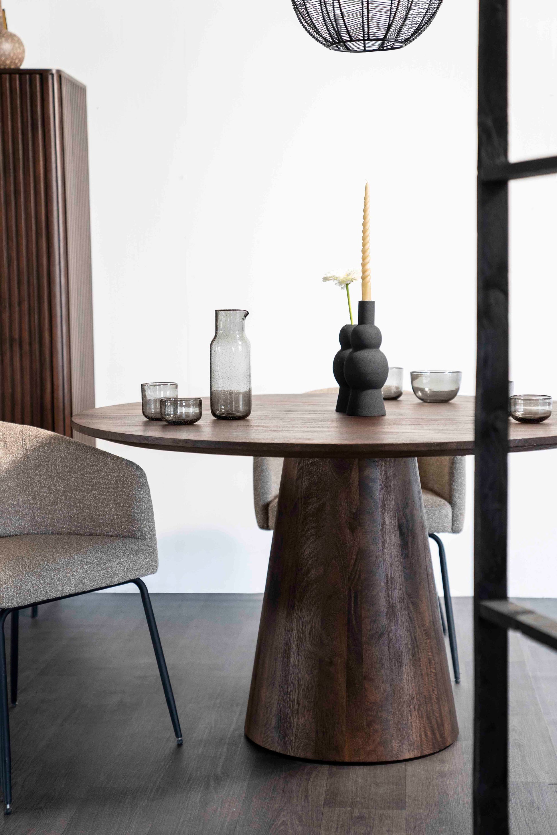 Et stilrent spisebord med en rund bordplate og en solid, konisk sokkel i mørkt treverk. Bordet kombinerer moderne minimalisme med naturlig varme og passer perfekt både i det moderne hjem og i mer klassiske interiørstiler. Den runde formen skaper en innbydende atmosfære og gjør bordet ideelt for hyggelige måltider og gode samtaler.