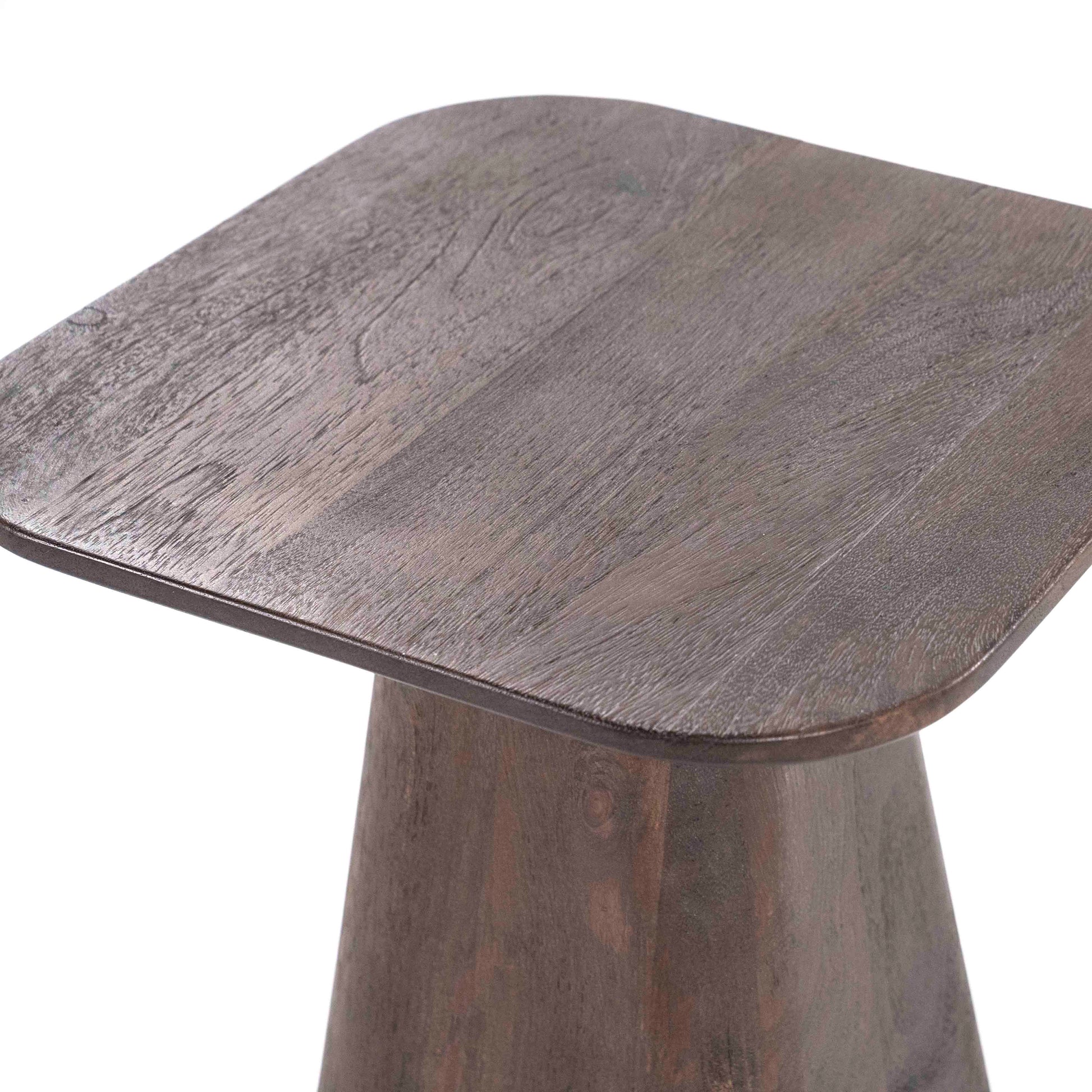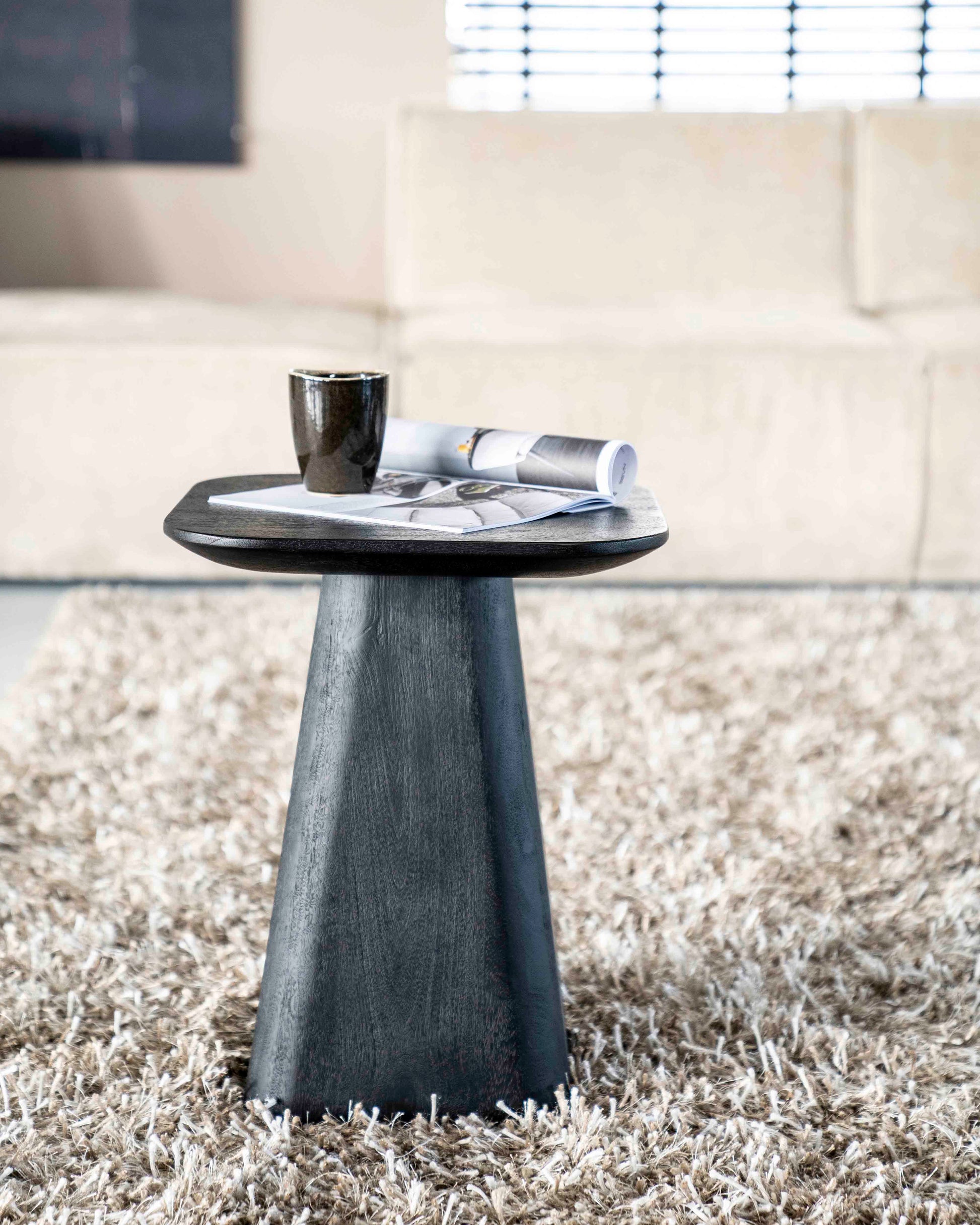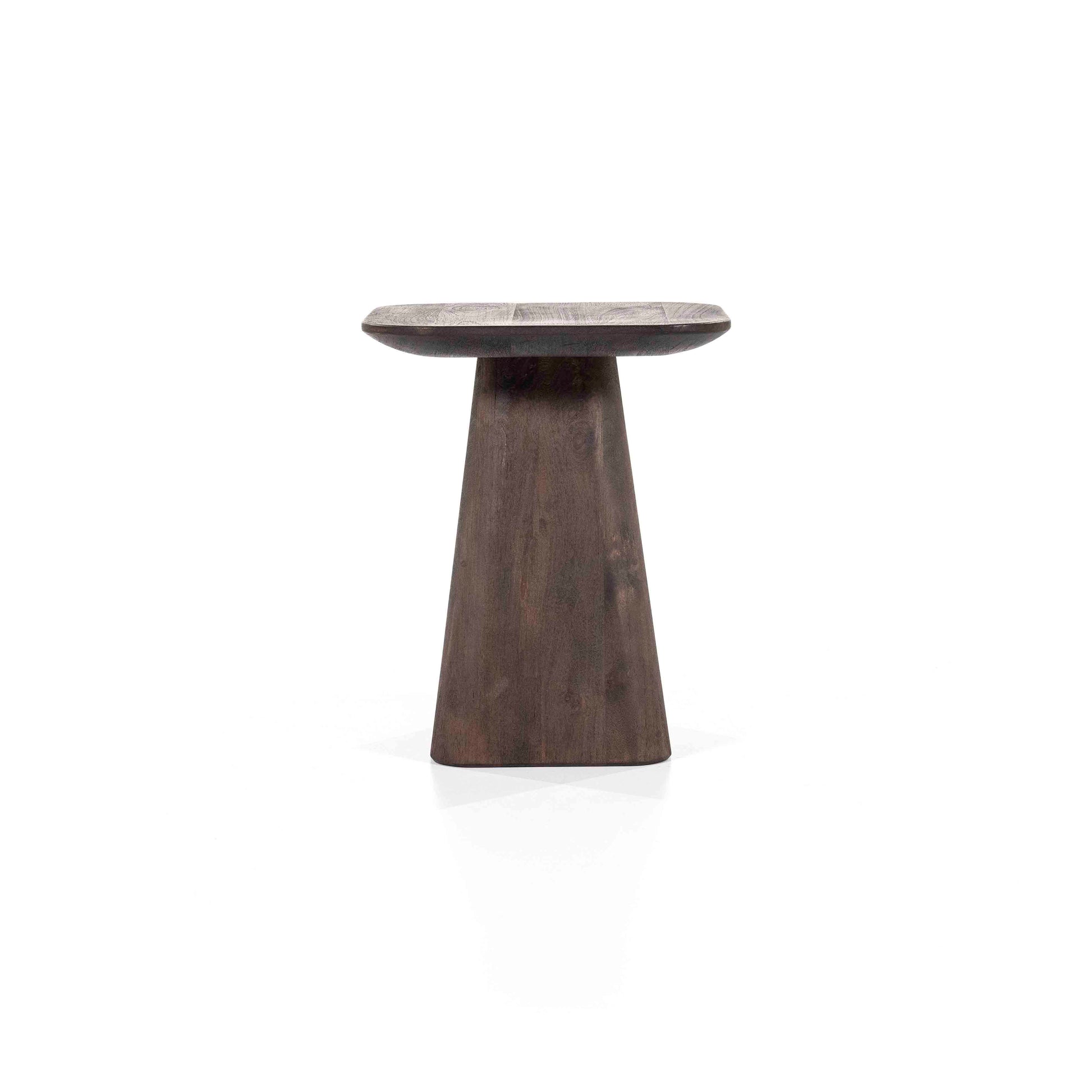 Et elegant sidebord laget av massivt mørkt tre med en avrundet topp og konisk base. Den rene, skulpturelle formen gir bordet et moderne uttrykk, samtidig som treets naturlige struktur tilfører varme og karakter. Perfekt som sidebord ved sofaen, nattbord på soverommet, eller som et dekorativt element i gangen.
