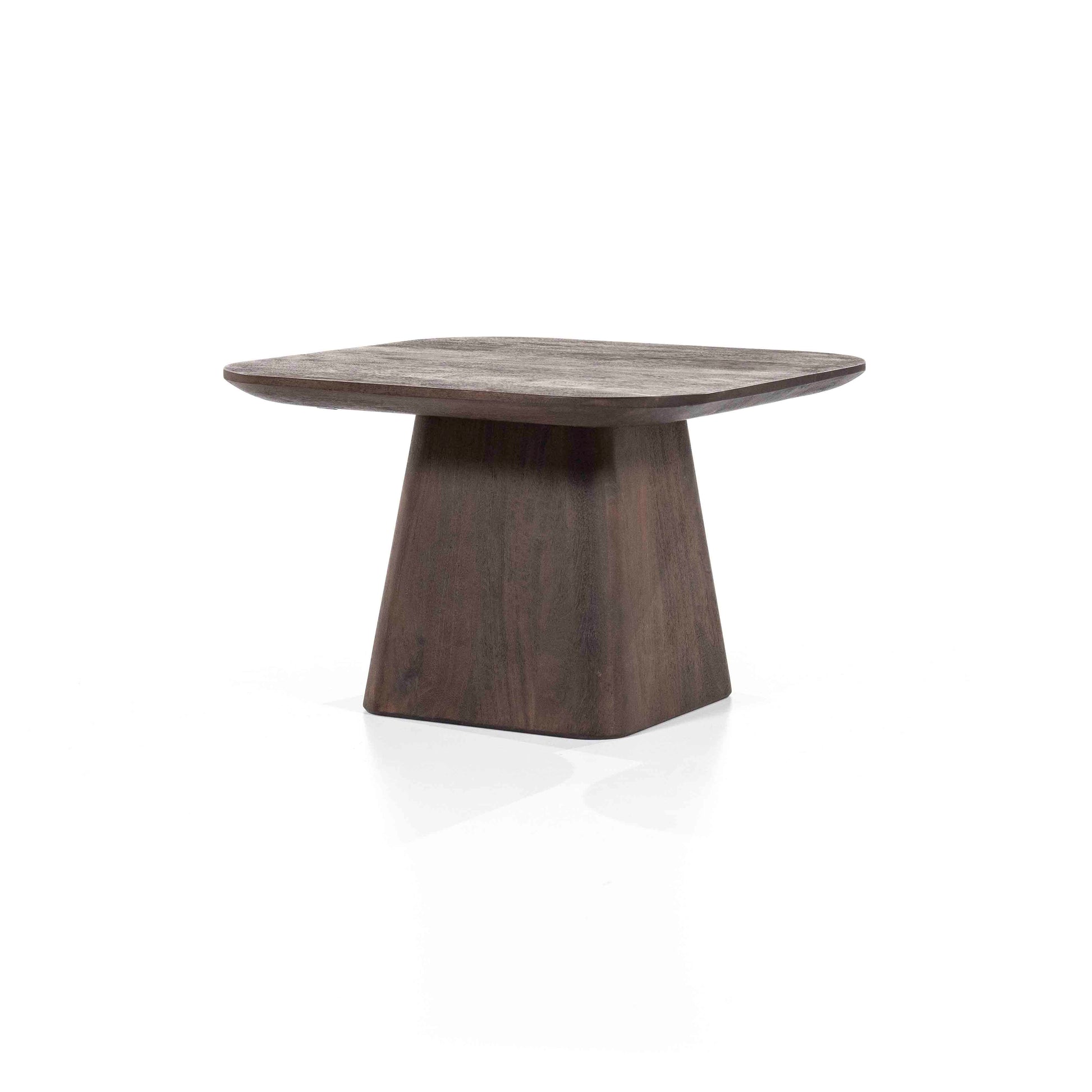 Et lavt salongbord laget av massivt mørkt tre, med en avrundet, kvadratisk bordplate og en robust, konisk base. Bordets form gir det et skulpturelt preg som tilfører både tyngde og eleganse til rommet. Det mørke treverket gir en varm og eksklusiv følelse, perfekt for moderne og naturlige interiører.