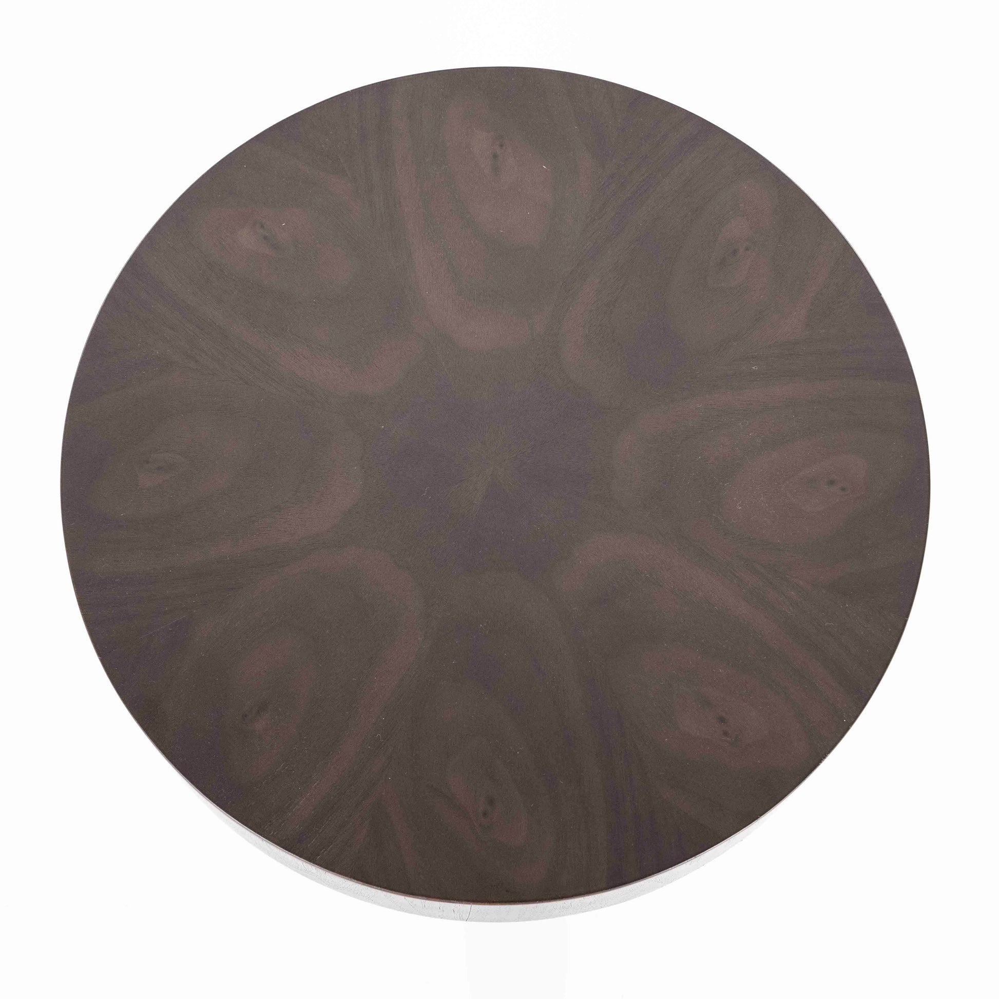Et elegant salongbord med moderne form og varm karakter. Bordet er laget i valnøttfinèr med en dyp, mørkbeiset finish som fremhever treets naturlige struktur. Den runde bordplaten hviler på en kraftig sylinderformet sokkel, som gir bordet et skulpturelt og balansert uttrykk.