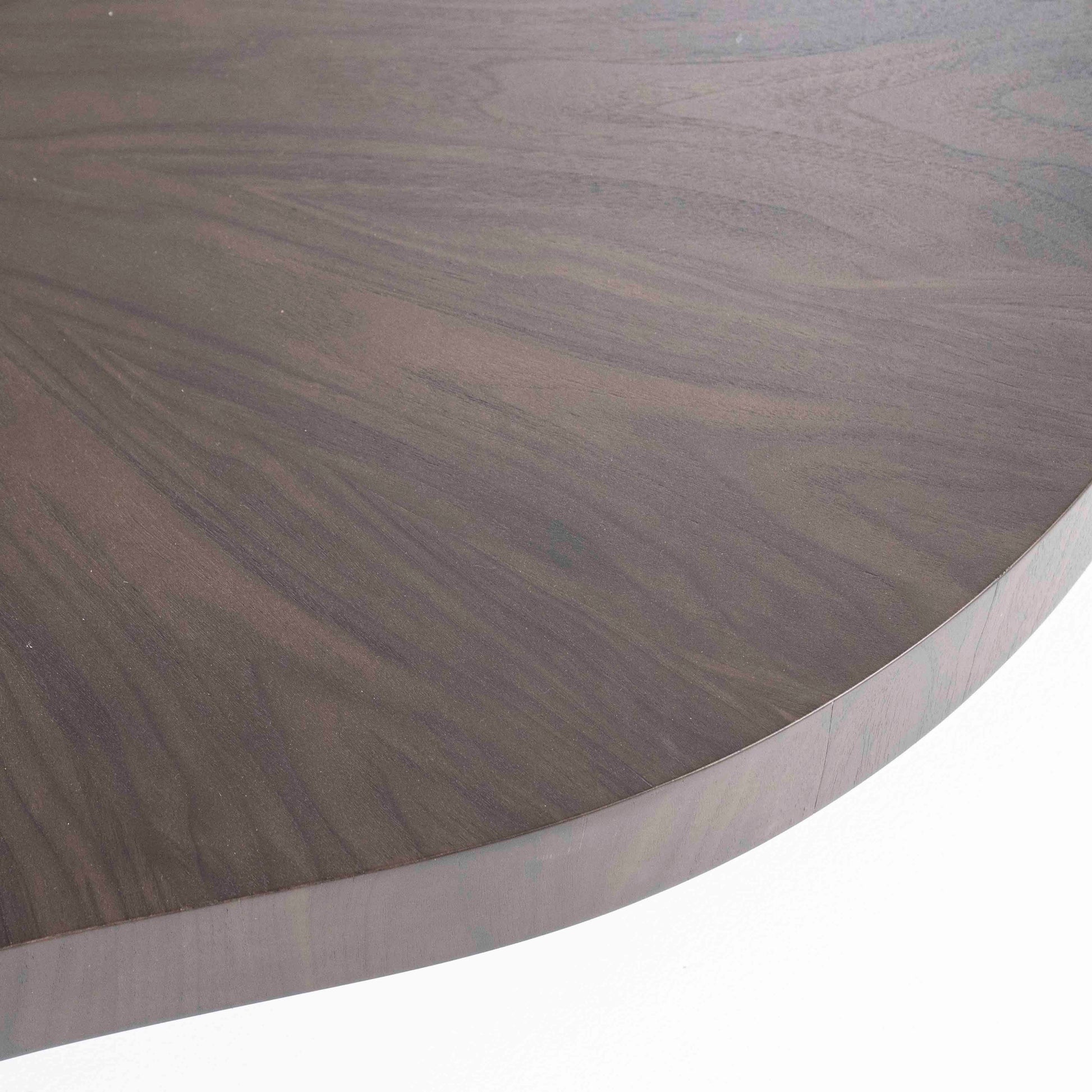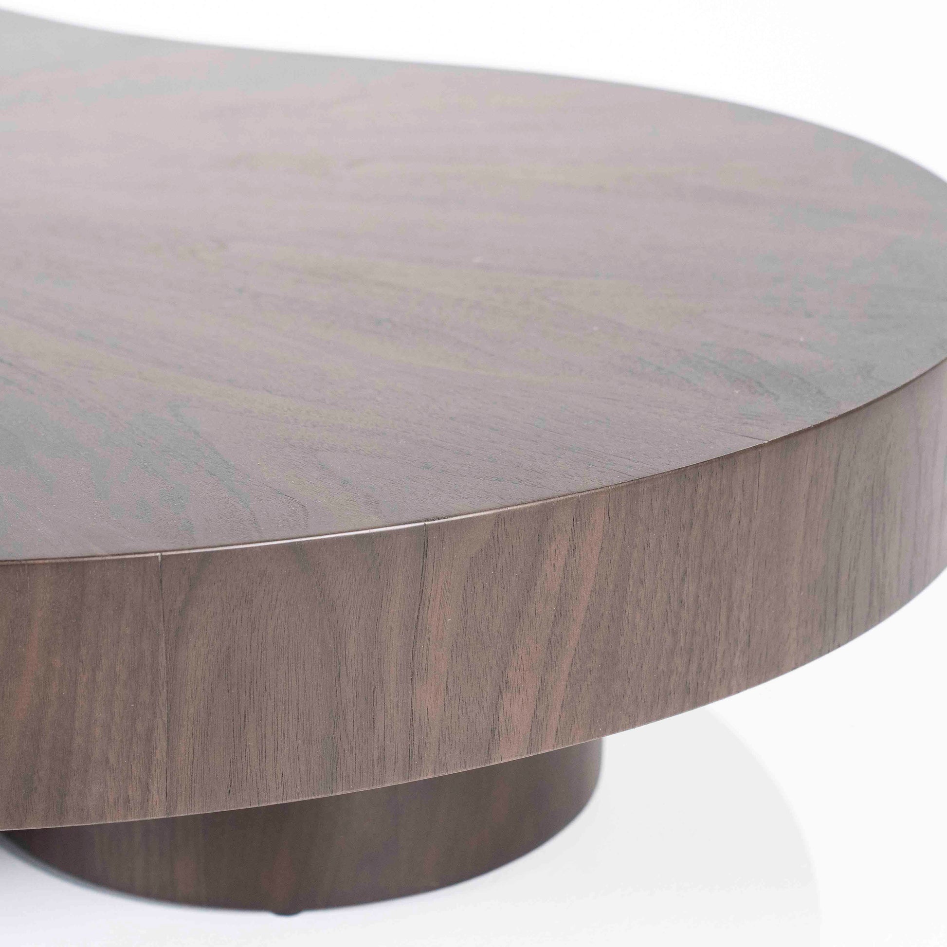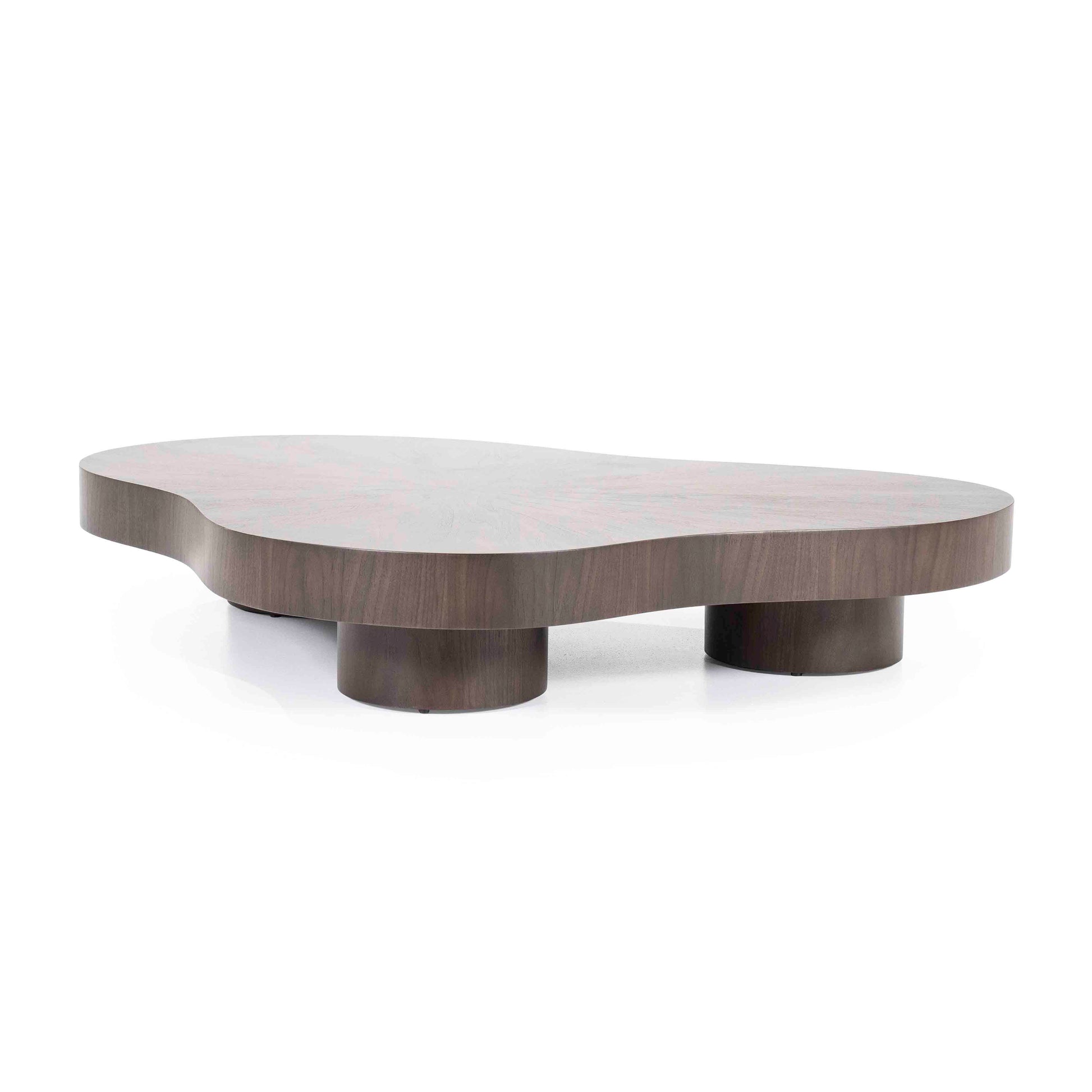 Et elegant og skulpturelt salongbord med en naturlig, organisk form. Bordet er laget i valnøttfinèr som fremhever årringene og gir et varmt og eksklusivt uttrykk. Den myke, asymmetriske bordplaten hviler på tre solide, sylinderformede ben som gir et balansert og moderne preg.