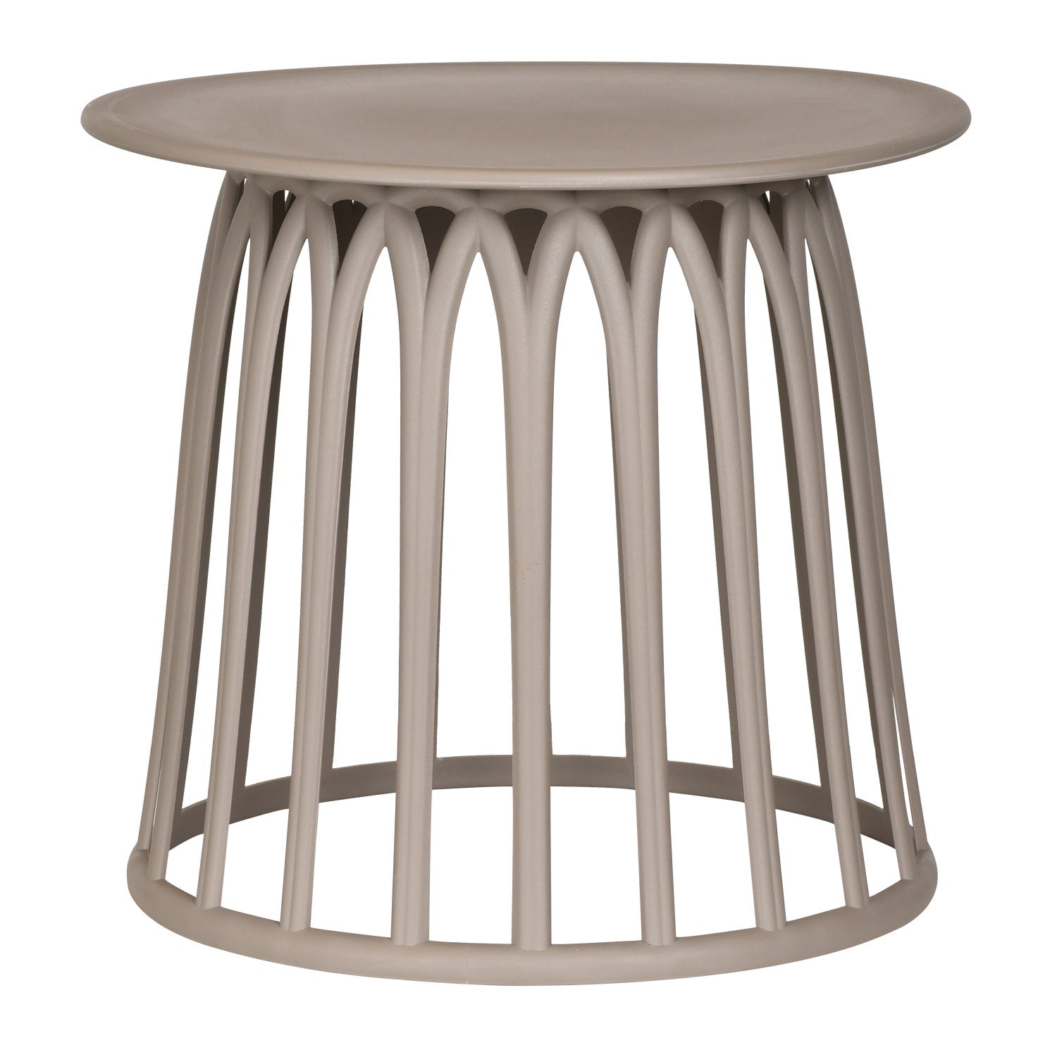 Et lett og dekorativt sidebord med et lekent, grafisk formspråk. Den åpne konstruksjonen gir bordet et luftig uttrykk, mens den runde toppen gjør det både funksjonelt og elegant – perfekt som avlastningsbord inne eller ute.
