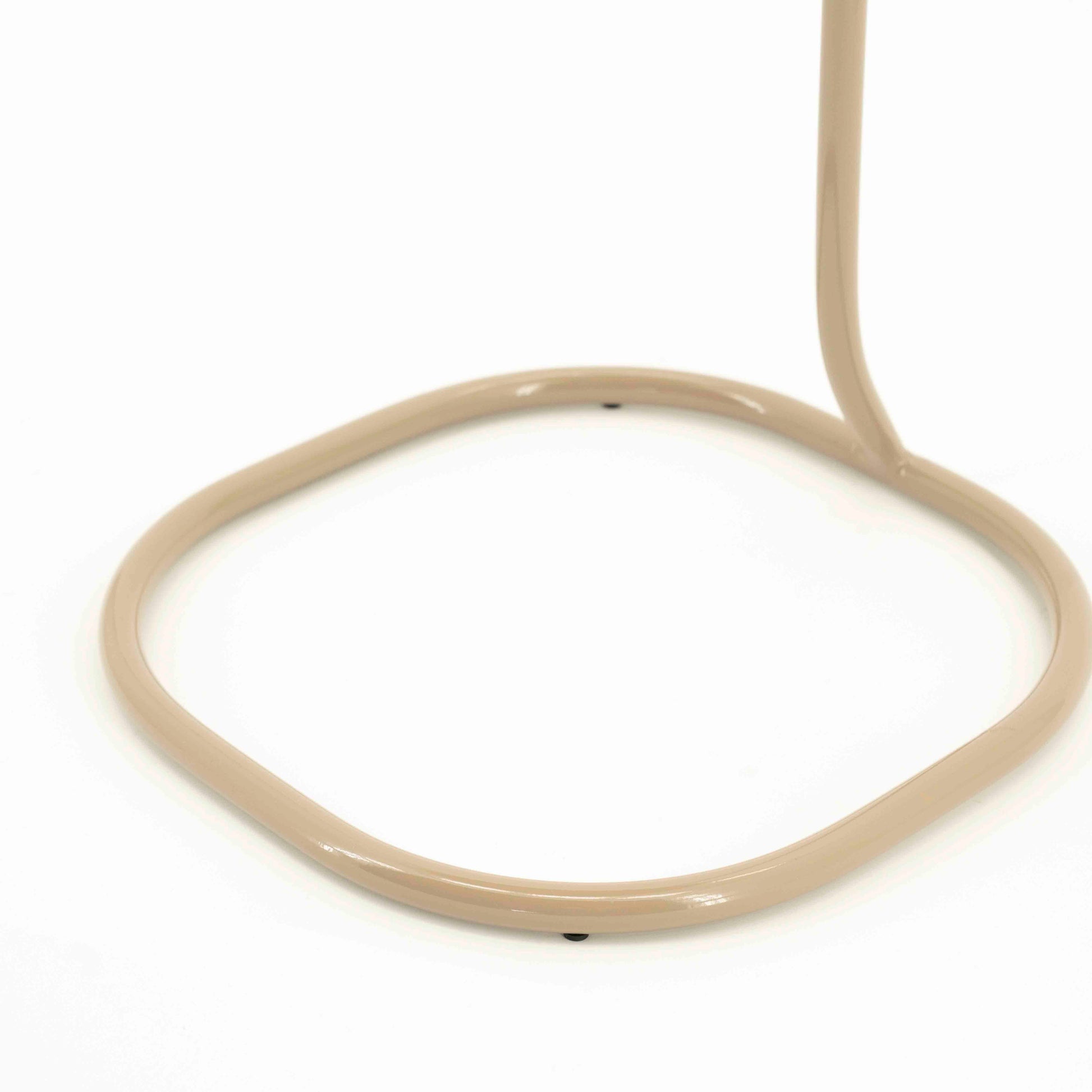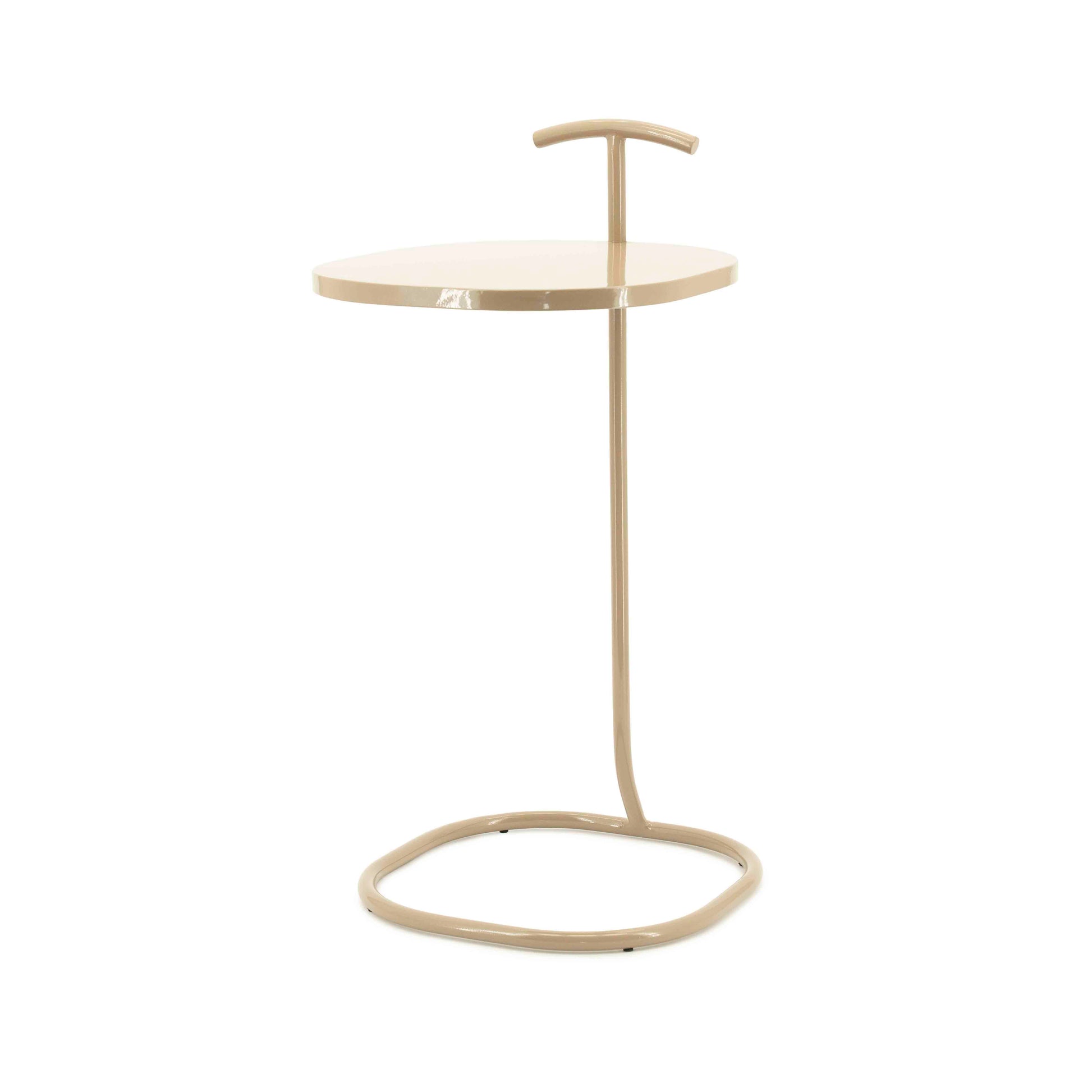 Et elegant og funksjonelt sidebord med et moderne, skulpturelt uttrykk. Bordet er laget i pulverlakkert metall med avrundede former og et praktisk håndtak som gjør det enkelt å flytte rundt. Den lette konstruksjonen og det minimalistiske designet gjør bordet perfekt som avlastningsbord ved sofaen, lenestolen eller sengen.