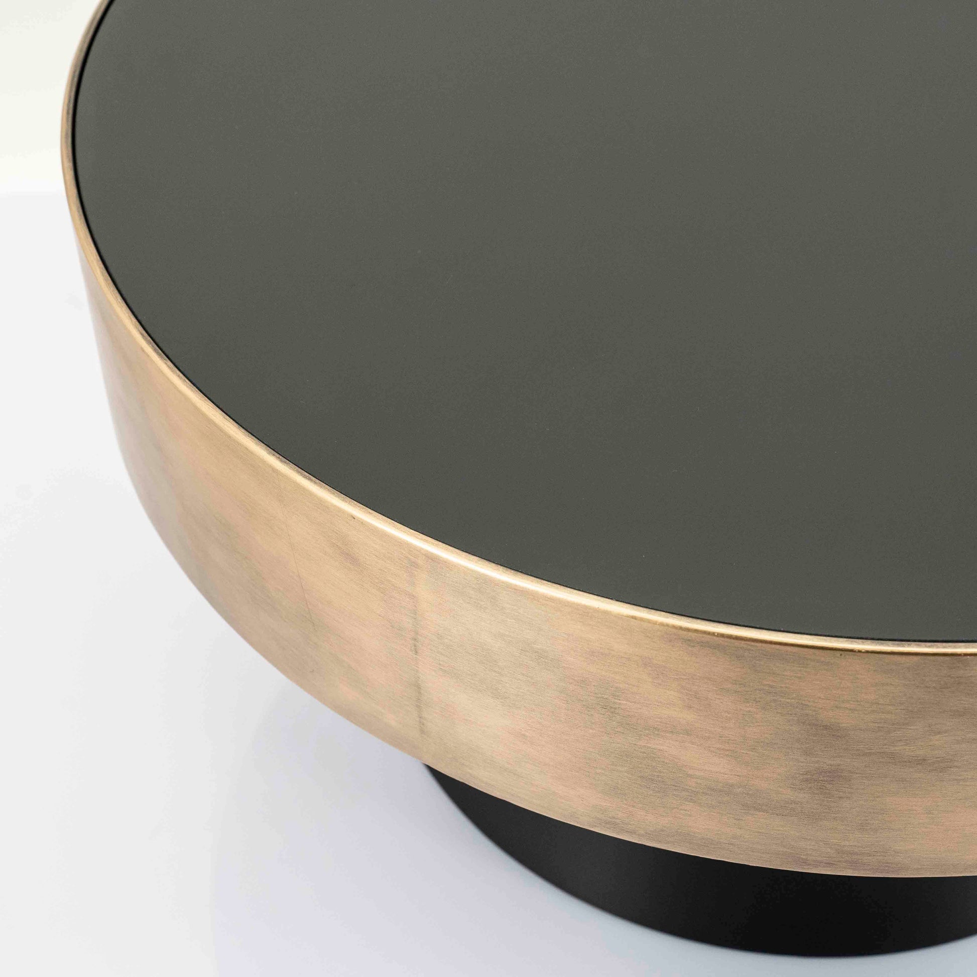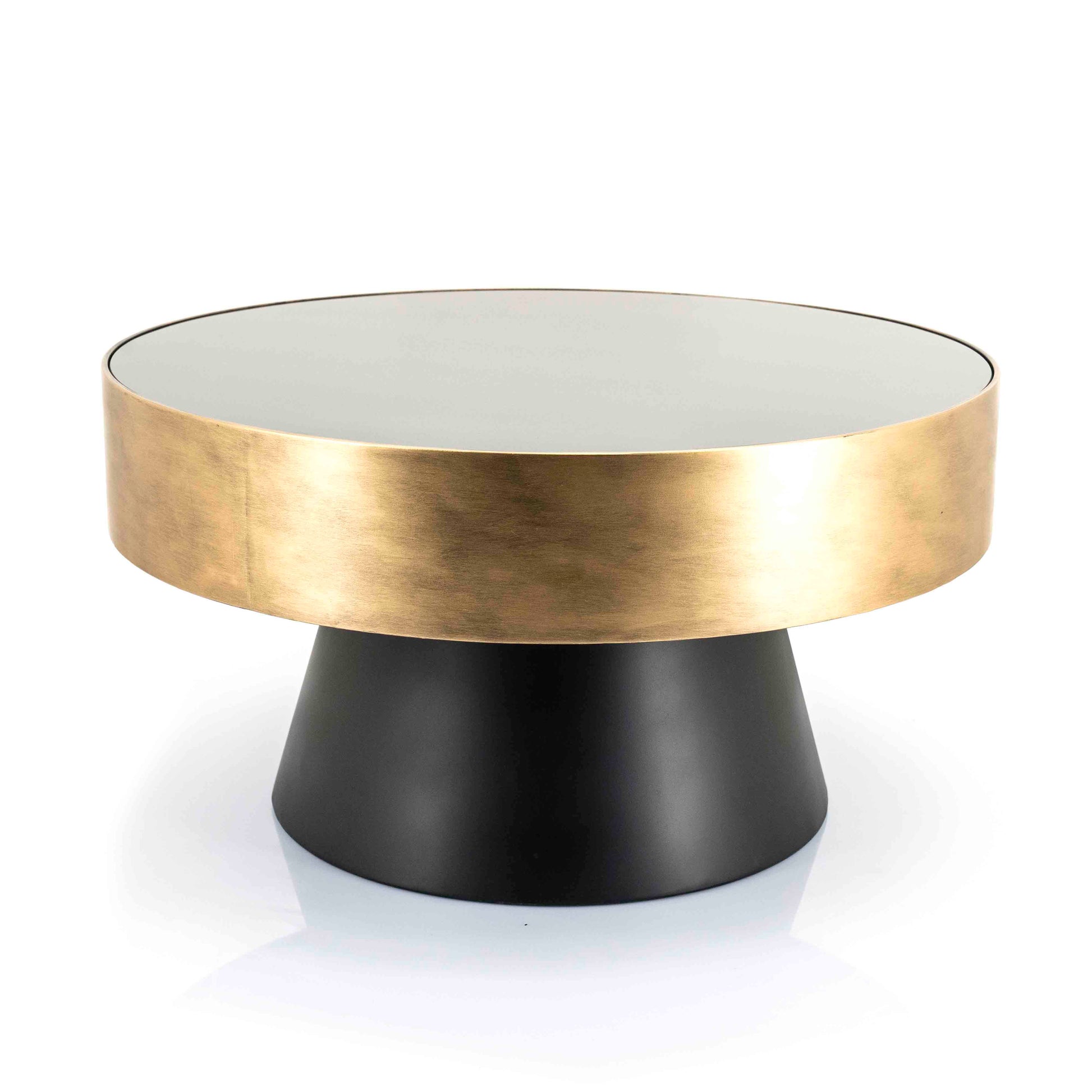 Et moderne og stilrent sofabord med et iøynefallende design. Bordet har en sort, konisk base kombinert med en elegant messingfarget toppkant og en lys bordplate som gir en eksklusiv kontrast. Perfekt i kombinasjon med Bunga sidebord.