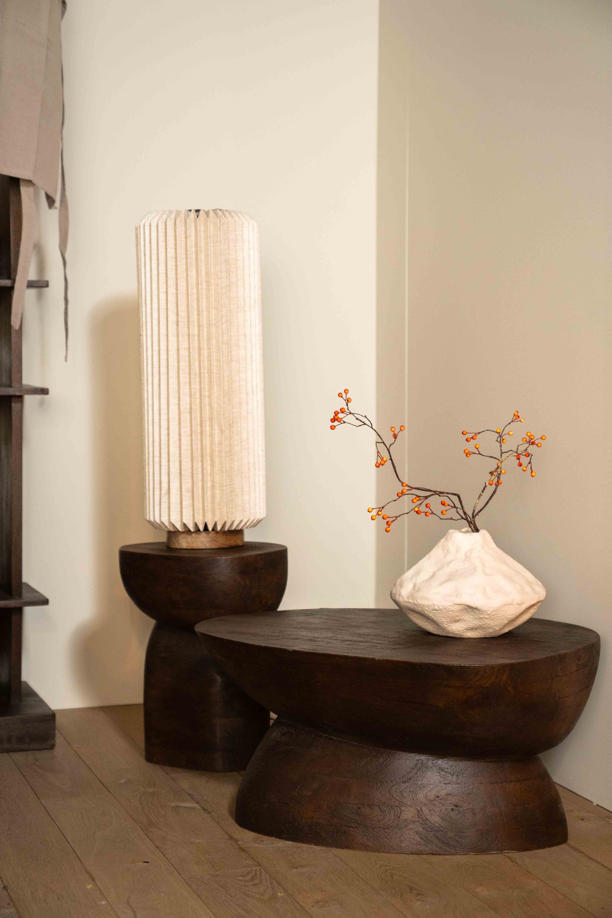 Et naturlig og skulpturelt sidebord laget i massivt tre. Den myke, avrundede formen gir et organisk og moderne uttrykk, mens den mørke finishen fremhever treets vakre struktur. Bordet fungerer like godt som et sidebord ved sofaen som et dekorativt element i rommet.