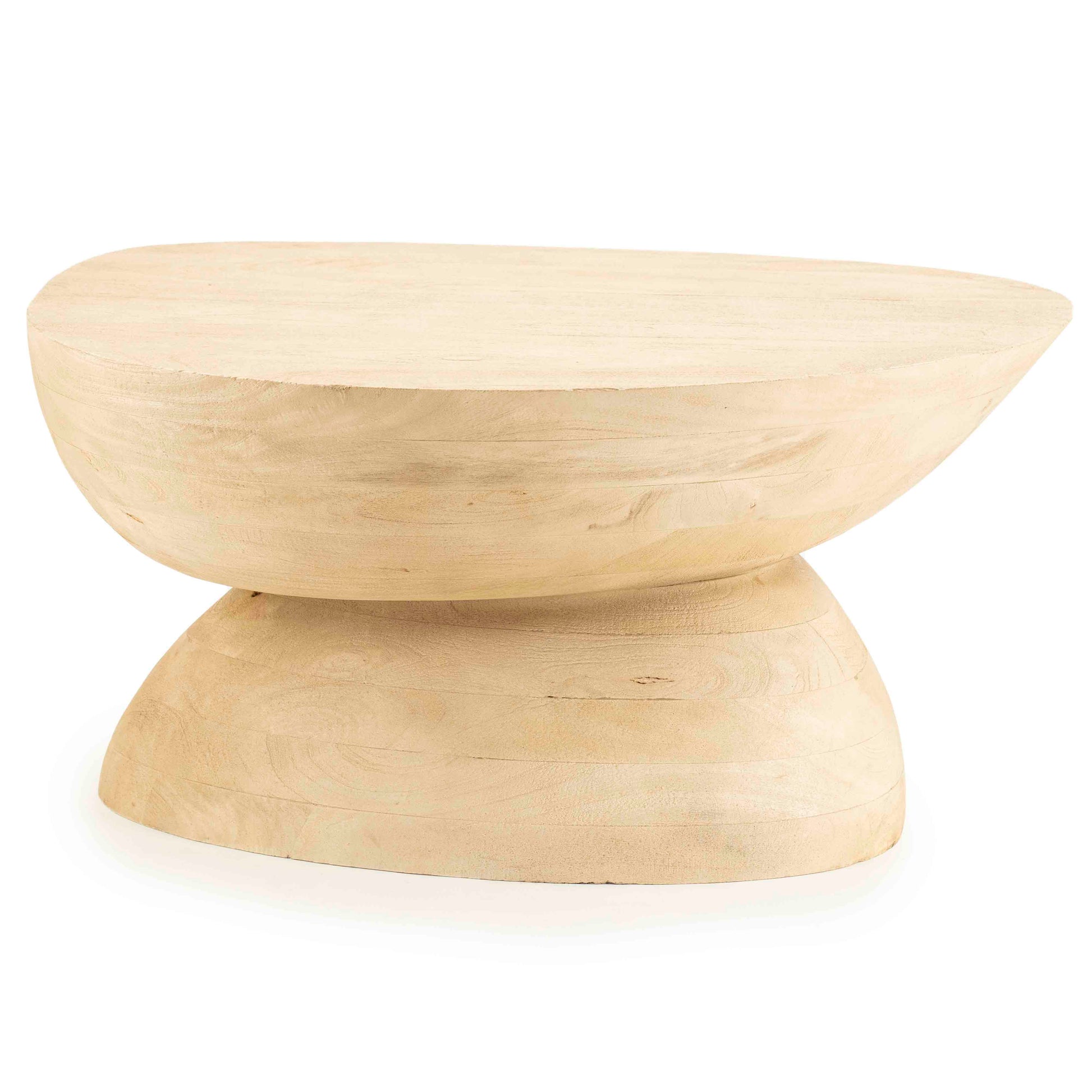 Et karaktersterkt sofabord skåret i mango tre, med en organisk og skulpturell form. Den lyse, varme finishen gir bordet et naturlig, jordnært uttrykk som tilfører dybde til rommet. Bordets avrundede linjer og solide silhuett gjør det til et kunstnerisk midtpunkt i stuen.