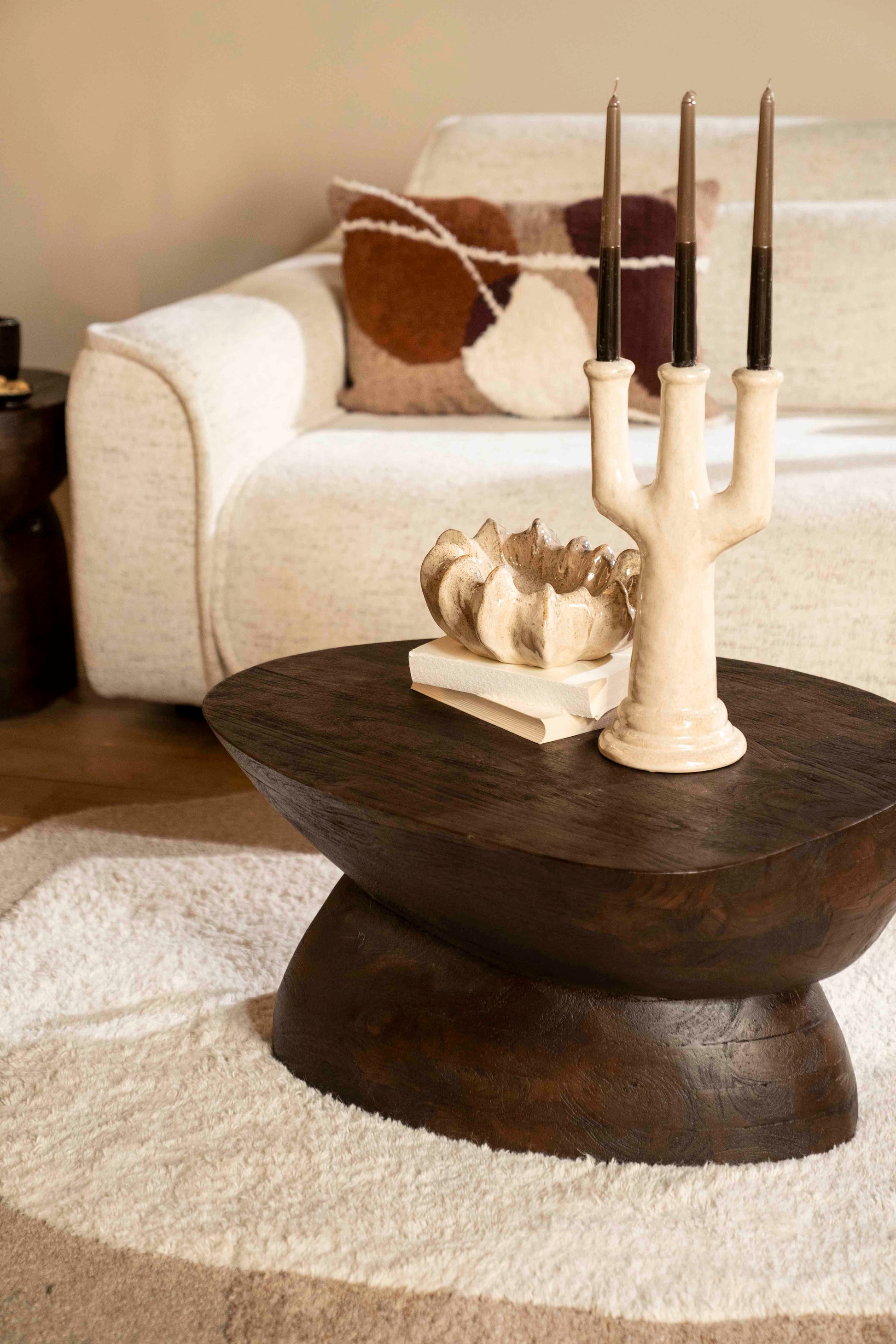 Et karaktersterkt sofabord skåret i mango tre, med en organisk og skulpturell form. Den mørke, varme finishen gir bordet et naturlig, jordnært uttrykk som tilfører dybde til rommet. Bordets avrundede linjer og solide silhuett gjør det til et kunstnerisk midtpunkt i stuen.