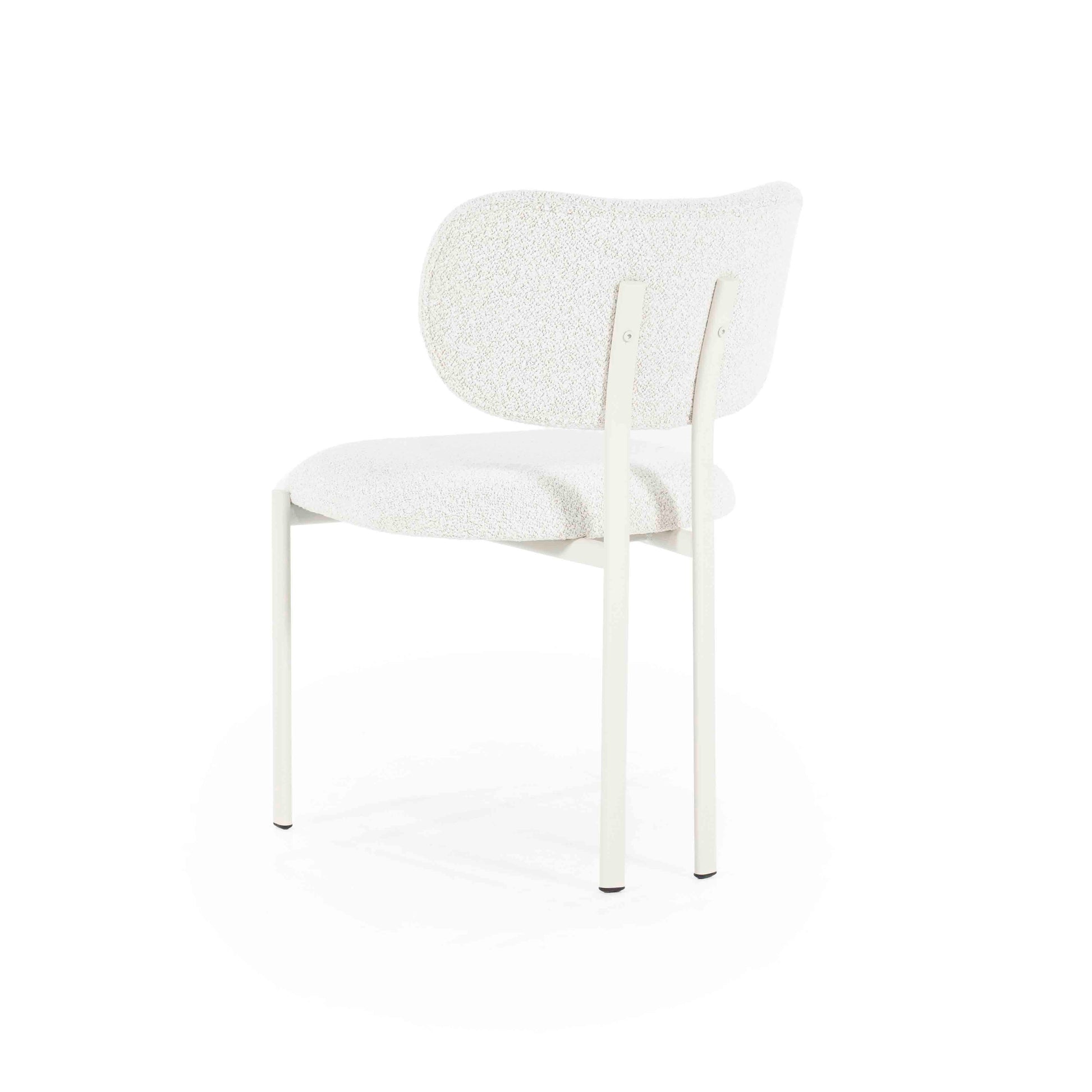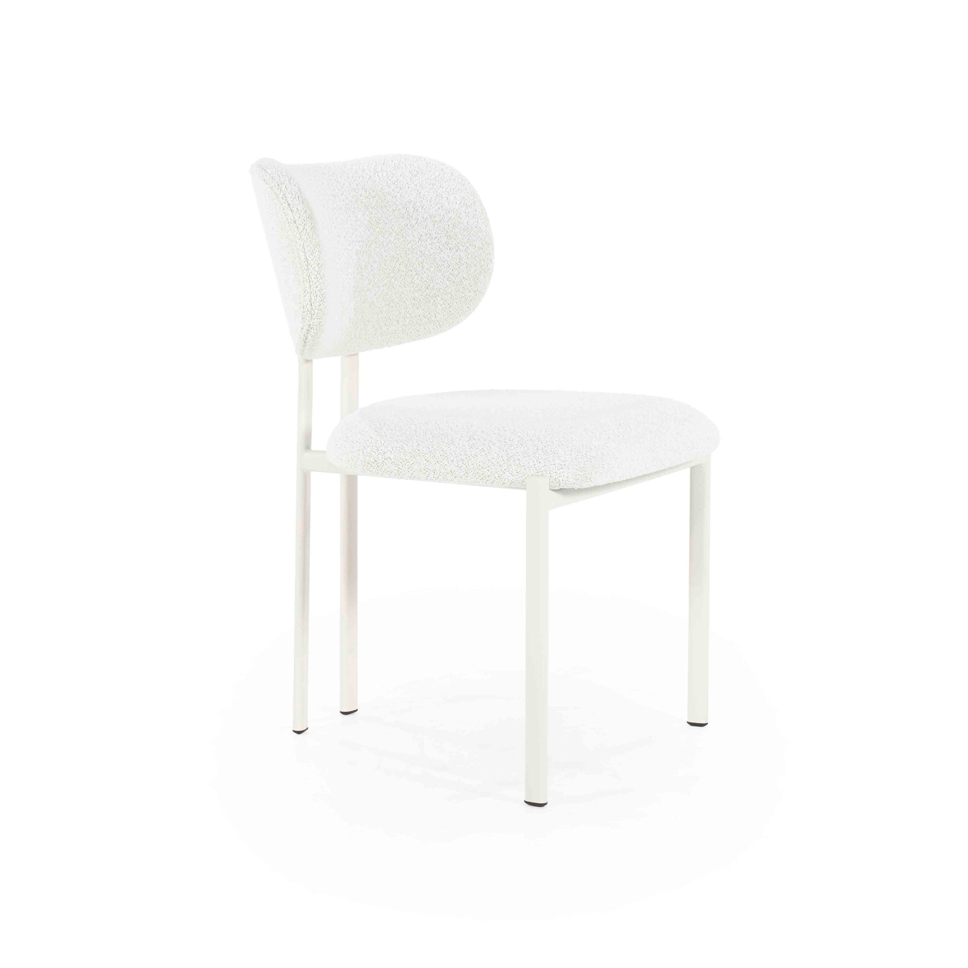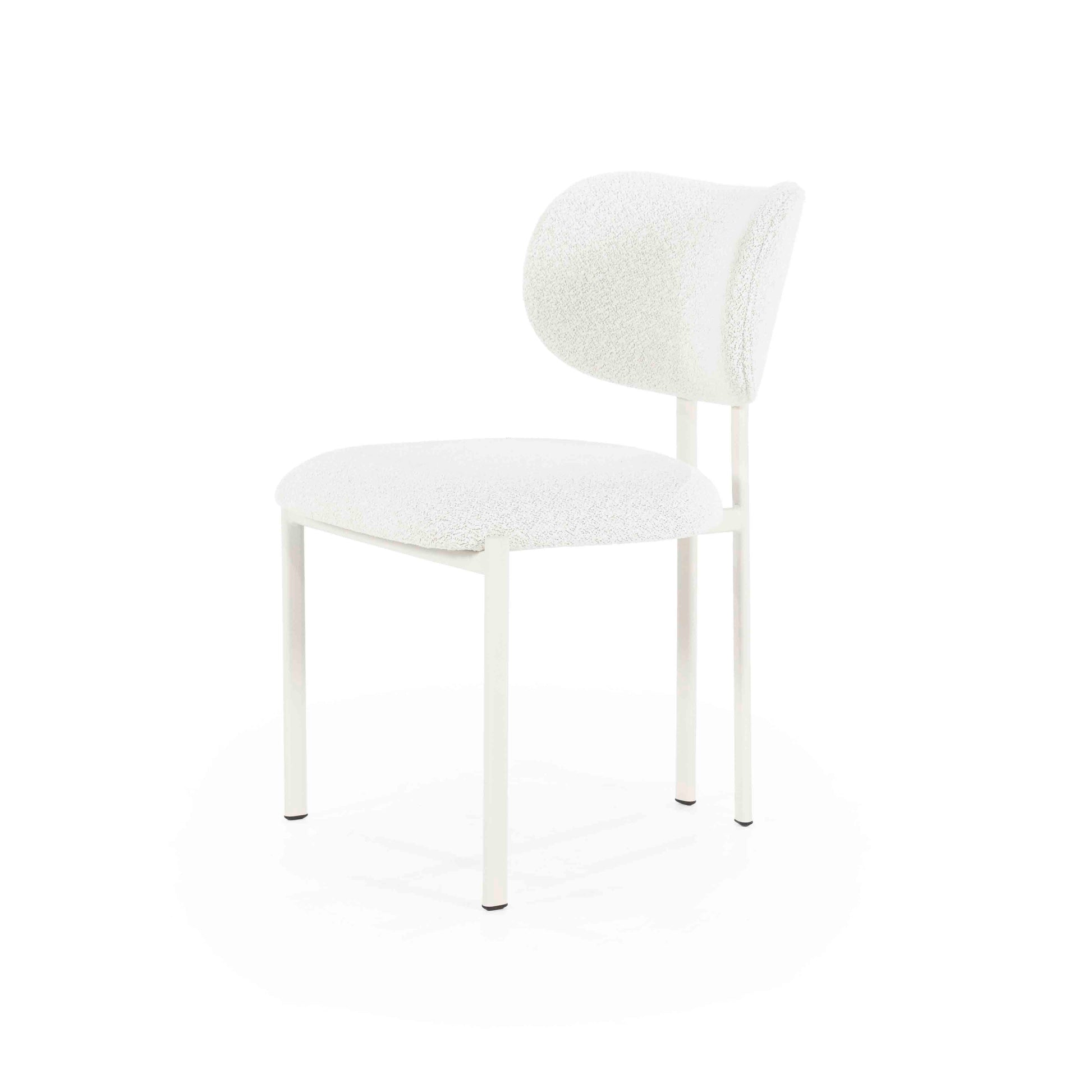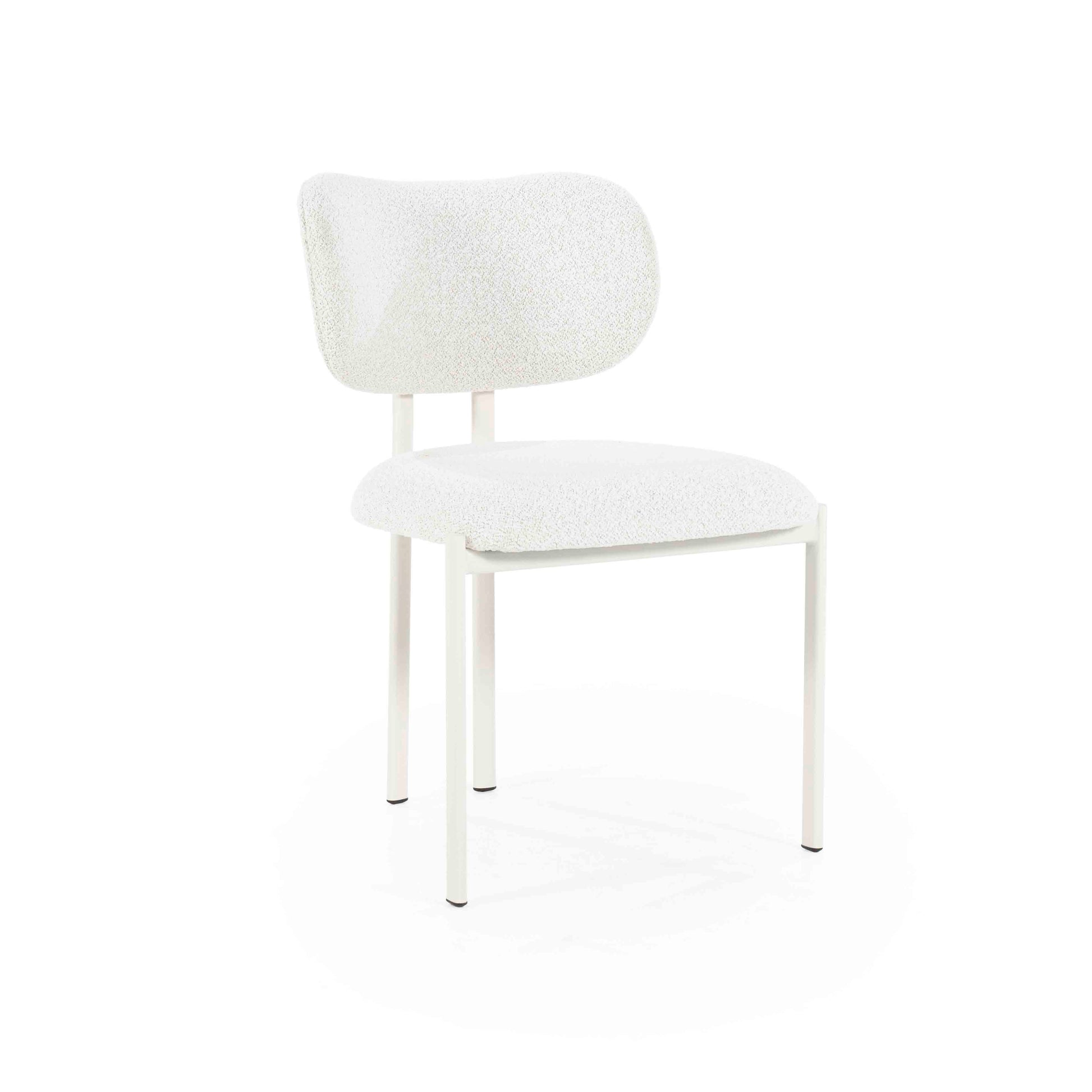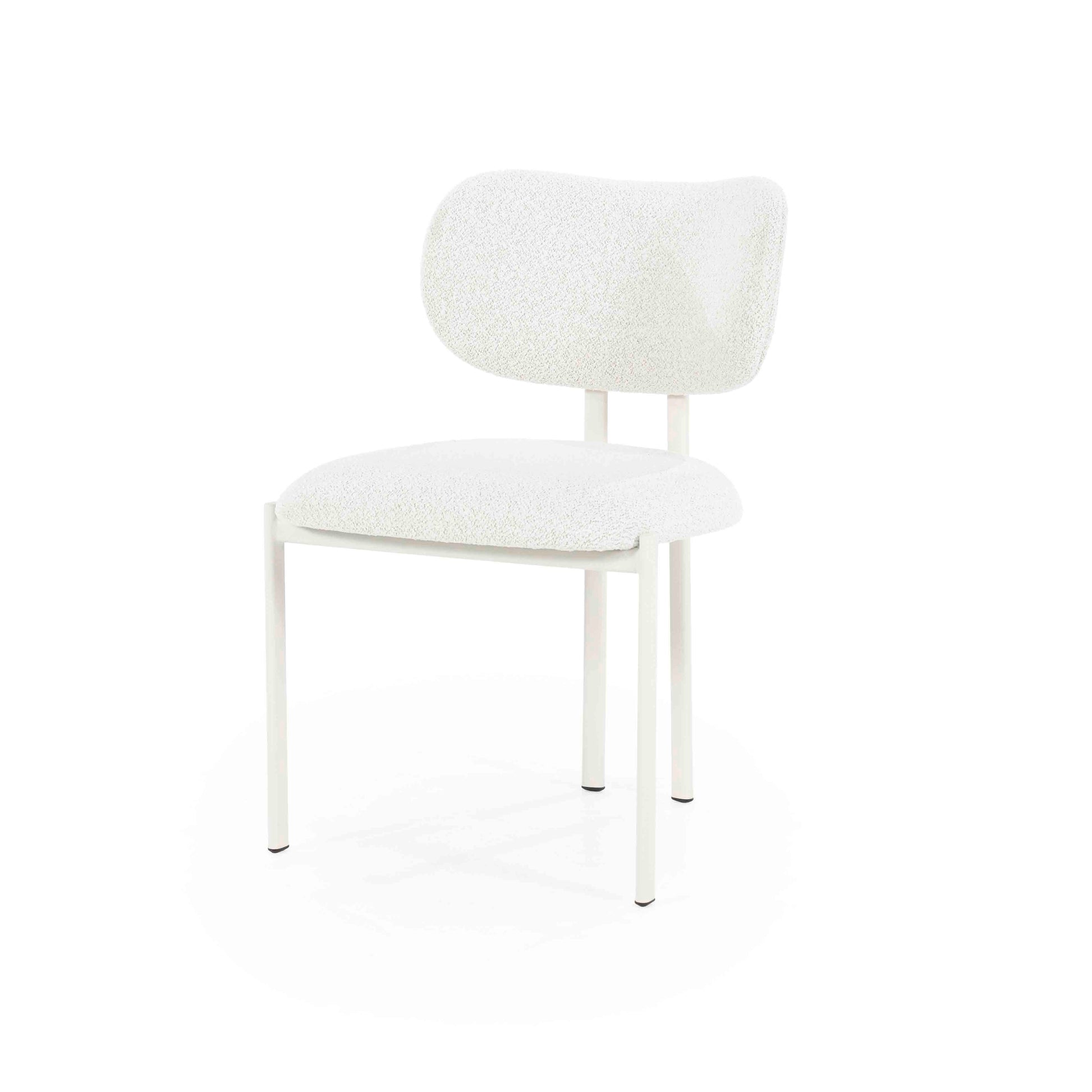 En elegant og luftig spisestol som kombinerer moderne linjer med myke detaljer. Den hvite metallrammen gir et lett uttrykk, mens det polstrede setet og ryggstøtten i myk bouclé tilfører varme og komfort. Et stilrent valg som passer perfekt i både nordiske og moderne hjem.