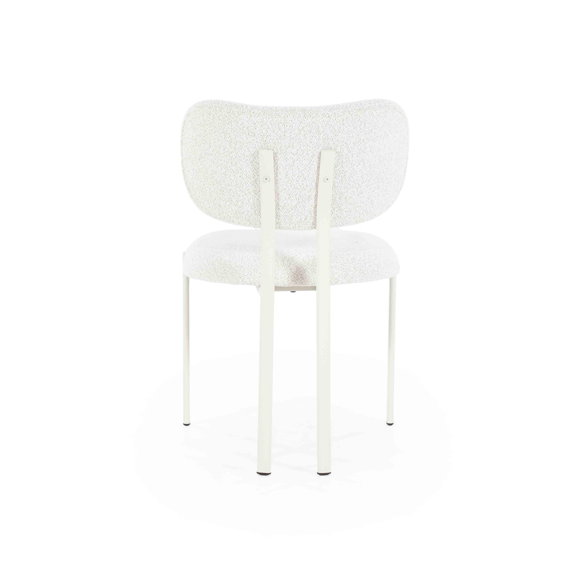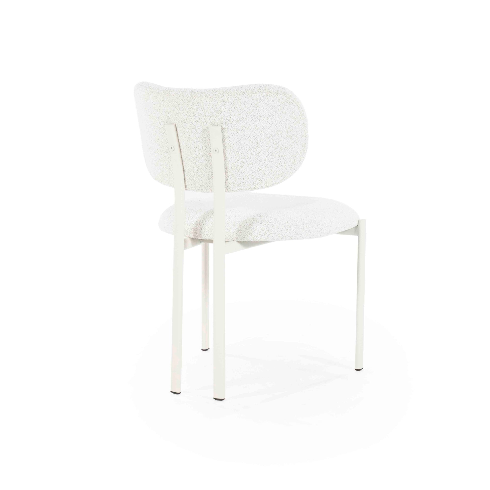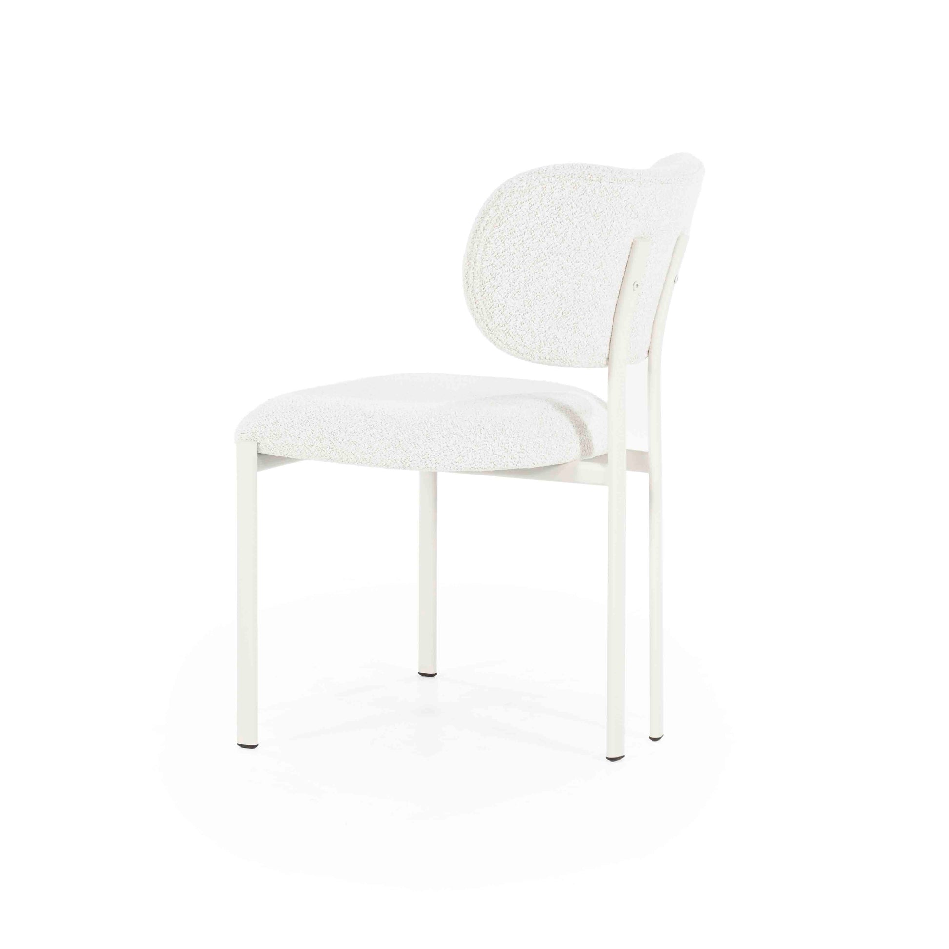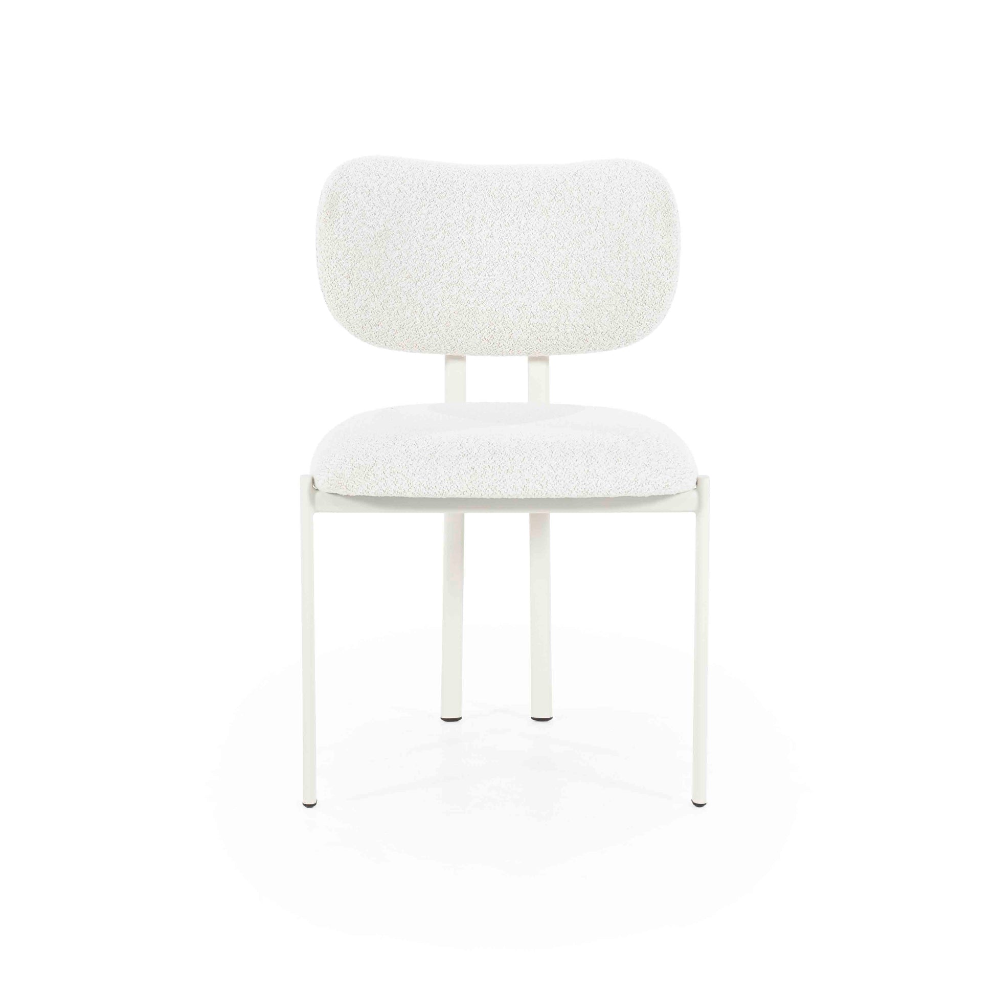 En elegant og luftig spisestol som kombinerer moderne linjer med myke detaljer. Den hvite metallrammen gir et lett uttrykk, mens det polstrede setet og ryggstøtten i myk bouclé tilfører varme og komfort. Et stilrent valg som passer perfekt i både nordiske og moderne hjem.