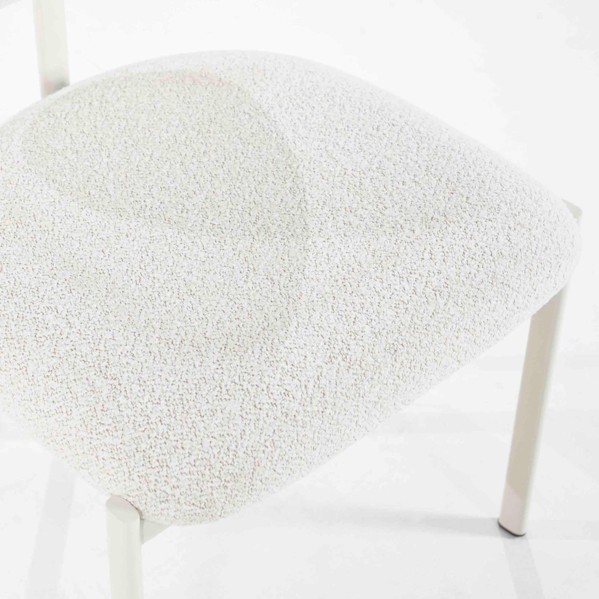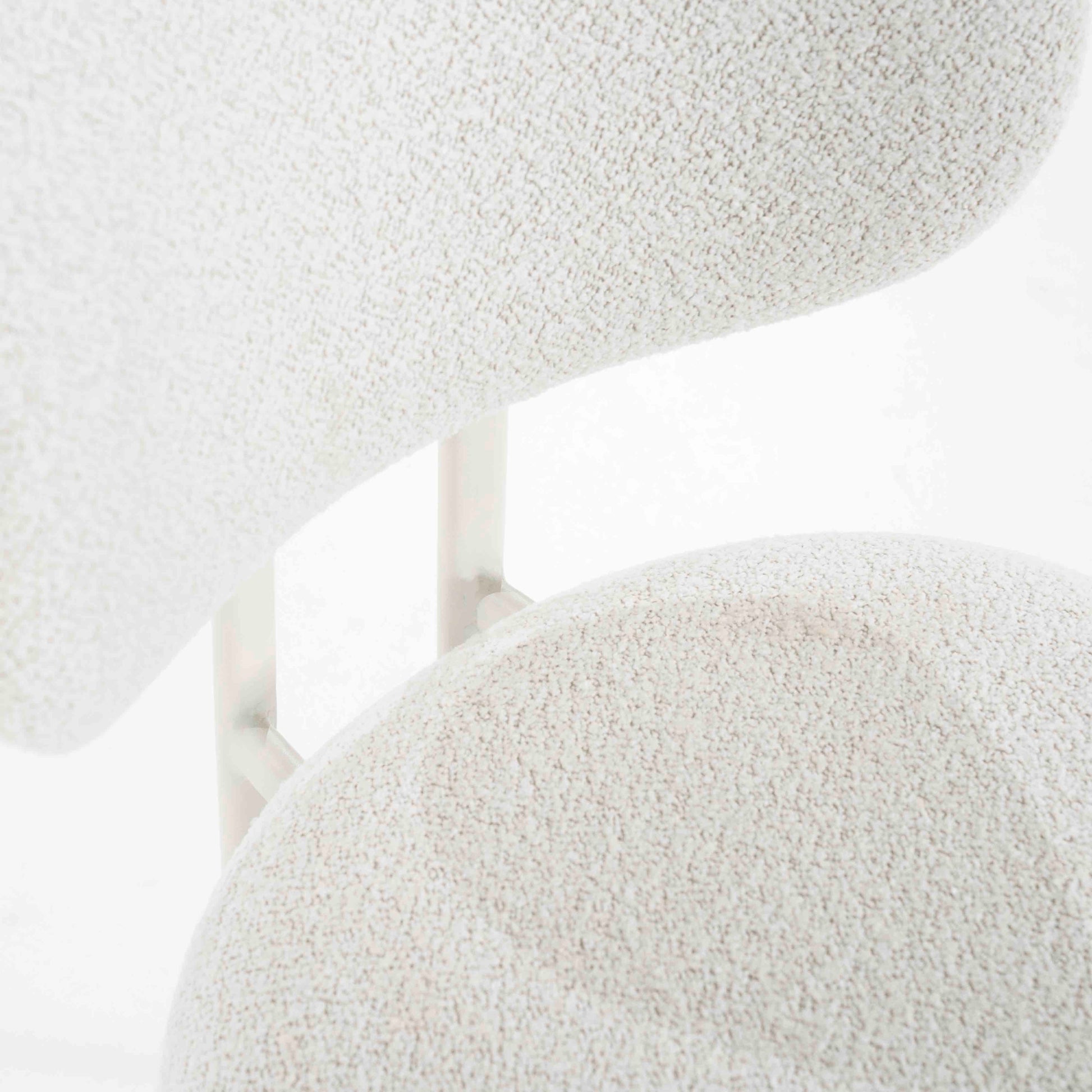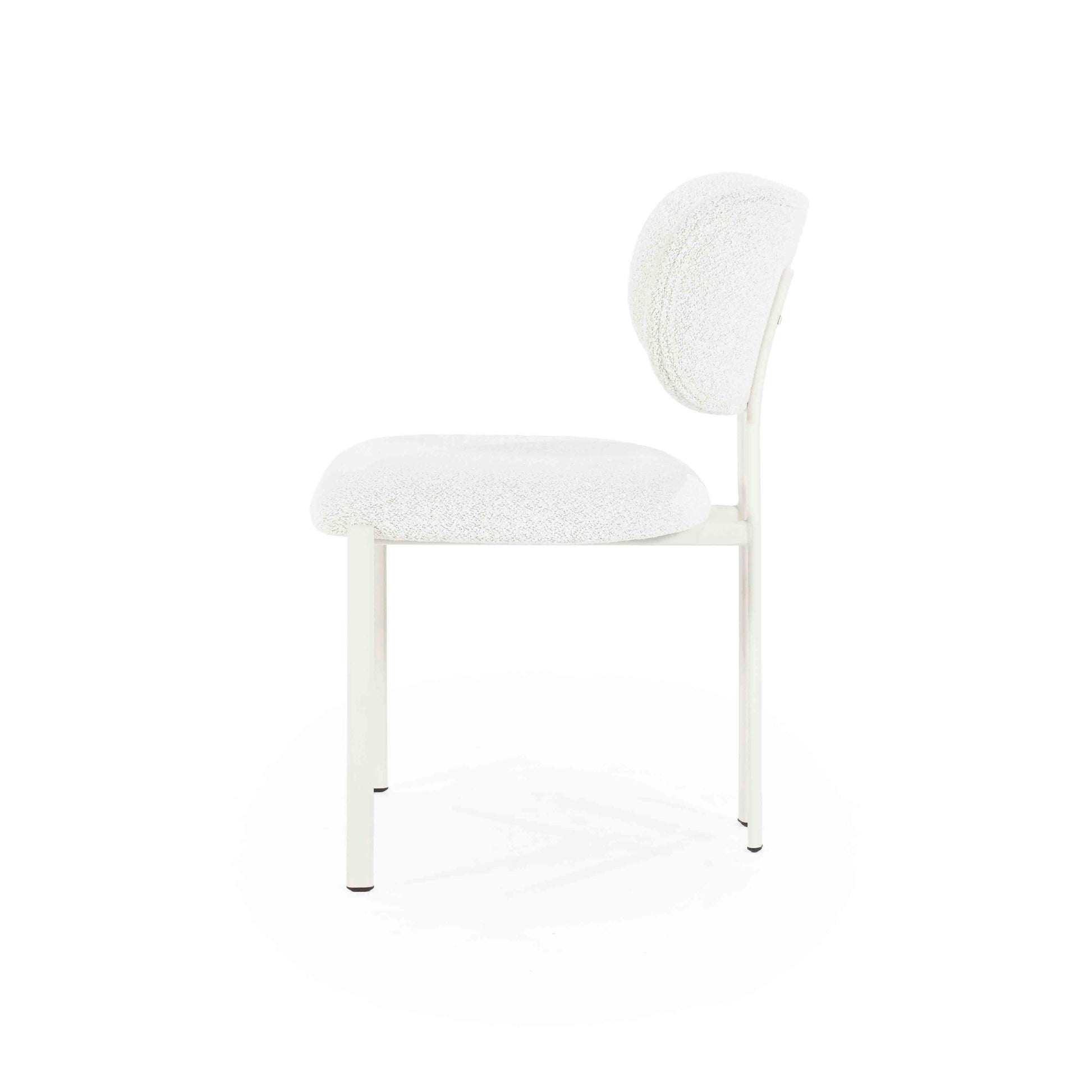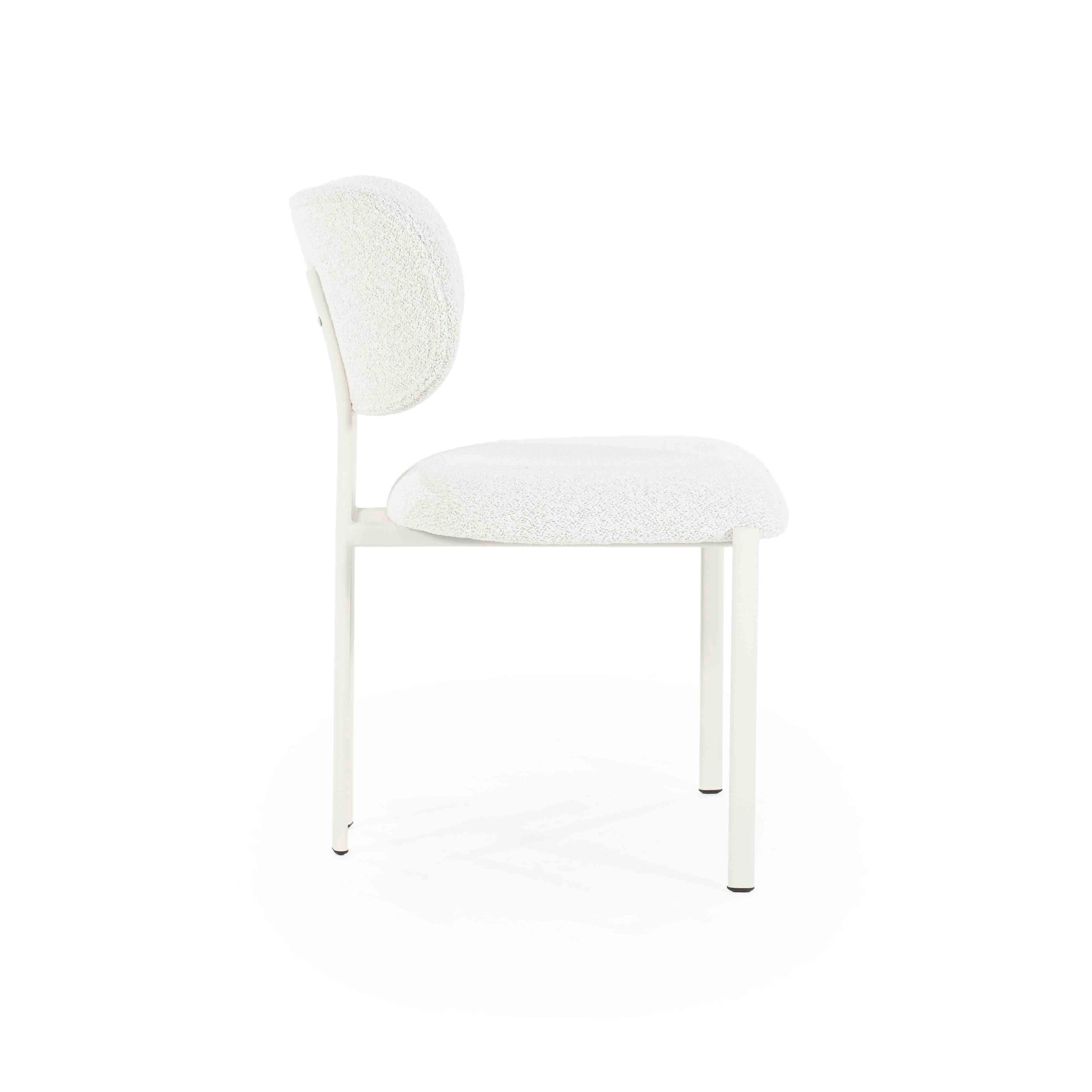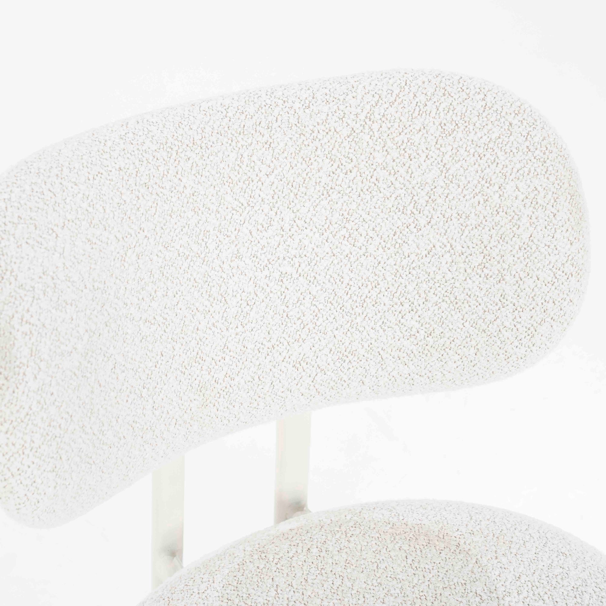 En elegant og luftig spisestol som kombinerer moderne linjer med myke detaljer. Den hvite metallrammen gir et lett uttrykk, mens det polstrede setet og ryggstøtten i myk bouclé tilfører varme og komfort. Et stilrent valg som passer perfekt i både nordiske og moderne hjem.