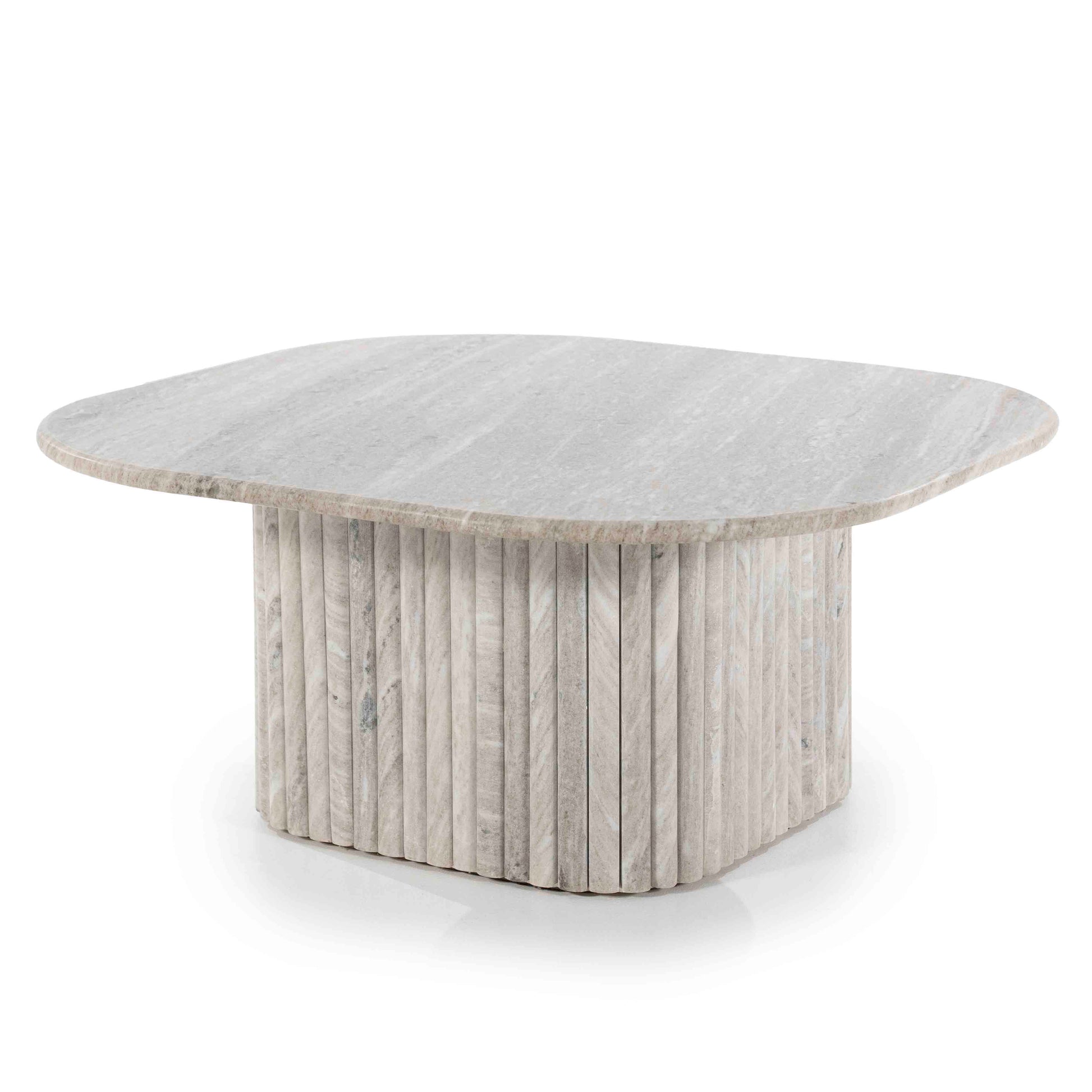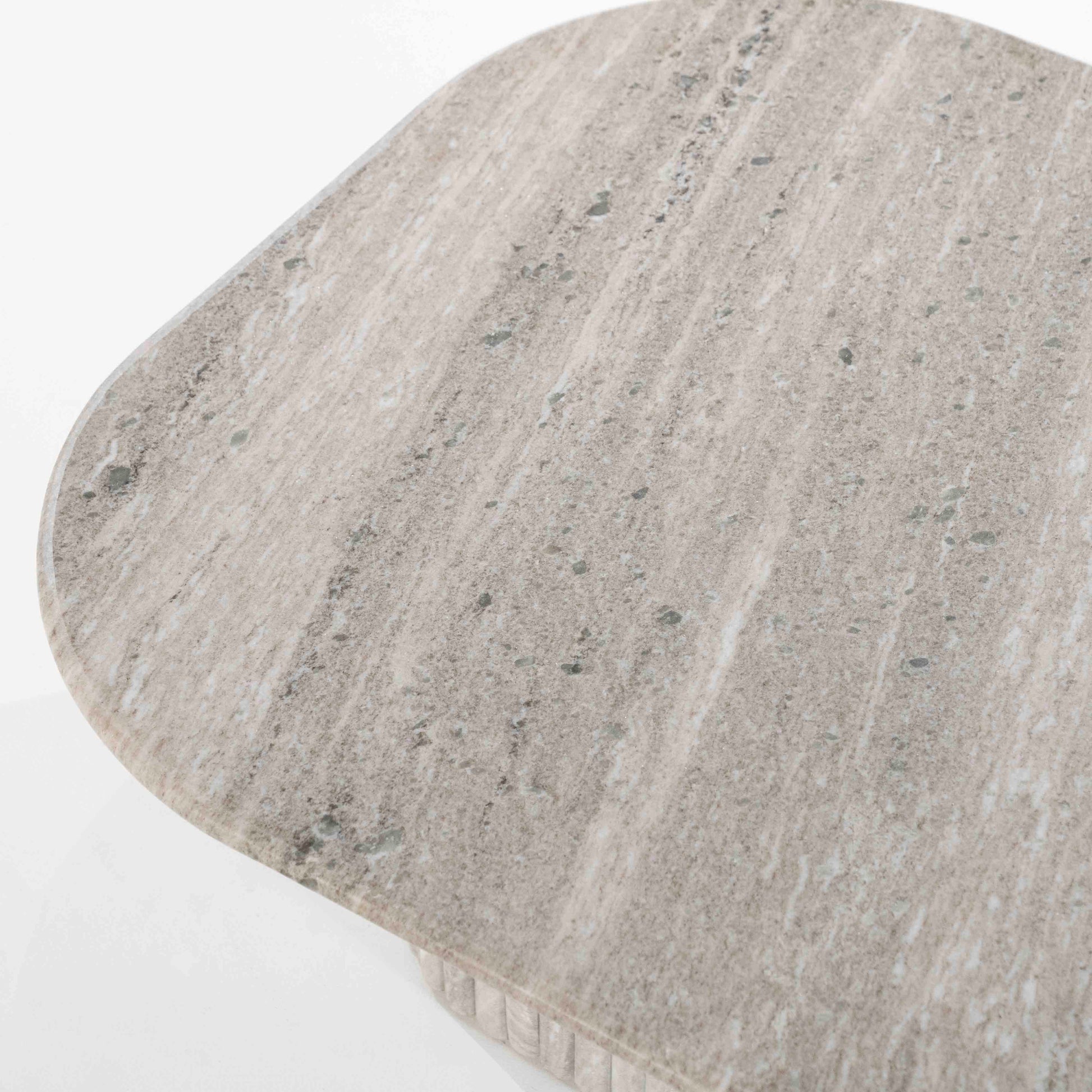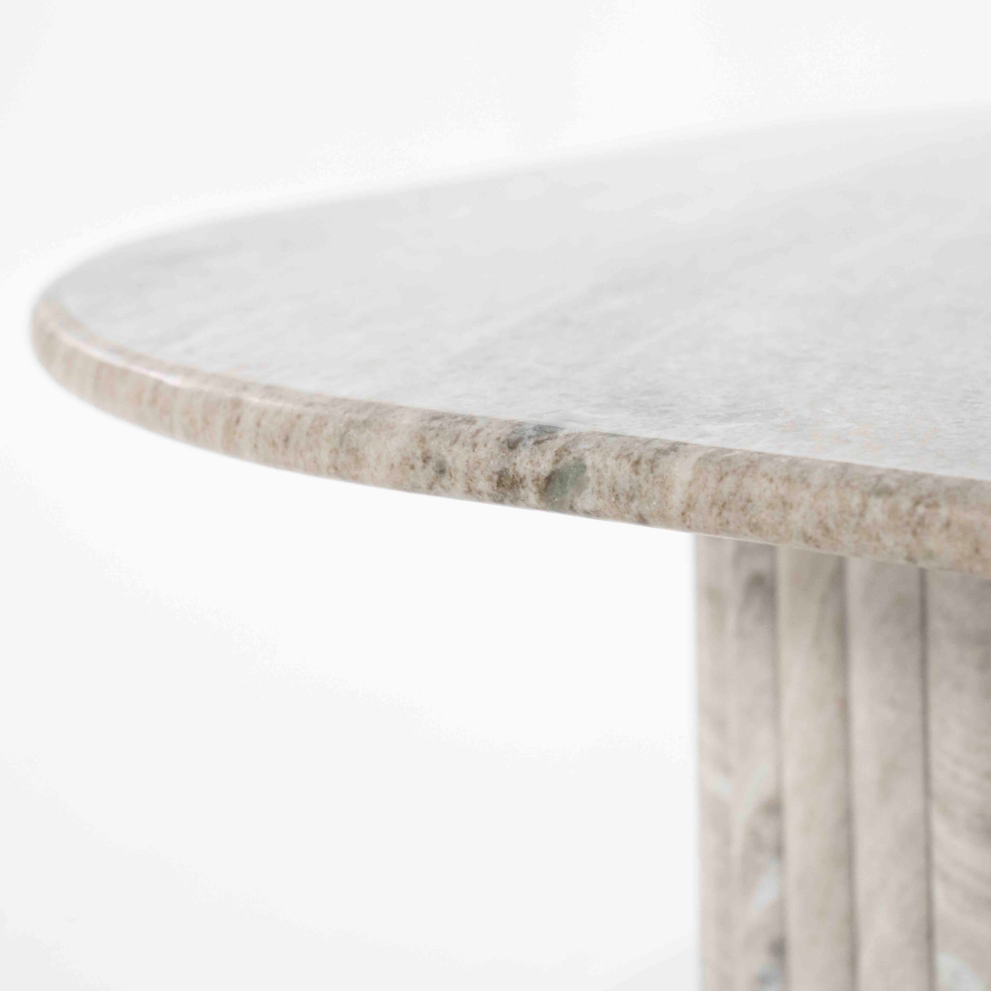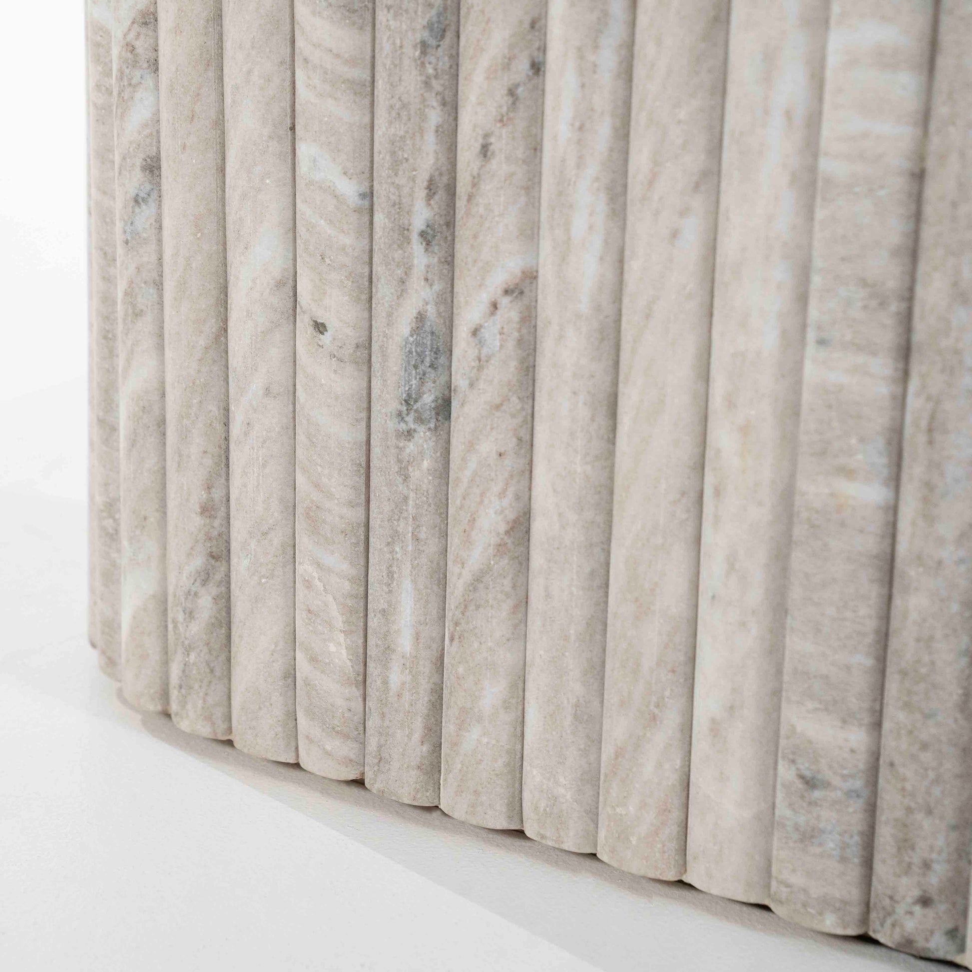 Et elegant sofabord utført i lys marmor med en avrundet rektangulær bordplate og en massiv søyleformet base. Den vertikale rillete strukturen i underdelen gir bordet et arkitektonisk og sofistikert preg, mens den myke overflaten og avrundede kantene skaper et harmonisk uttrykk. Dette bordet kombinerer skulpturell design med funksjonalitet og tilfører rommet et luksuriøst, tidløst preg.