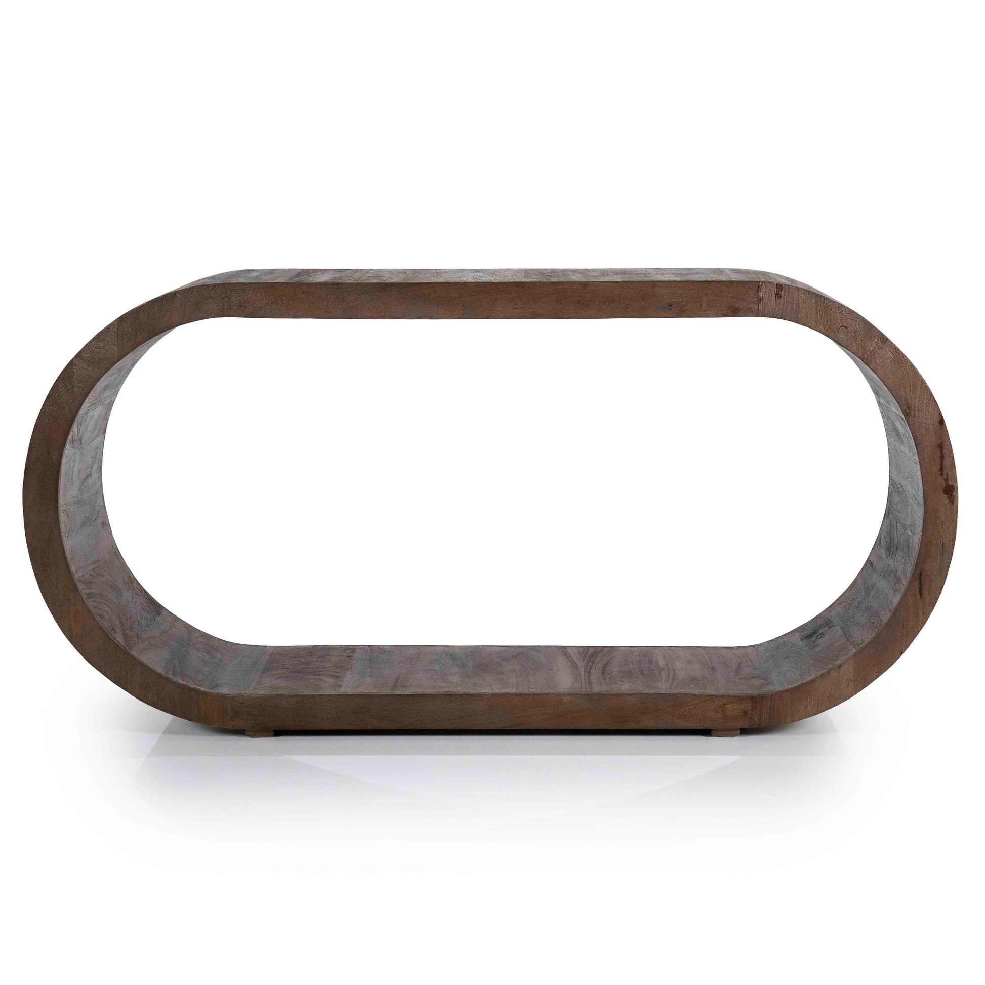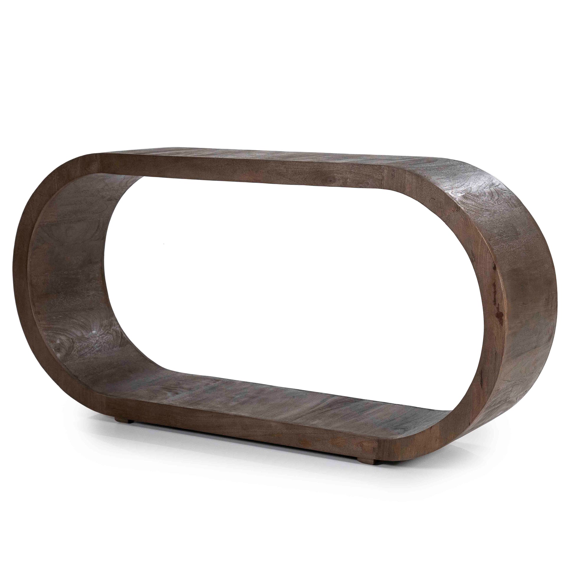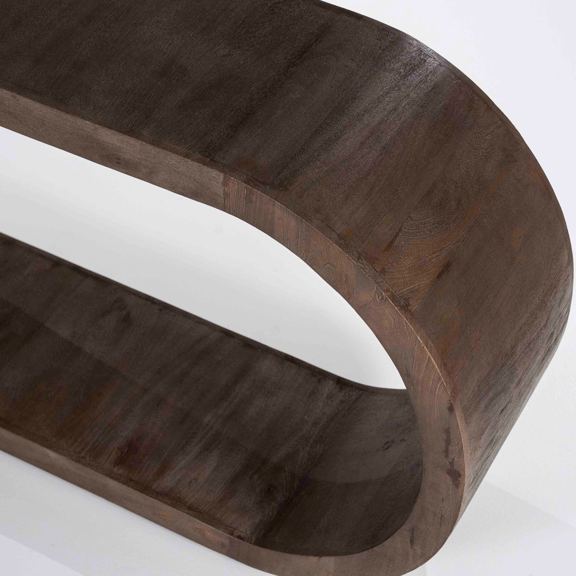 Et moderne konsollbord med myke linjer og solid konstruksjon i massivt mørkt tre. Bordets åpne form gir et lett og luftig uttrykk, samtidig som det fremhever materialets naturlige tekstur. De avrundede hjørnene og den kontinuerlige silhuetten gir et harmonisk, organisk preg som passer både i moderne og klassiske interiør.