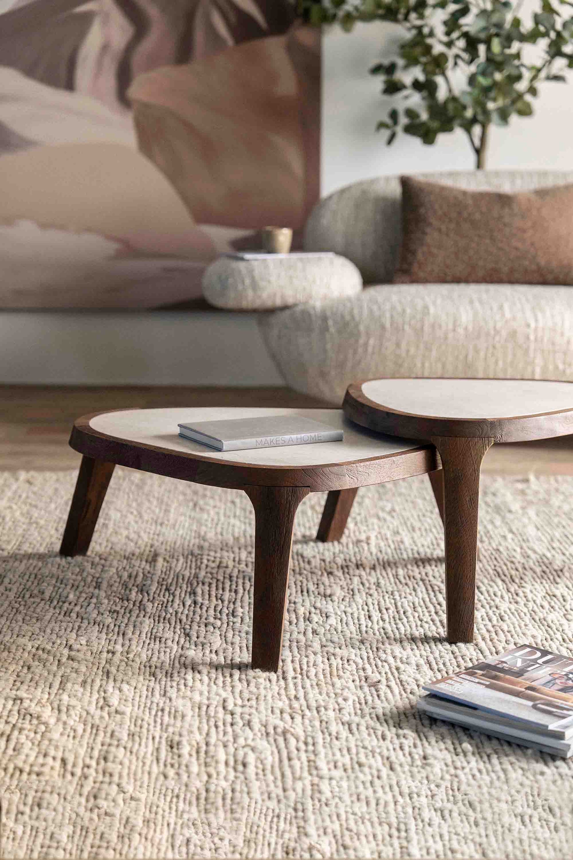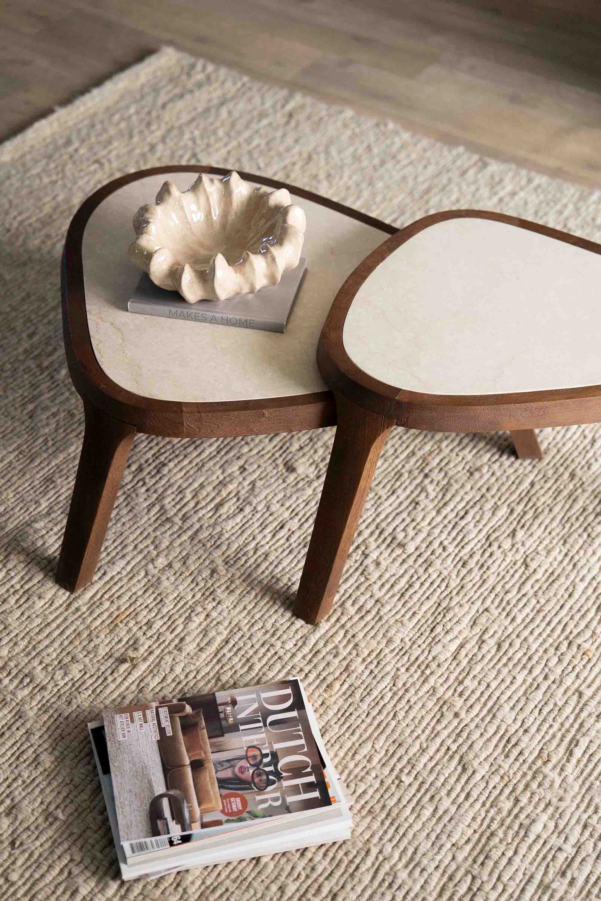 Et lavt og elegant sofabord med myke, avrundede former inspirert av naturens organiske linjer.
