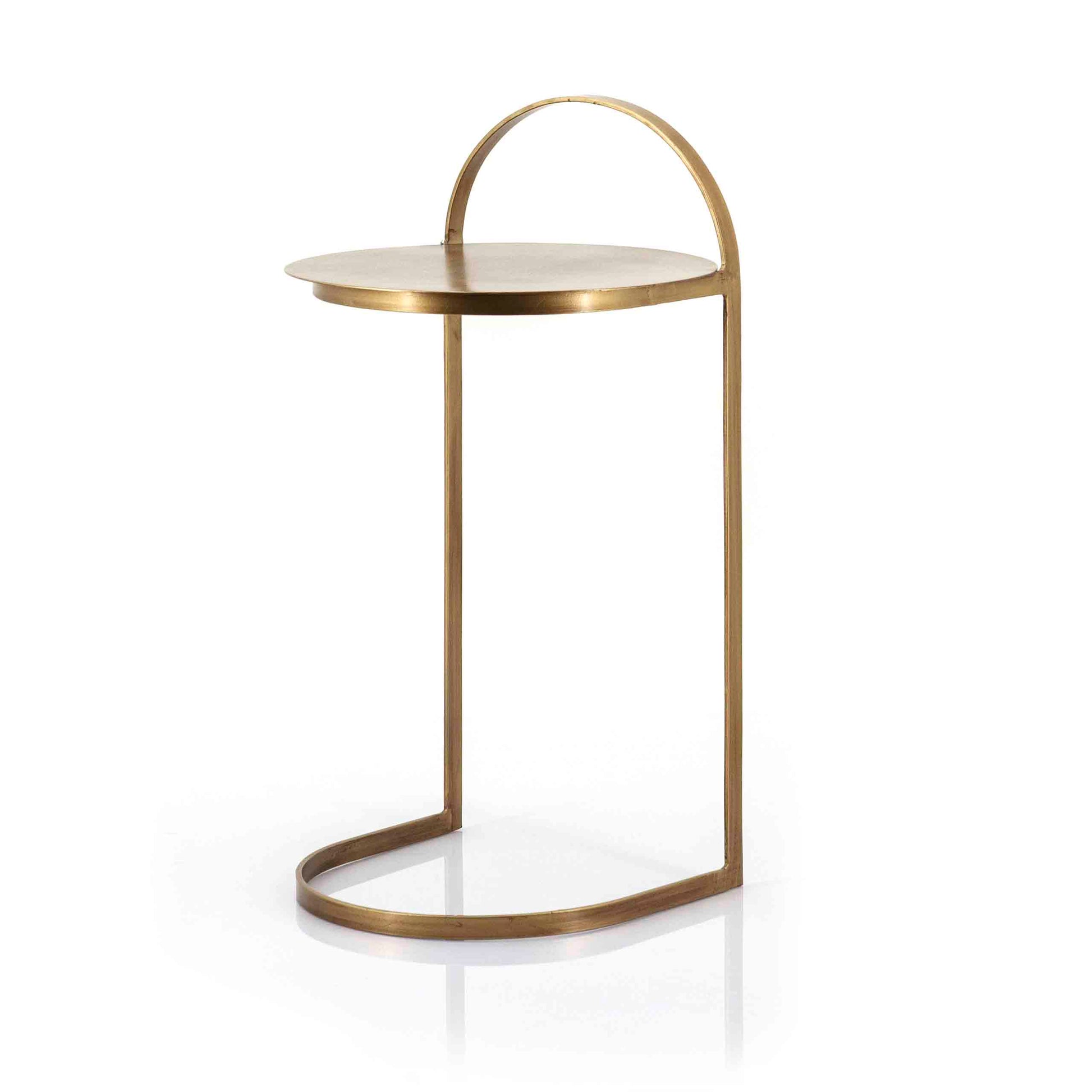 Et skulpturelt sidebord med lett og luftig form. Bordet har en buet base og en tynn bordplate i messingfarget metall, som gir et raffinert og moderne uttrykk. Perfekt som avlastningsbord ved sofaen eller som et dekorativt element i stuen.