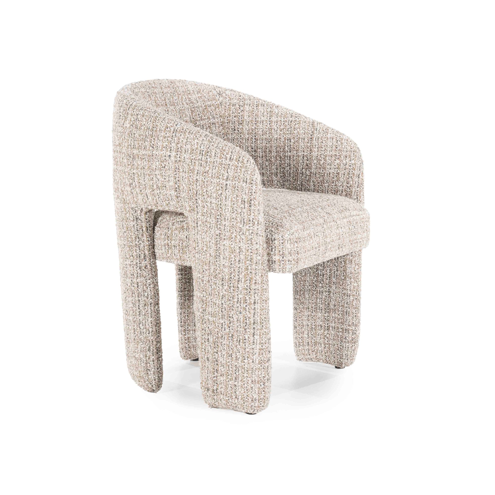 En elegant og iøynefallende spisestol trukket i myk bouclé, som kombinerer skulpturell form med høy komfort. Den buede ryggen og de polstrede flatene gir god støtte og en lun følelse rundt spisebordet. Et moderne design som tilfører både stil og karakter til rommet.