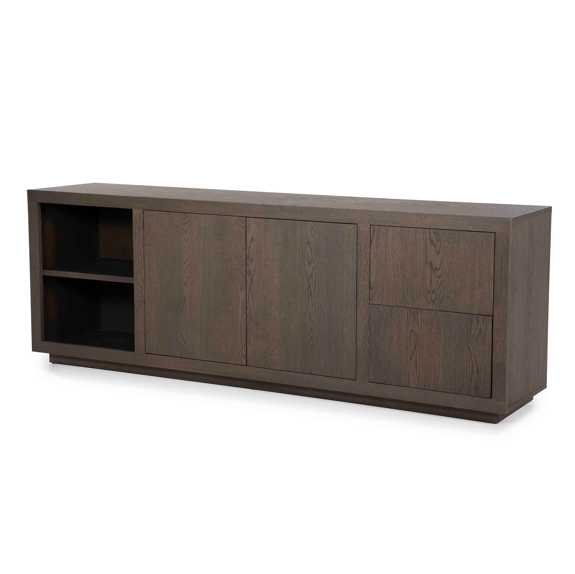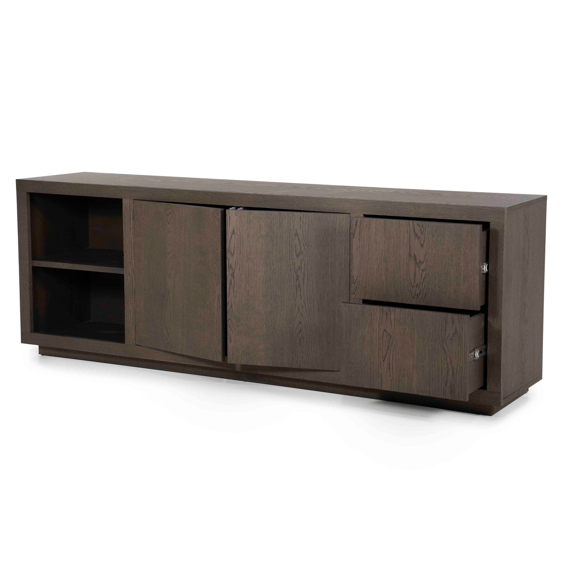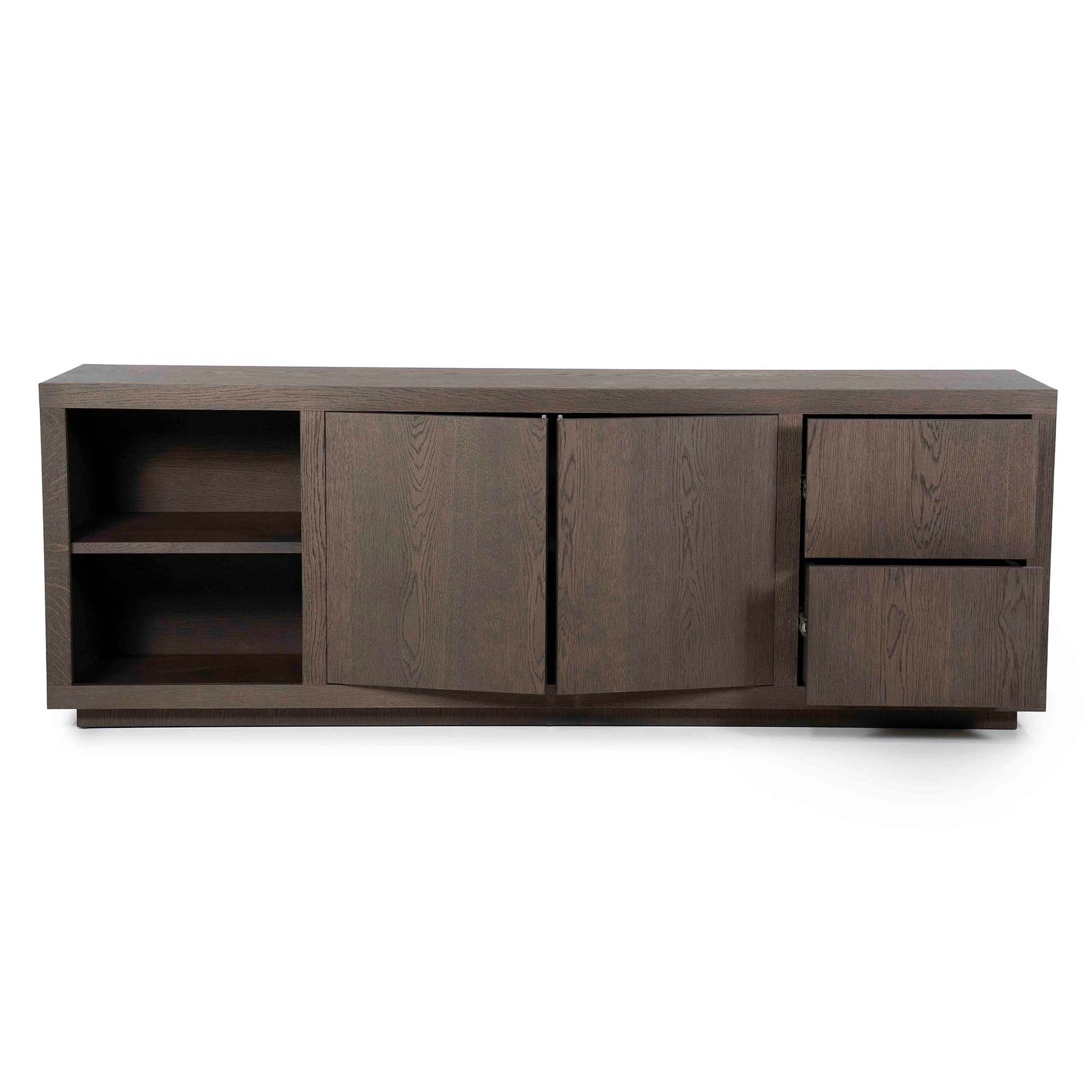 Skjenken har en funksjonell inndeling med to åpne hyller, skap med dører og to skuffer – ideell for oppbevaring av servise, bøker, elektronikk eller interiørdetaljer du ønsker å fremheve. De rene linjene og håndtaksløse dørene skaper et stilrent og harmonisk uttrykk.