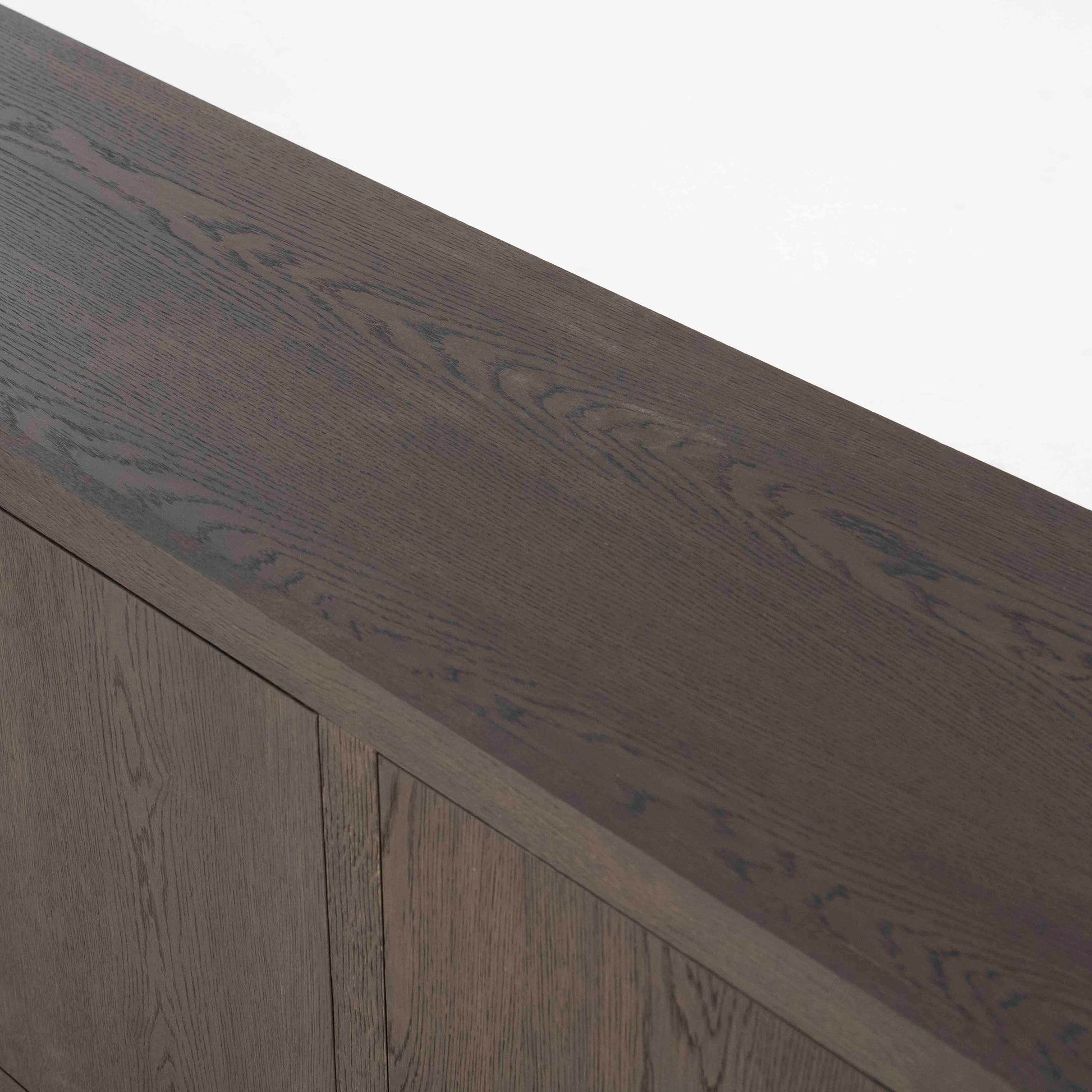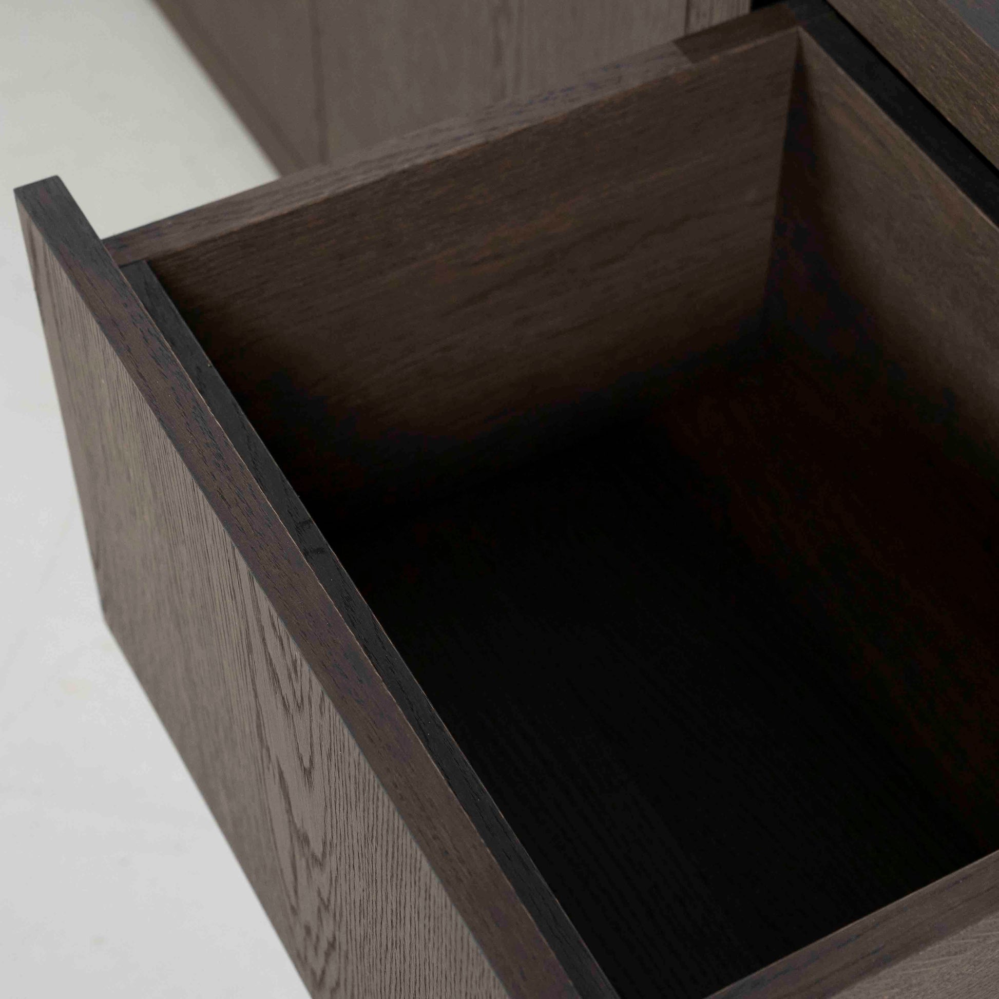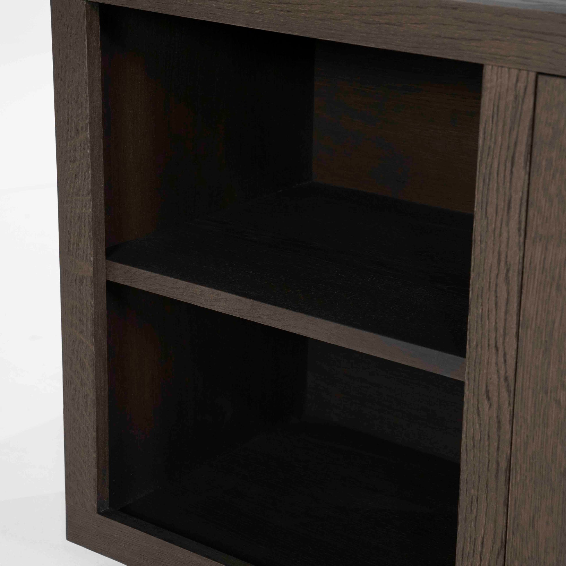 Denne skjenken kombinerer moderne minimalisme med tidløs eleganse. Utført i sort eikefinér, gir den et sofistikert uttrykk som passer perfekt i både moderne og klassiske interiører. Den mørke overflaten fremhever treets naturlige struktur og tilfører dybde og eksklusivitet til rommet.
