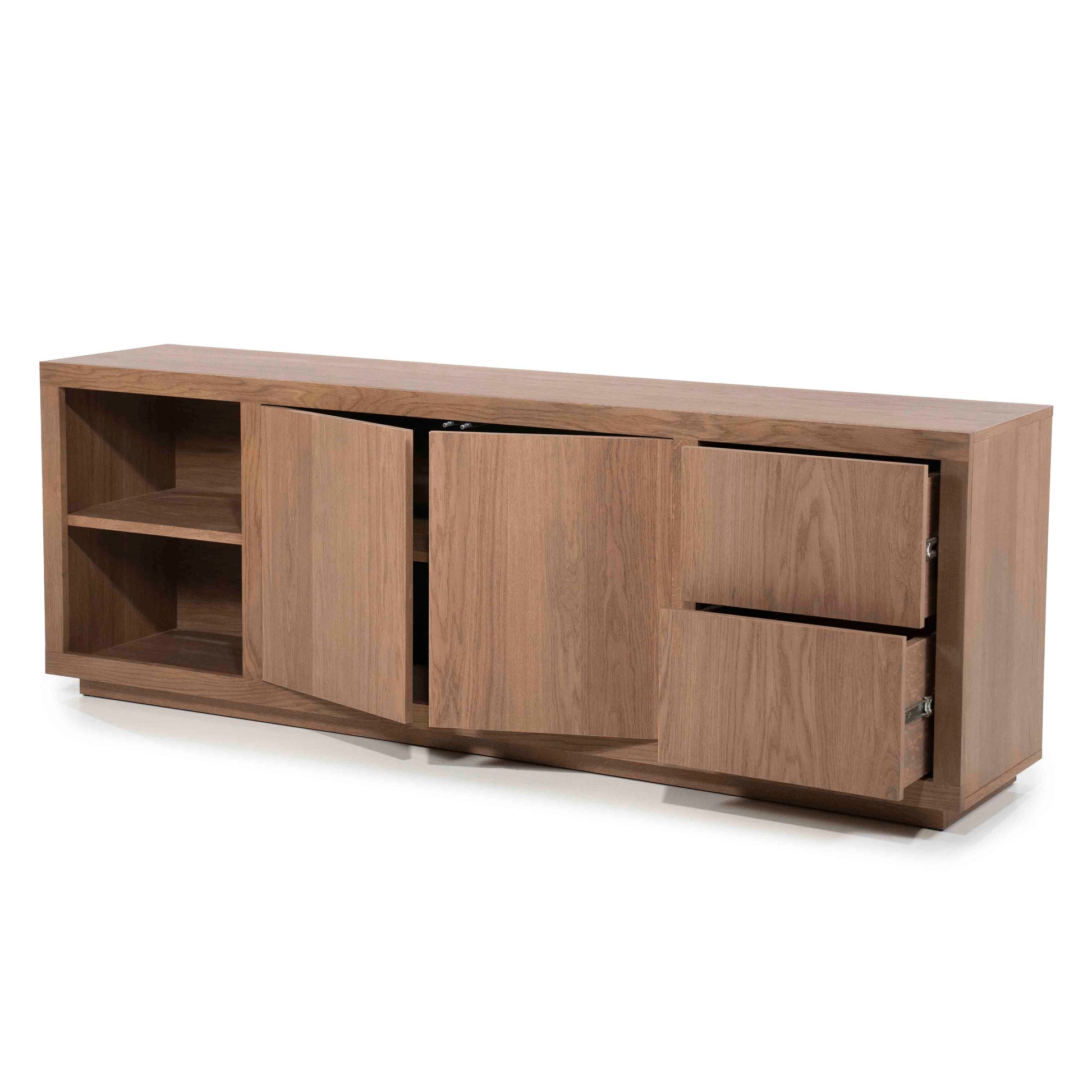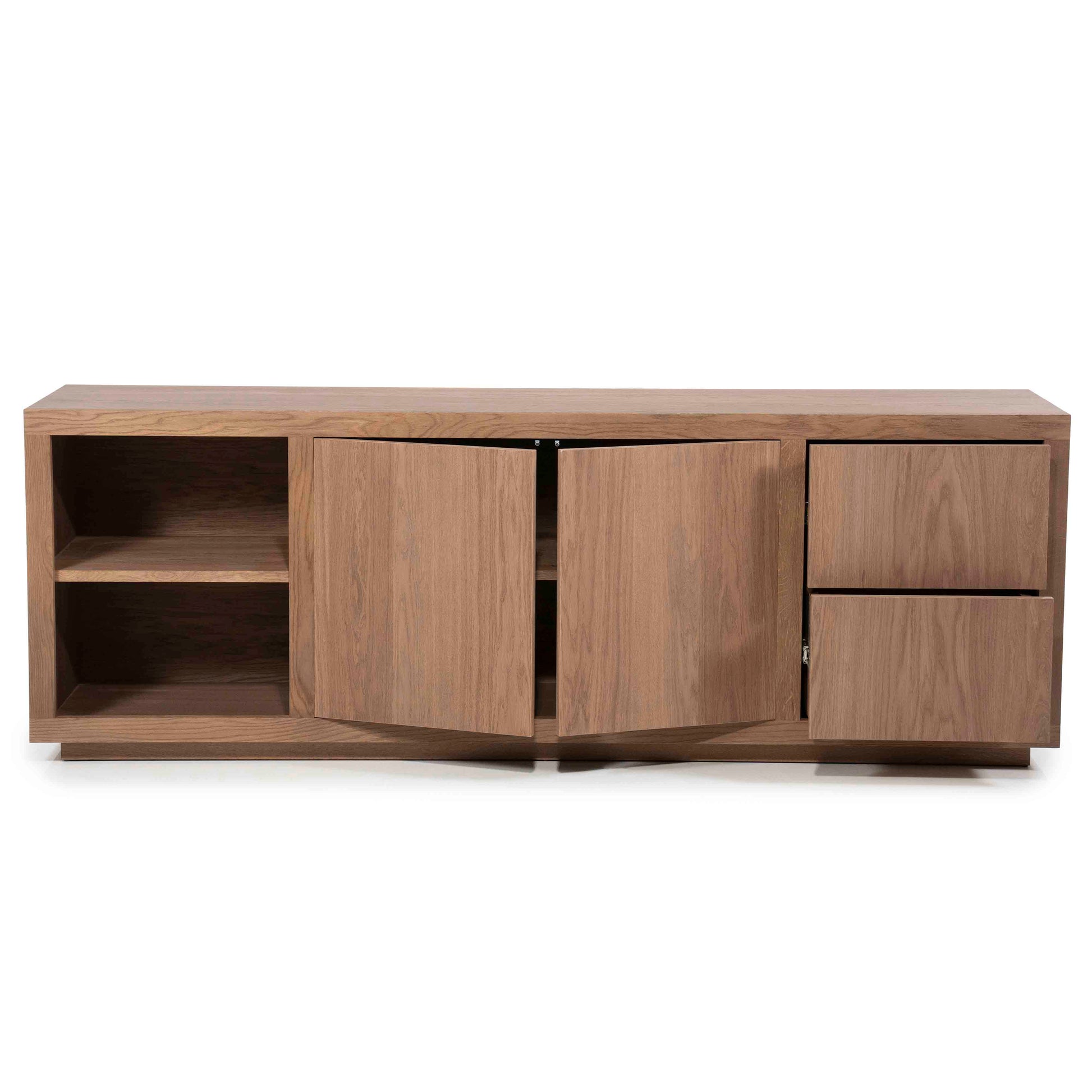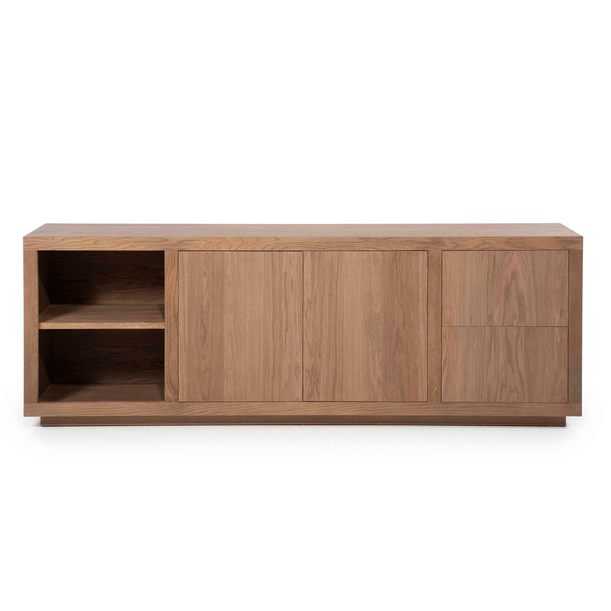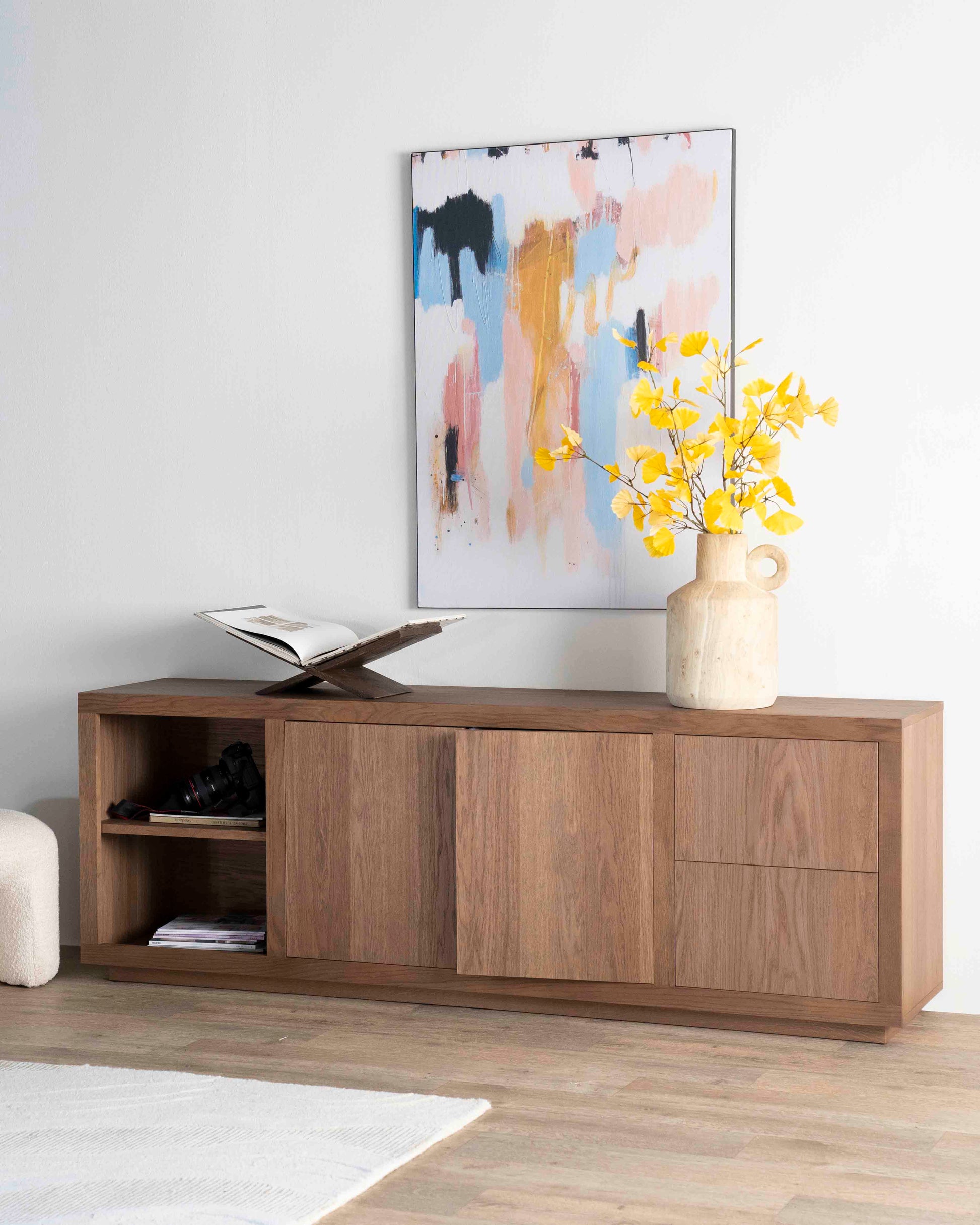 Gi stuen din et stilrent og harmonisk uttrykk med denne moderne TV-benken/skjenk i lyst treverk. Med sitt minimalistiske design og rene linjer passer den perfekt inn i både moderne og skandinaviske interiørstiler. Den solide konstruksjonen og den naturlige trestrukturen gir møbelet et eksklusivt og tidløst preg.