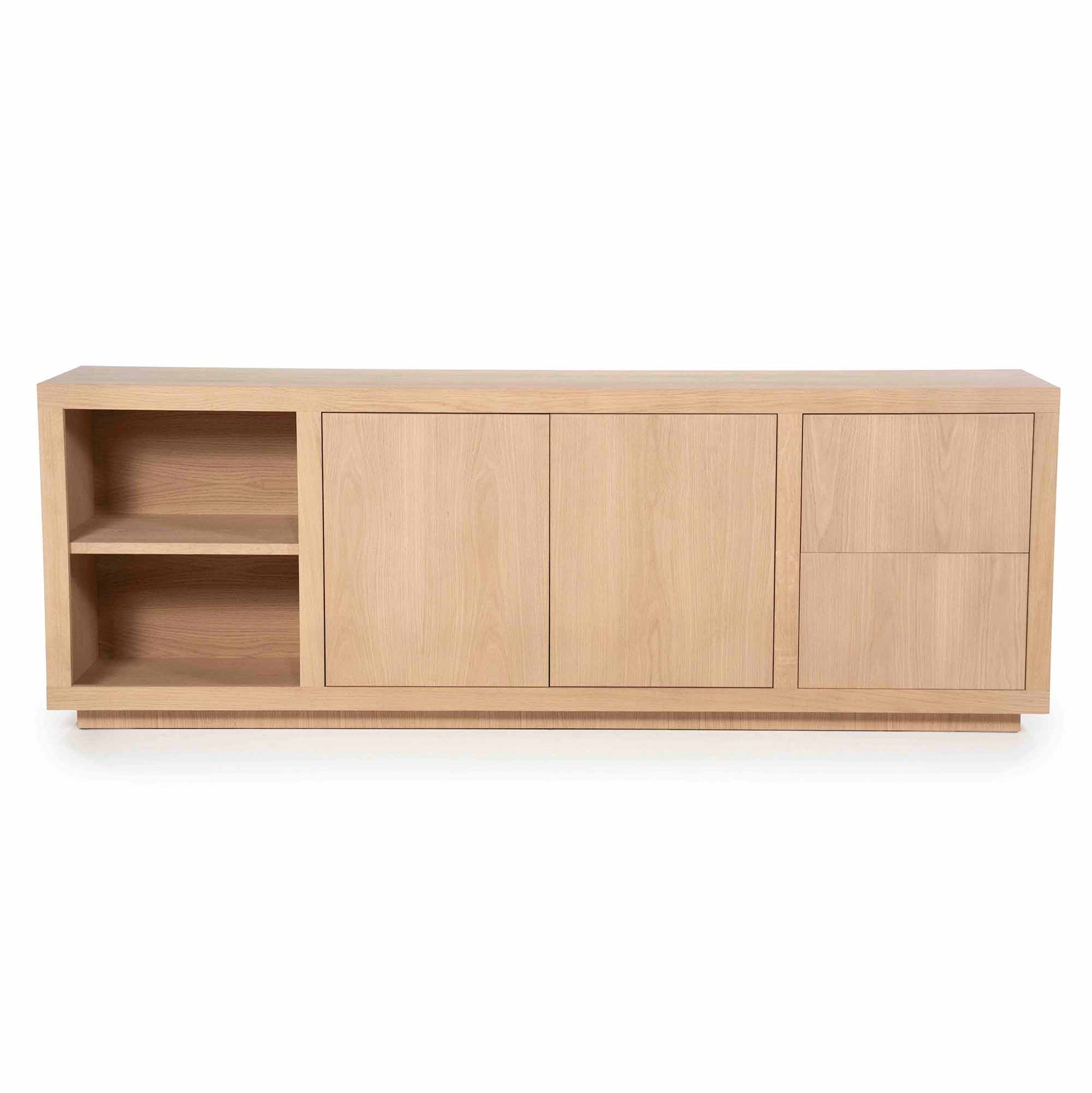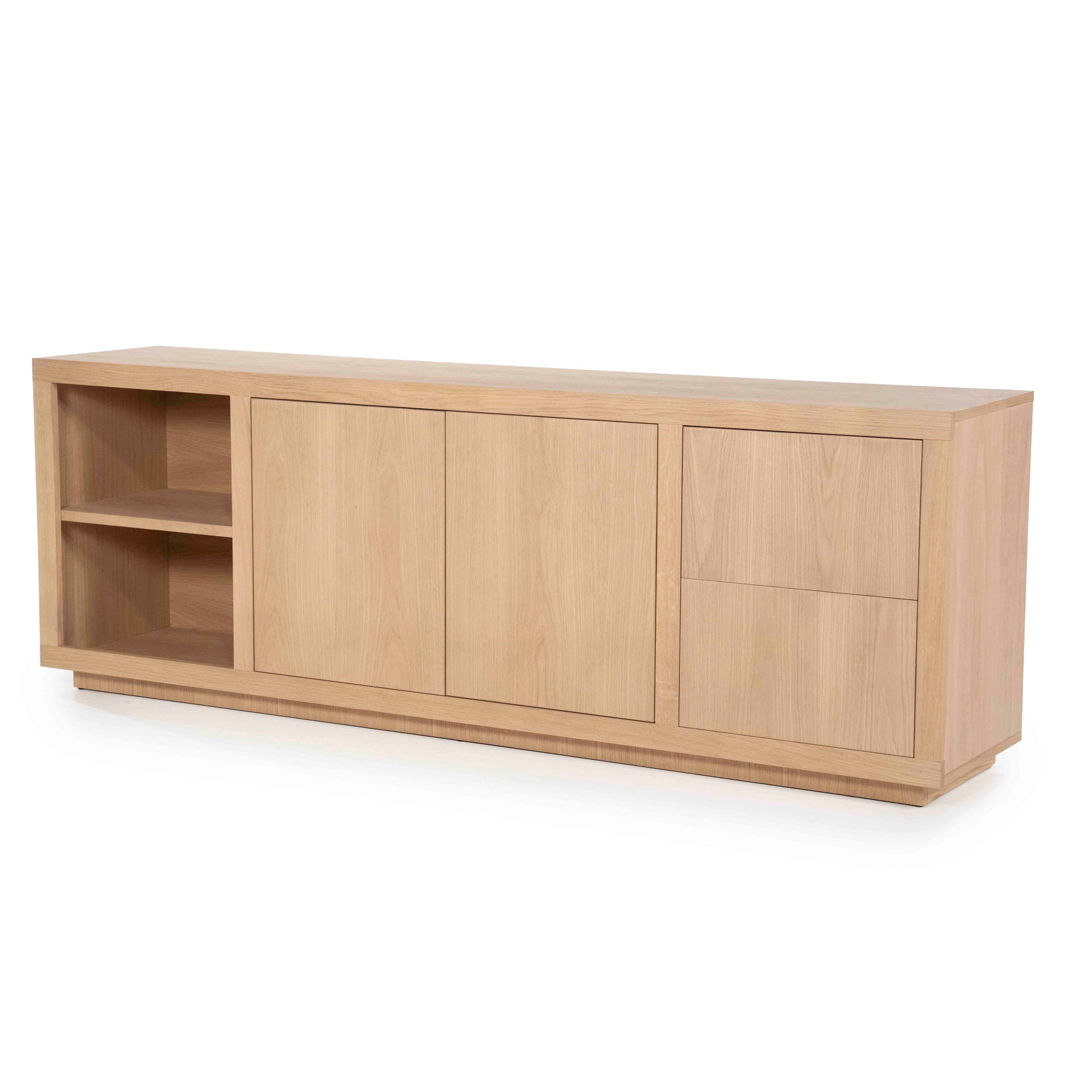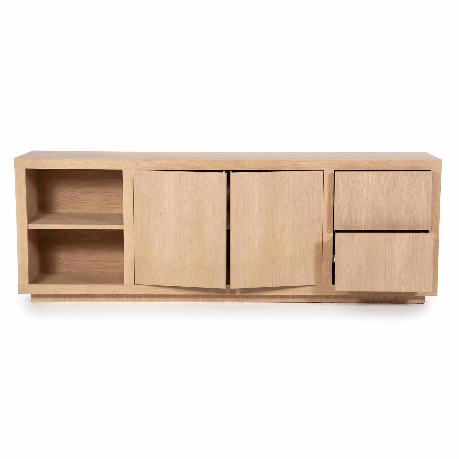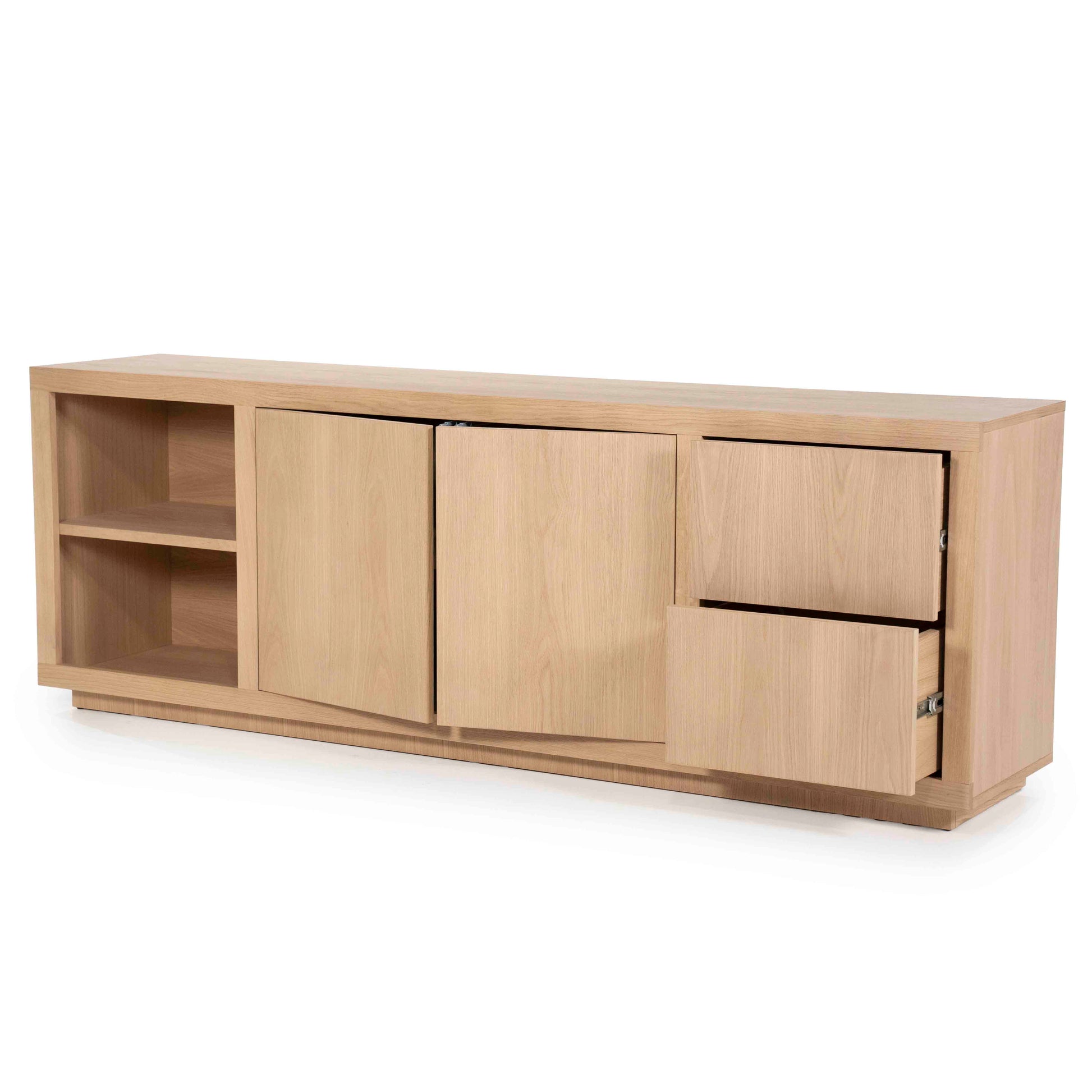 Skjenken har en funksjonell inndeling med både åpne hyller og skap med dører – ideell for oppbevaring av servise, bøker, elektronikk eller interiørdetaljer du ønsker å fremheve. De rene linjene og håndtaksløse dørene skaper et stilrent og harmonisk uttrykk.