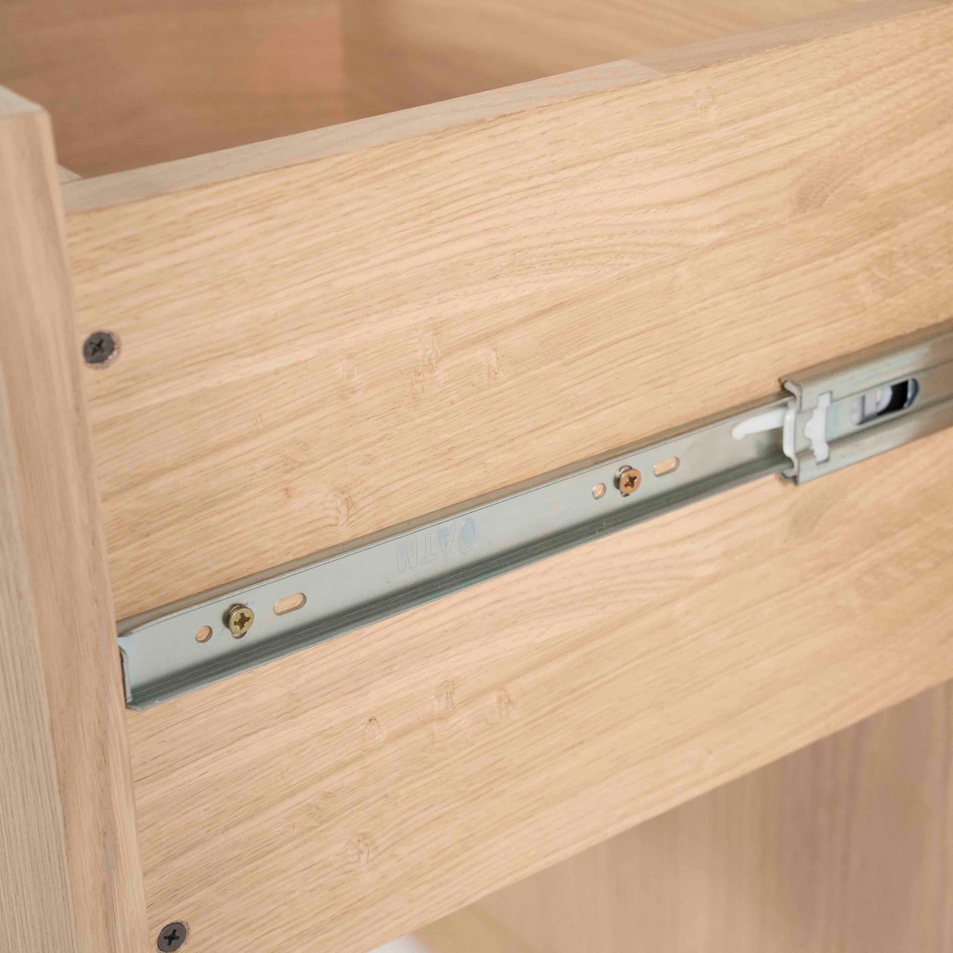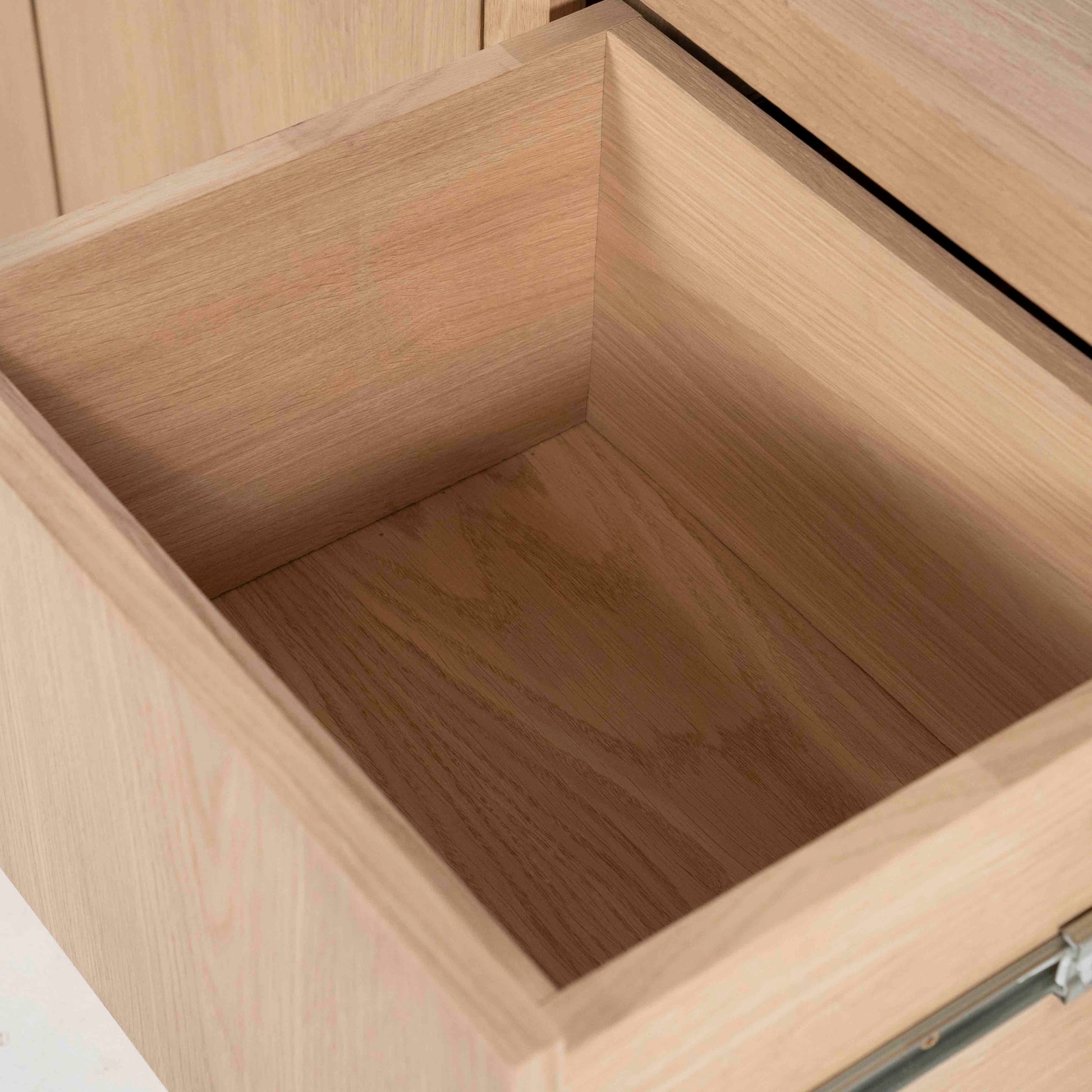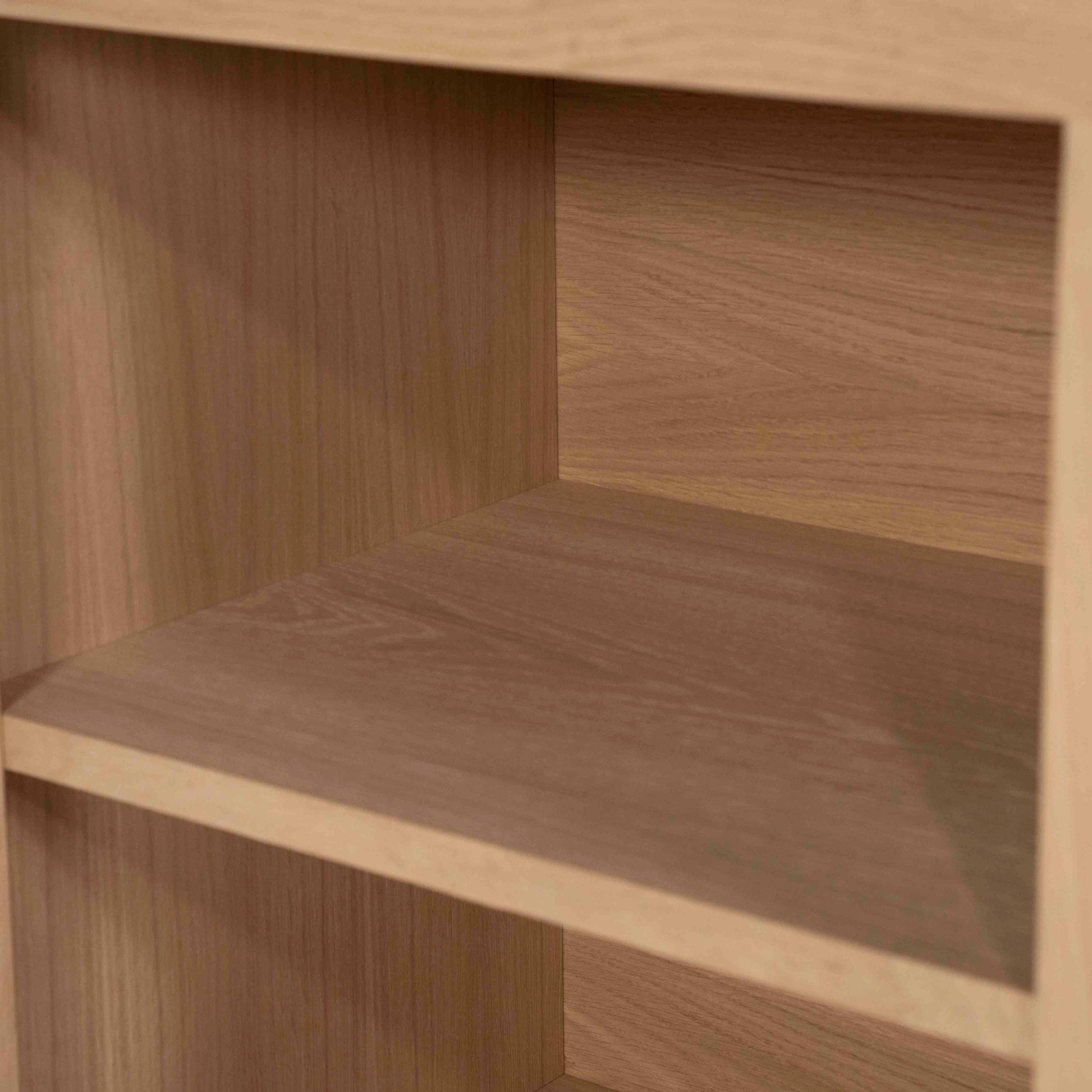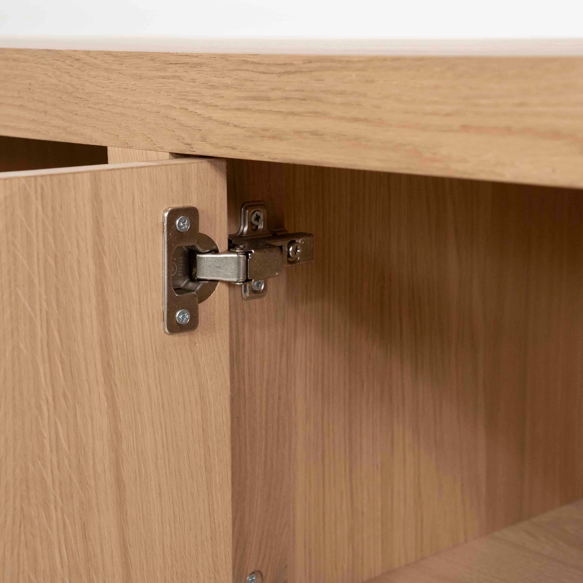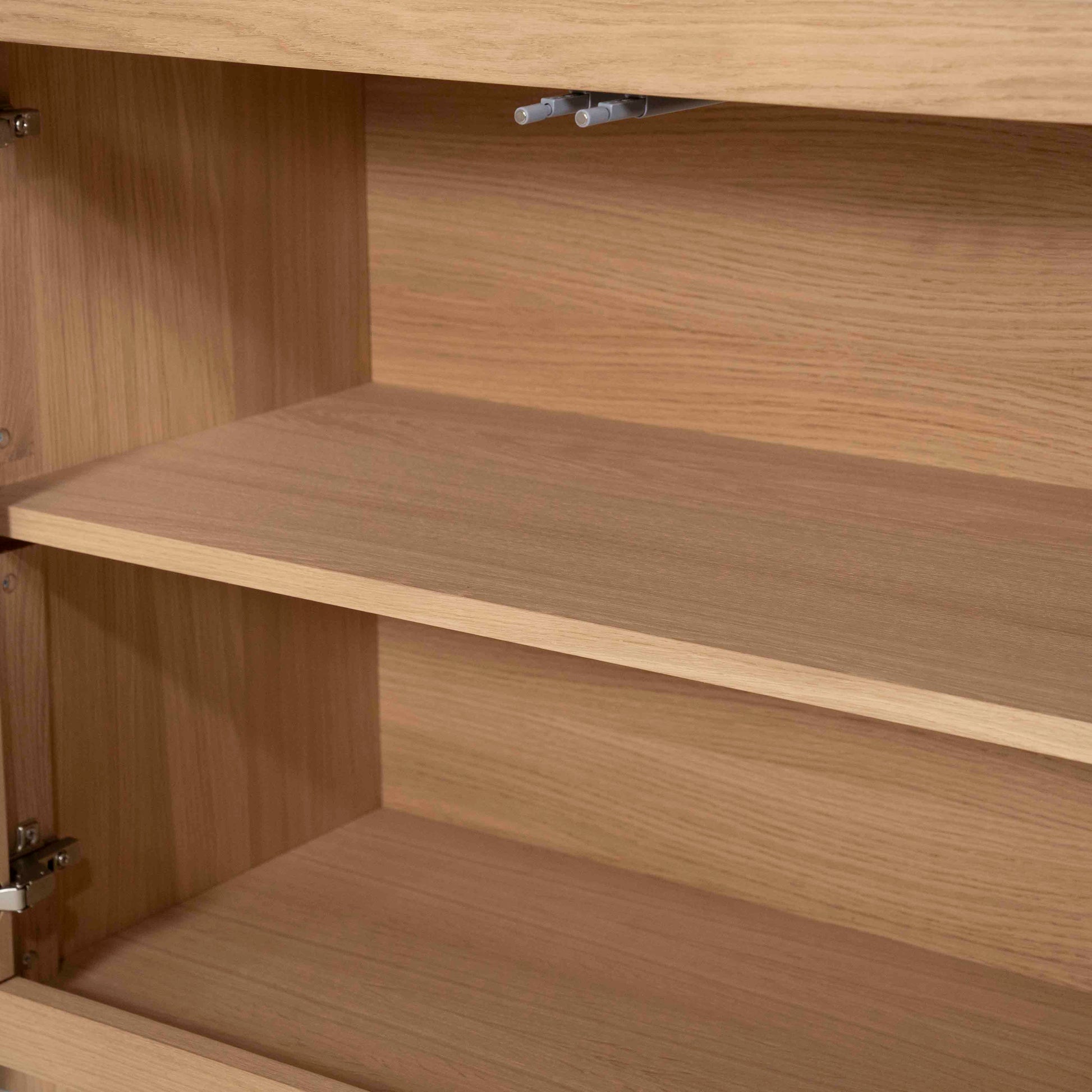 Skjenken har en funksjonell inndeling med både åpne hyller og skap med dører – ideell for oppbevaring av servise, bøker, elektronikk eller interiørdetaljer du ønsker å fremheve. De rene linjene og håndtaksløse dørene skaper et stilrent og harmonisk uttrykk.