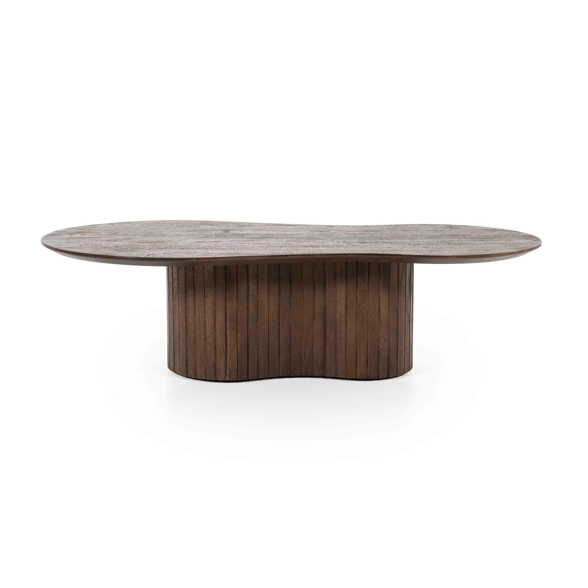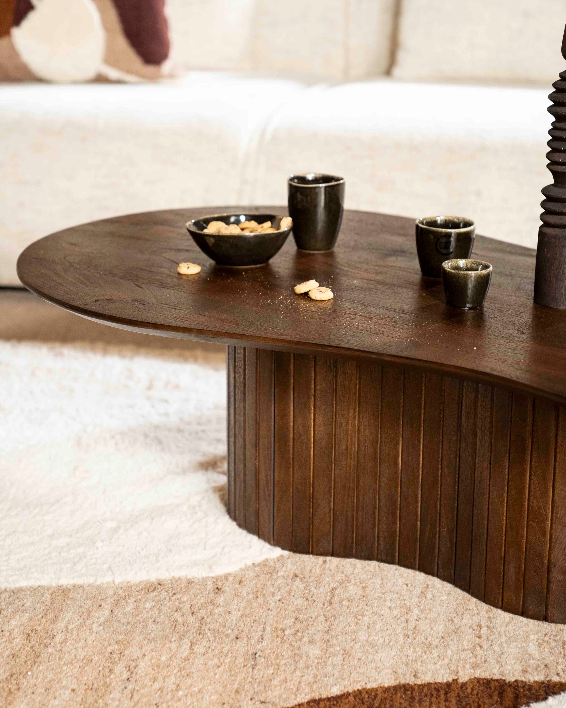 Et skulpturelt sofabord med en organisk, flytende form som gir et naturlig og moderne uttrykk. Bordplaten har myke linjer og hviler på en stabil base med vertikale spor, noe som tilfører både struktur og karakter.