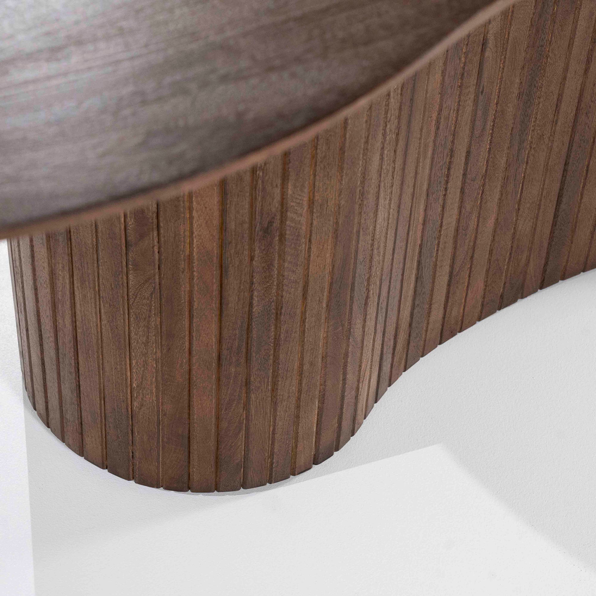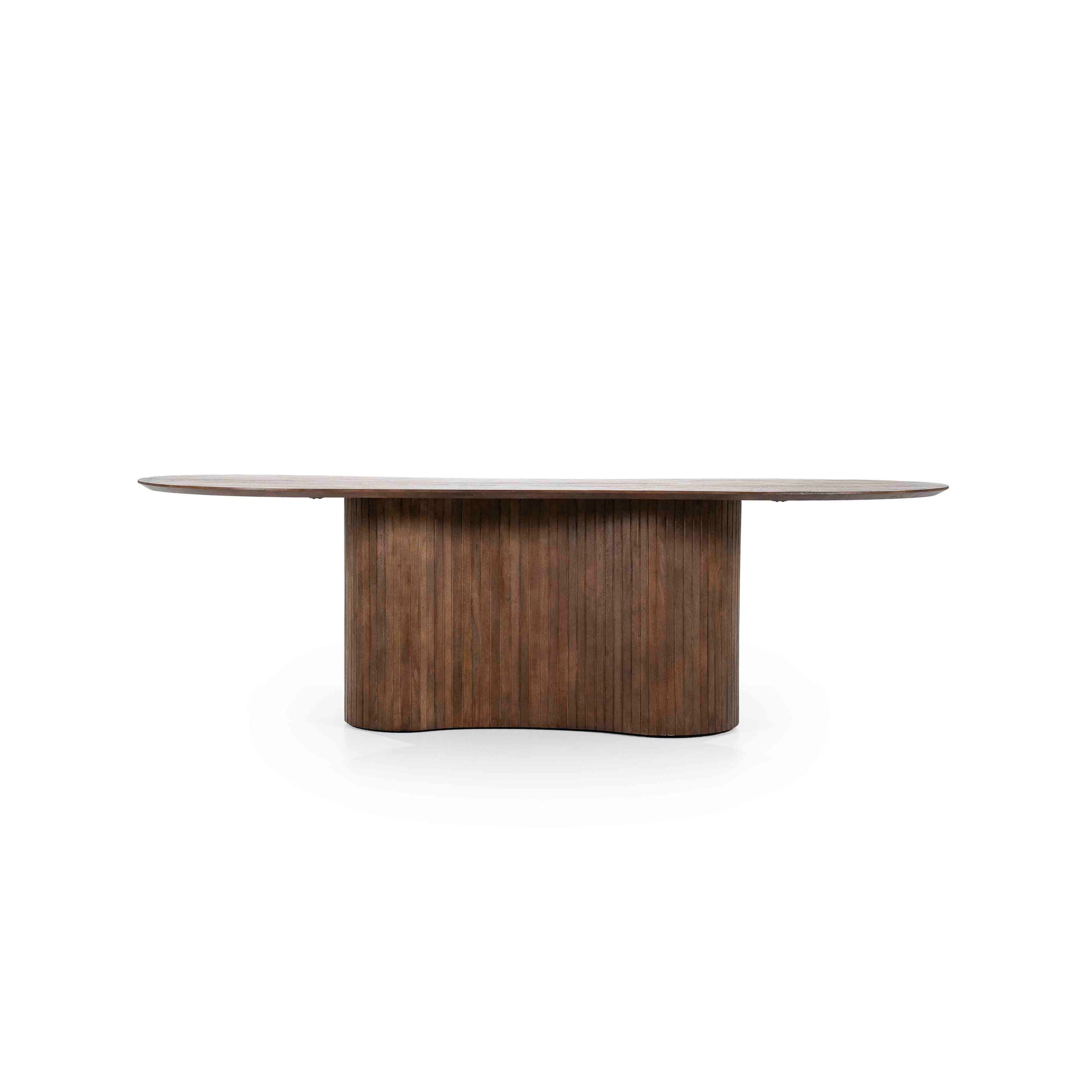 Dette organisk formede spisebordet kombinerer moderne eleganse med naturlige materialer. Den slanke bordplaten hviler på en solid base med vakre vertikale riller i mørkt treverk – et designelement som gir bordet karakter og struktur.