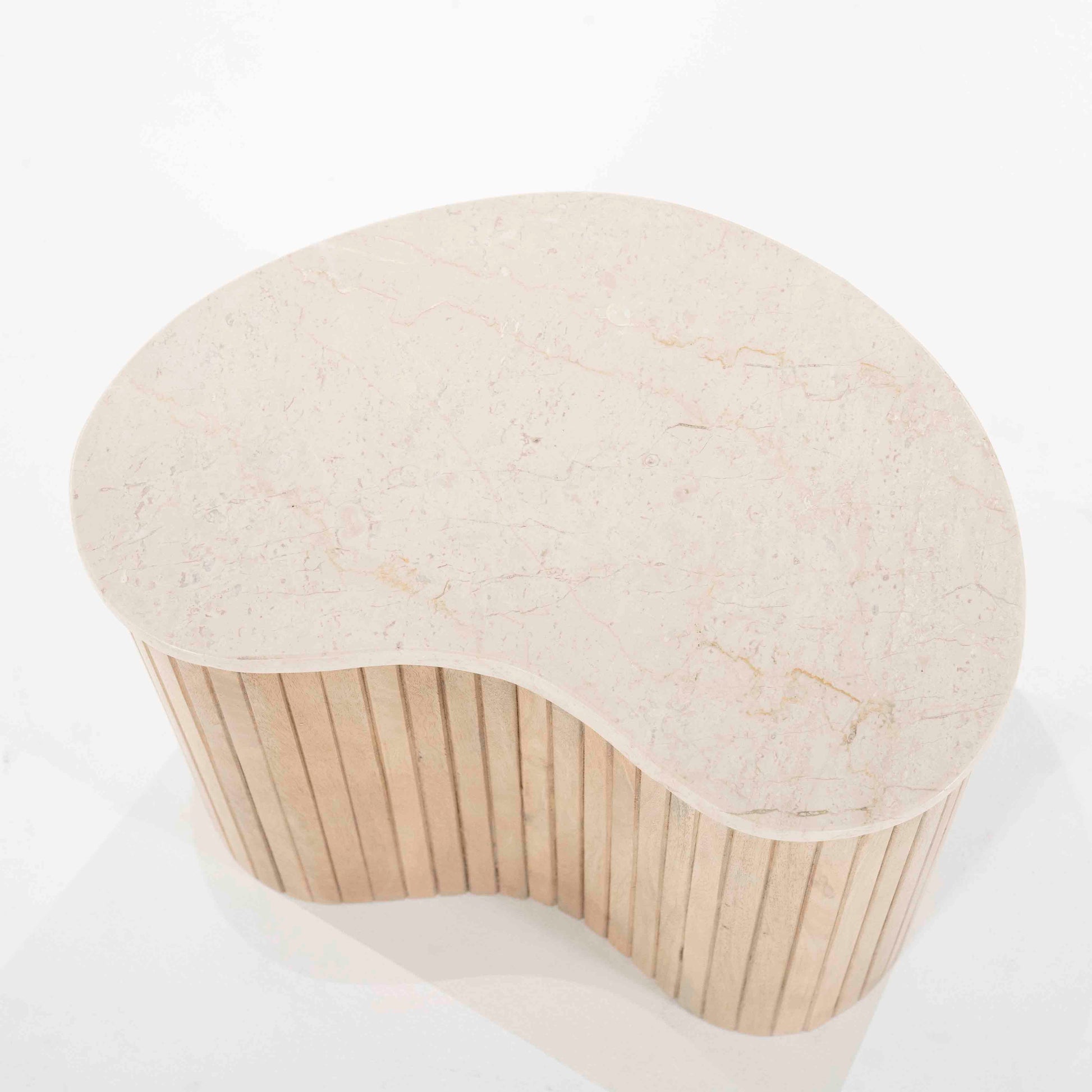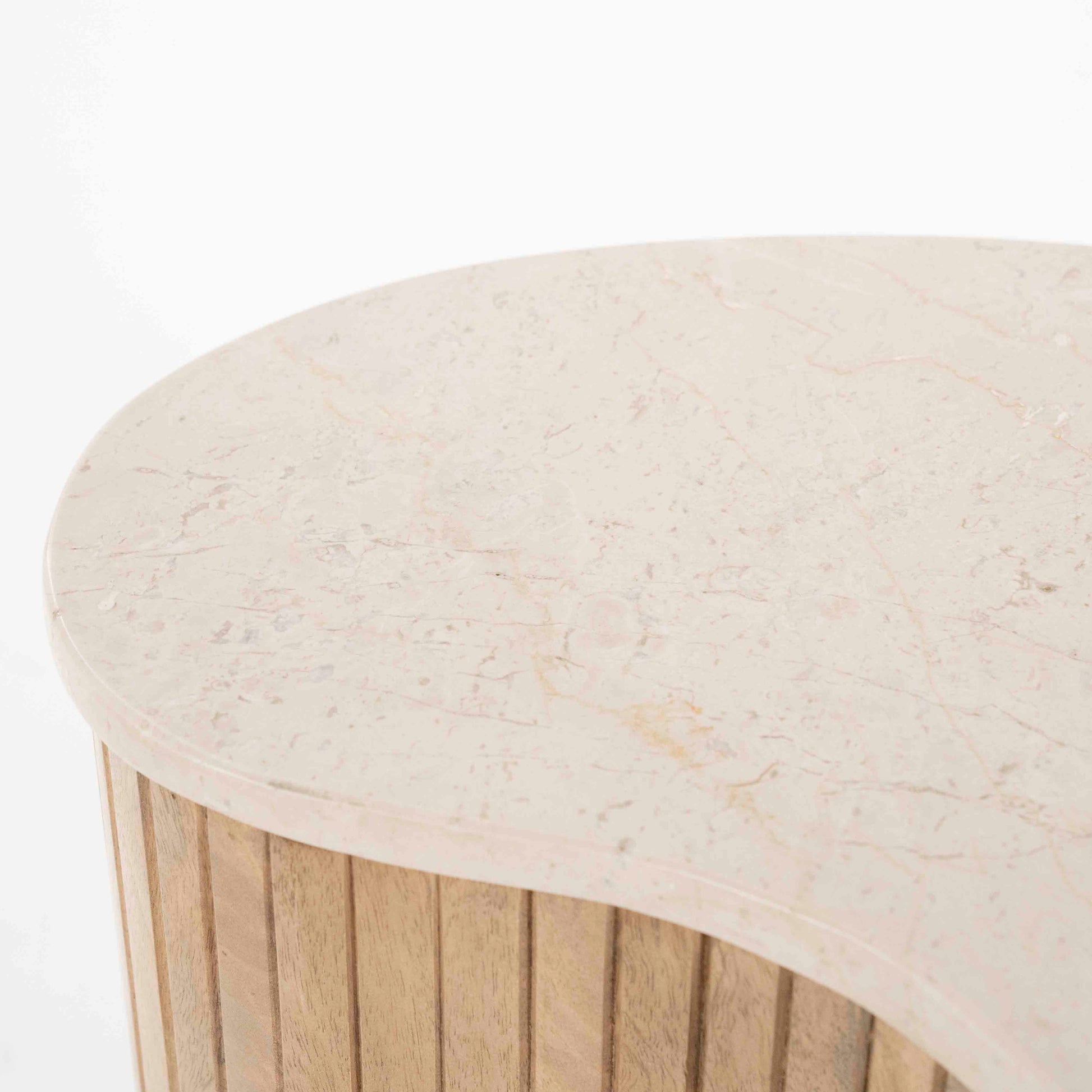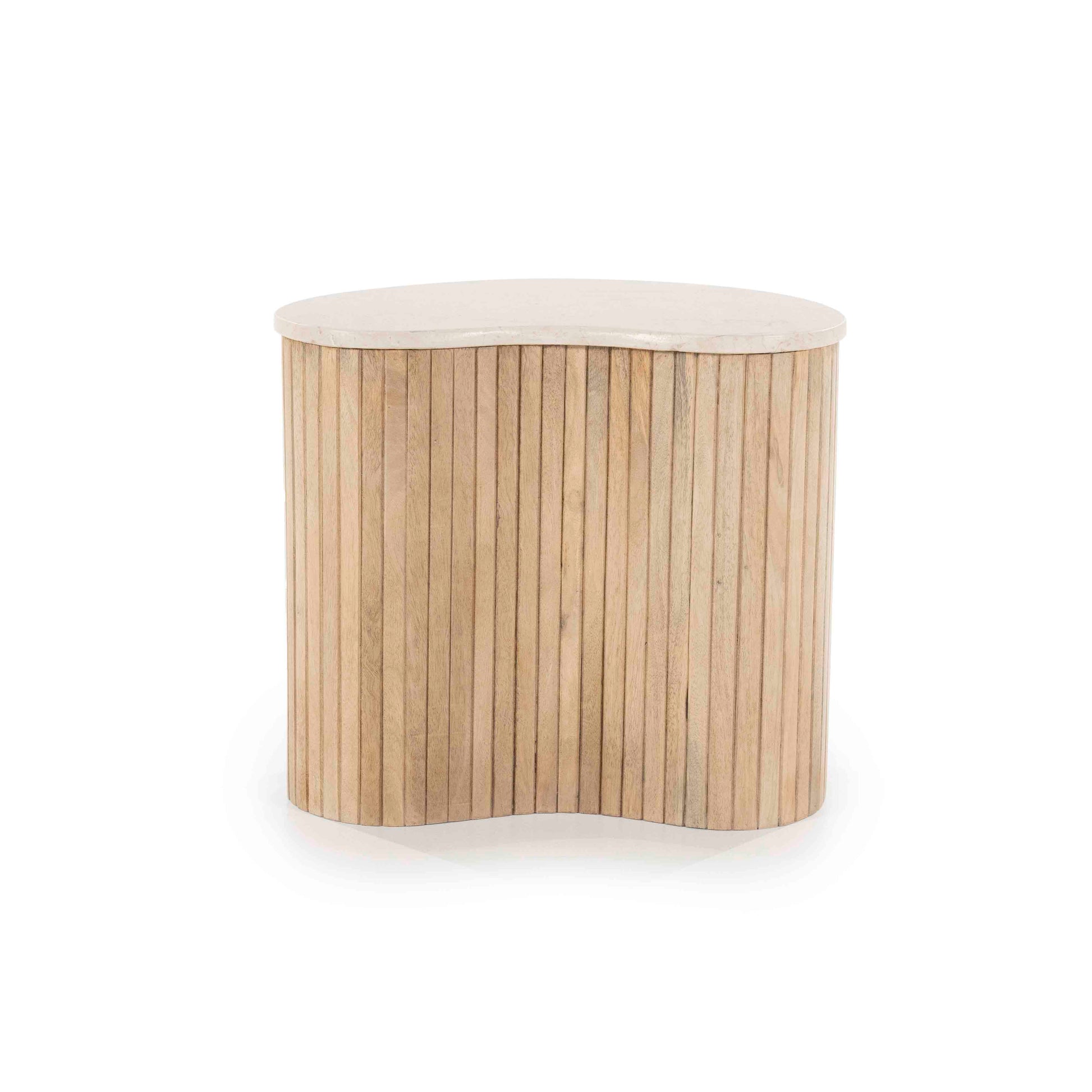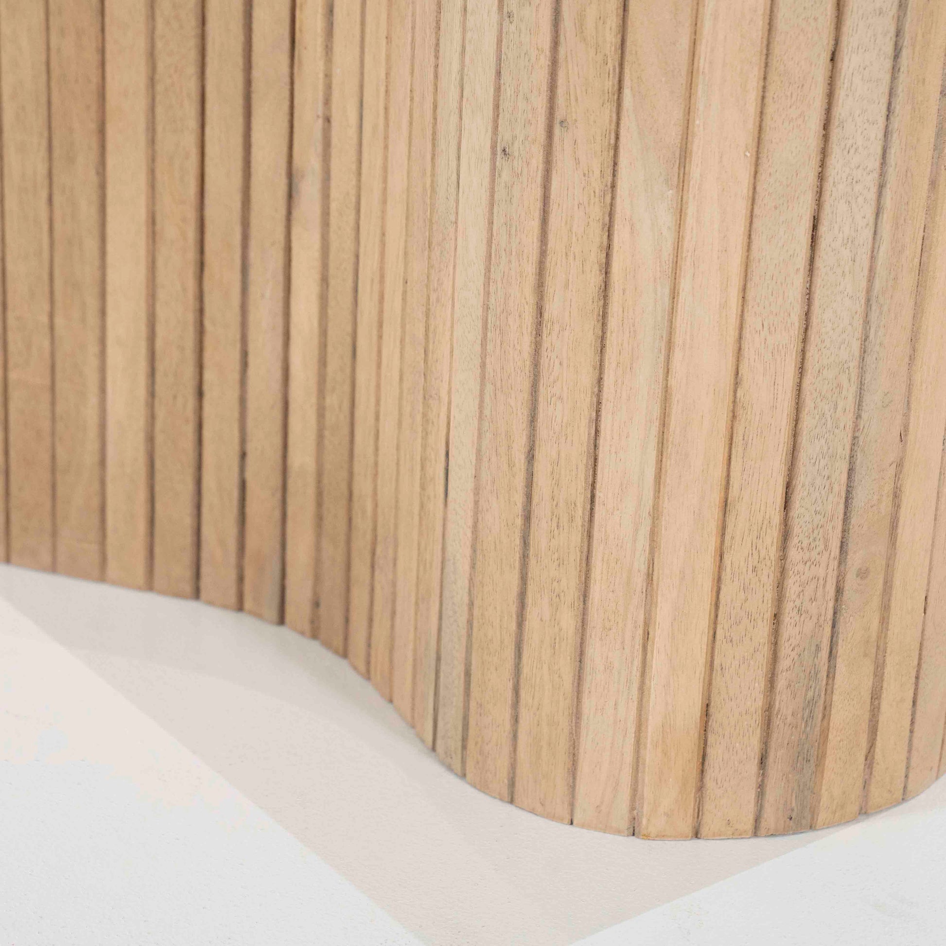 Et elegant sidebord med myke, organiske former og vakker materialkombinasjon. Bordet har en base i lys eik med vertikale ribber som gir tekstur og karakter, kombinert med en topp i lys naturstein for et eksklusivt uttrykk.