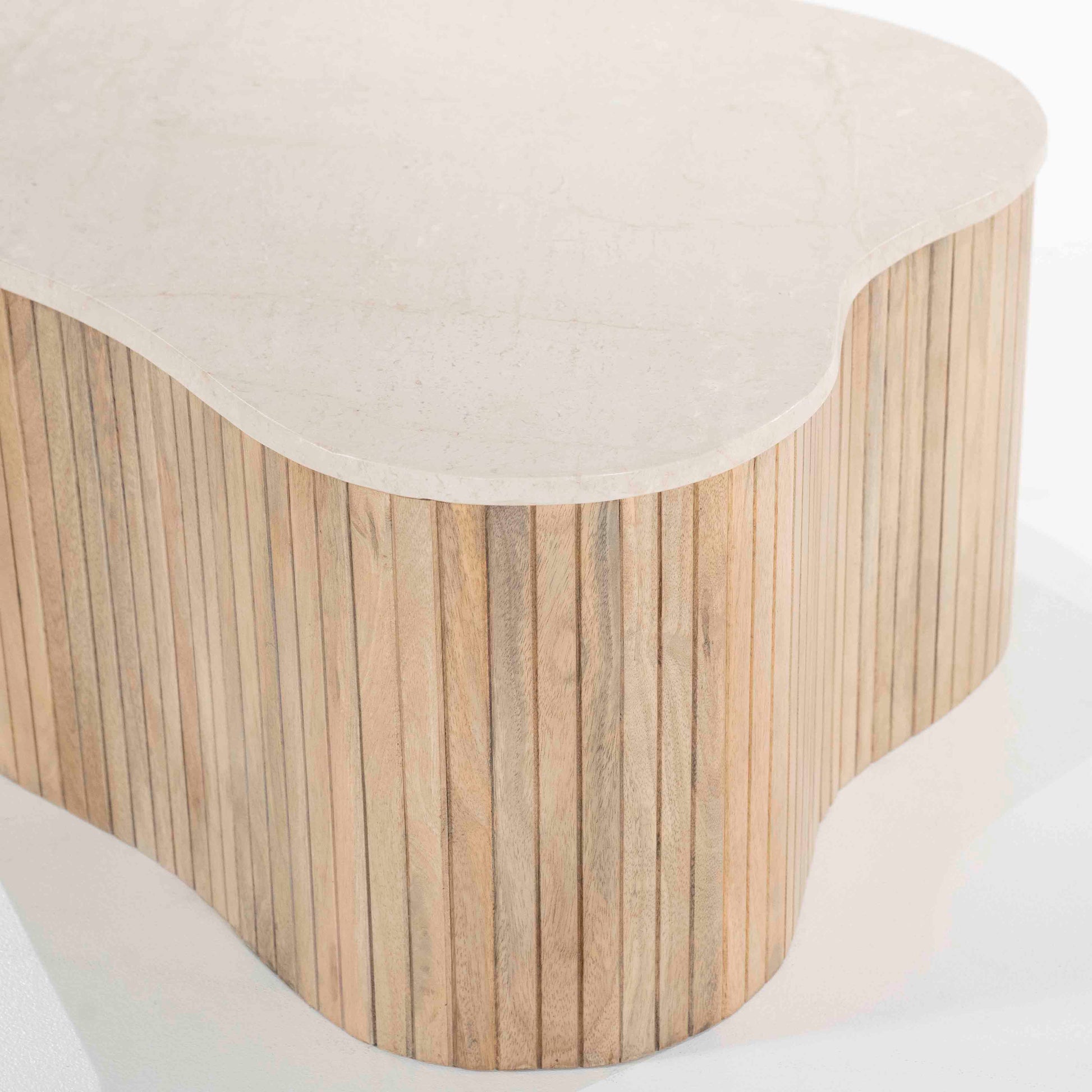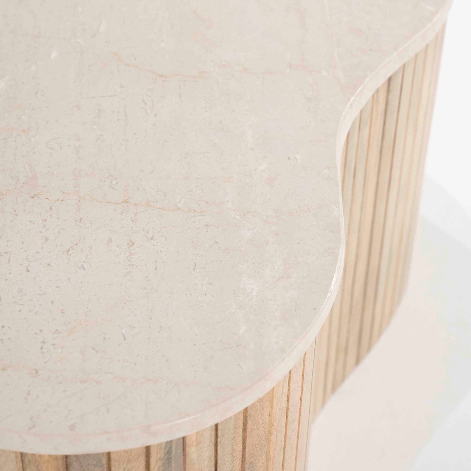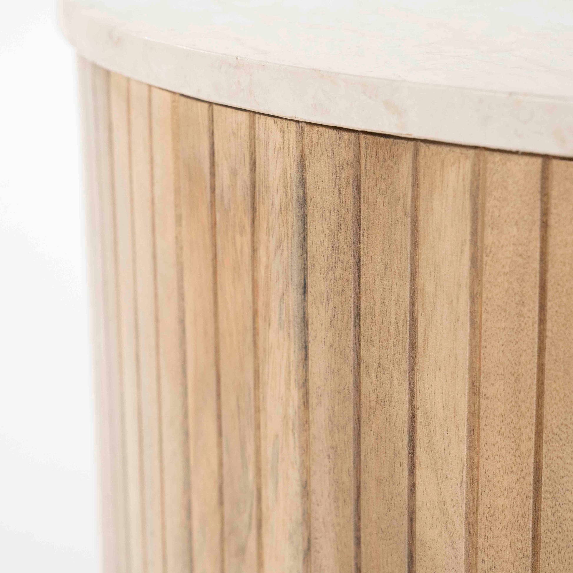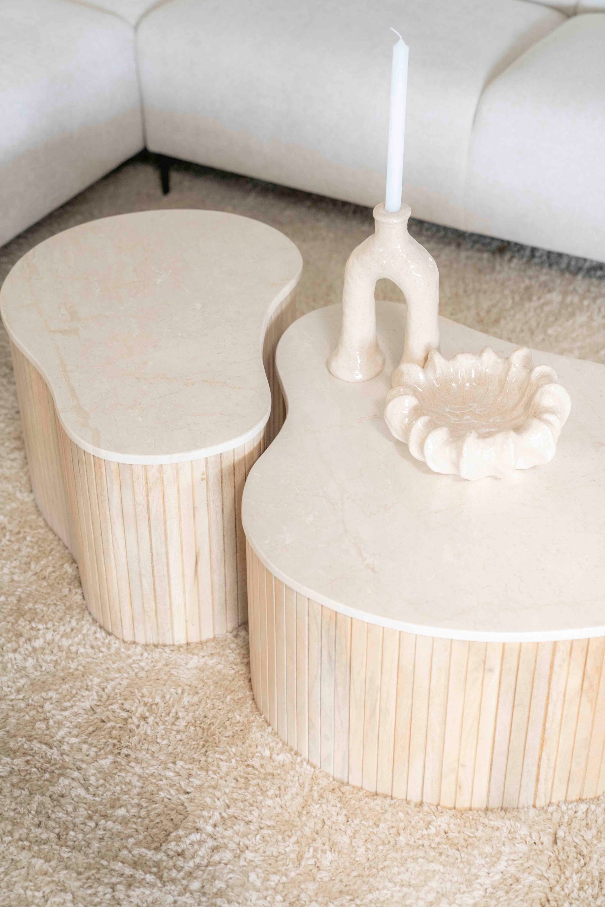 Et elegant sidebord med myke, organiske former og vakker materialkombinasjon. Bordet har en base i lys eik med vertikale ribber som gir tekstur og karakter, kombinert med en topp i lys naturstein for et eksklusivt uttrykk.