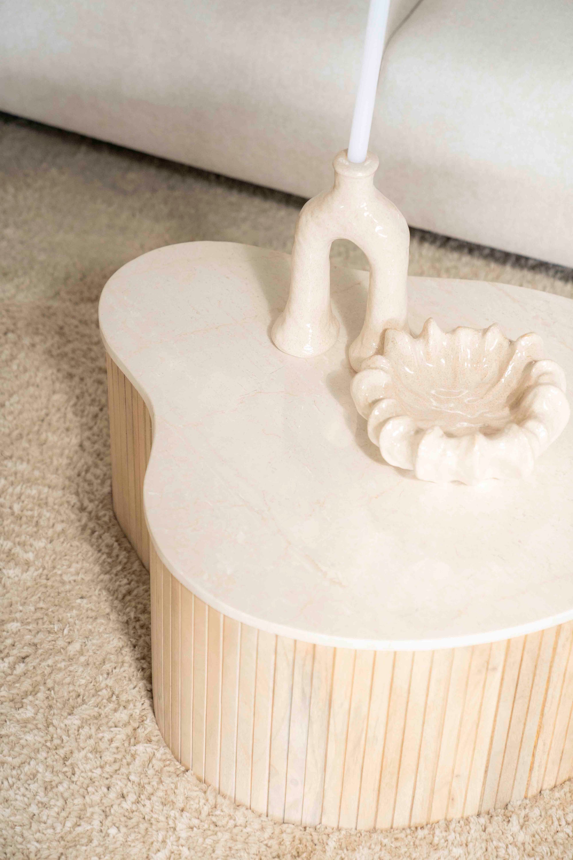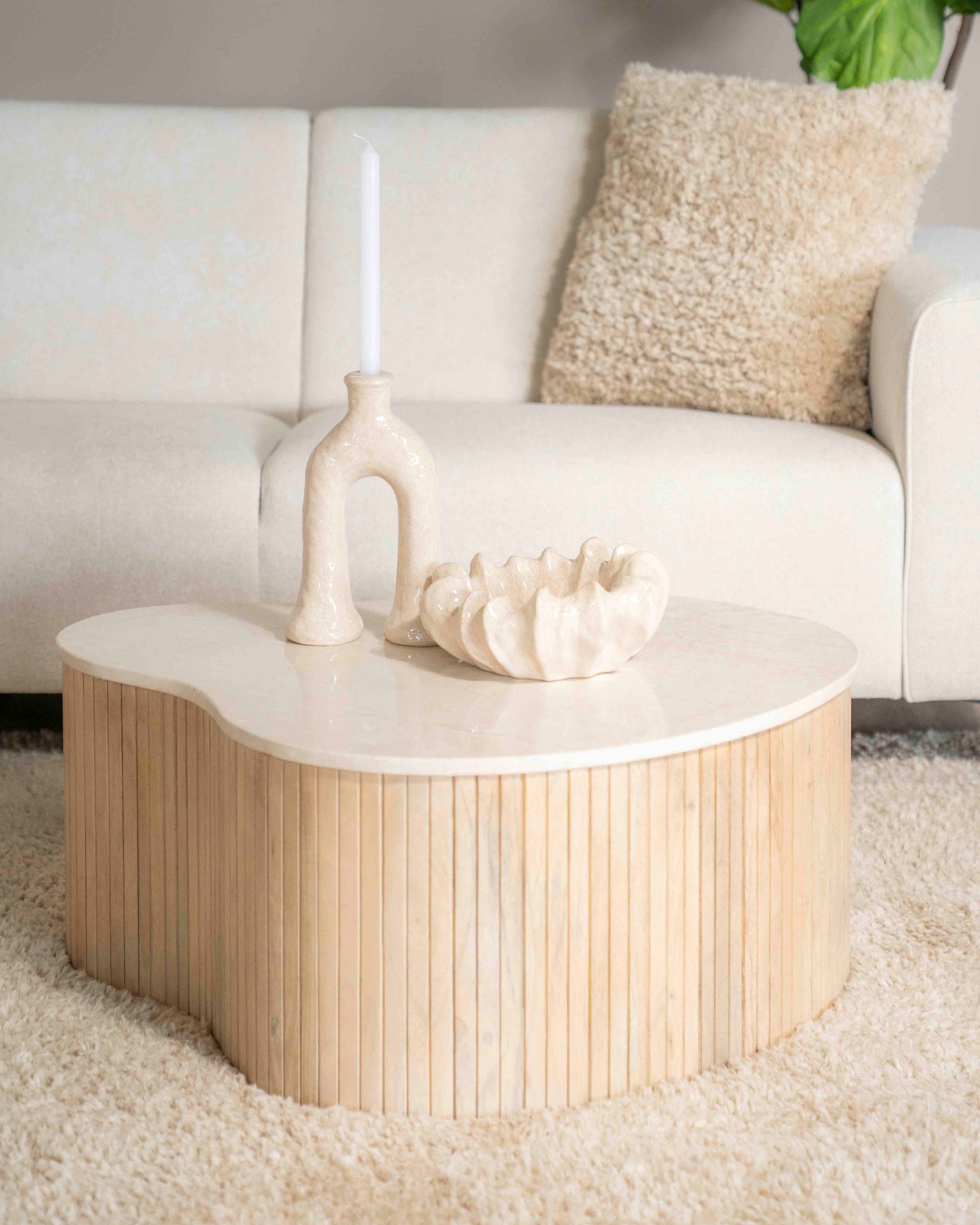 Et lavt og elegant sofabord med myke, avrundede former inspirert av naturens organiske linjer.