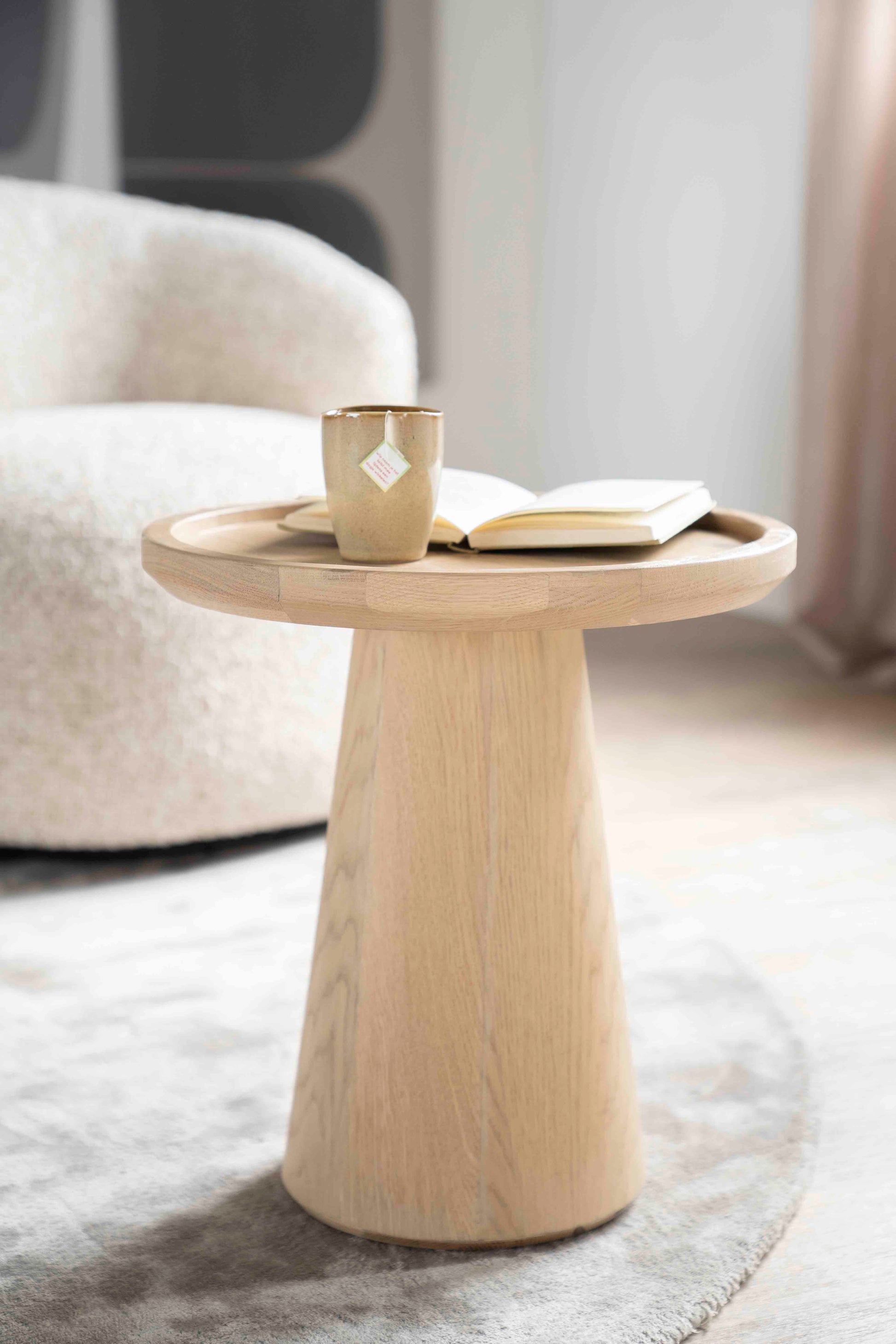 Et elegant sidebord med et rent og moderne formspråk. Bordet er laget i lys eik og har en konisk base som gir et solid og balansert uttrykk. Den lett forhøyede kanten rundt bordplaten tilfører både funksjon og detaljrikdom – perfekt for å sette frem kaffekoppen, en vase eller en bok.