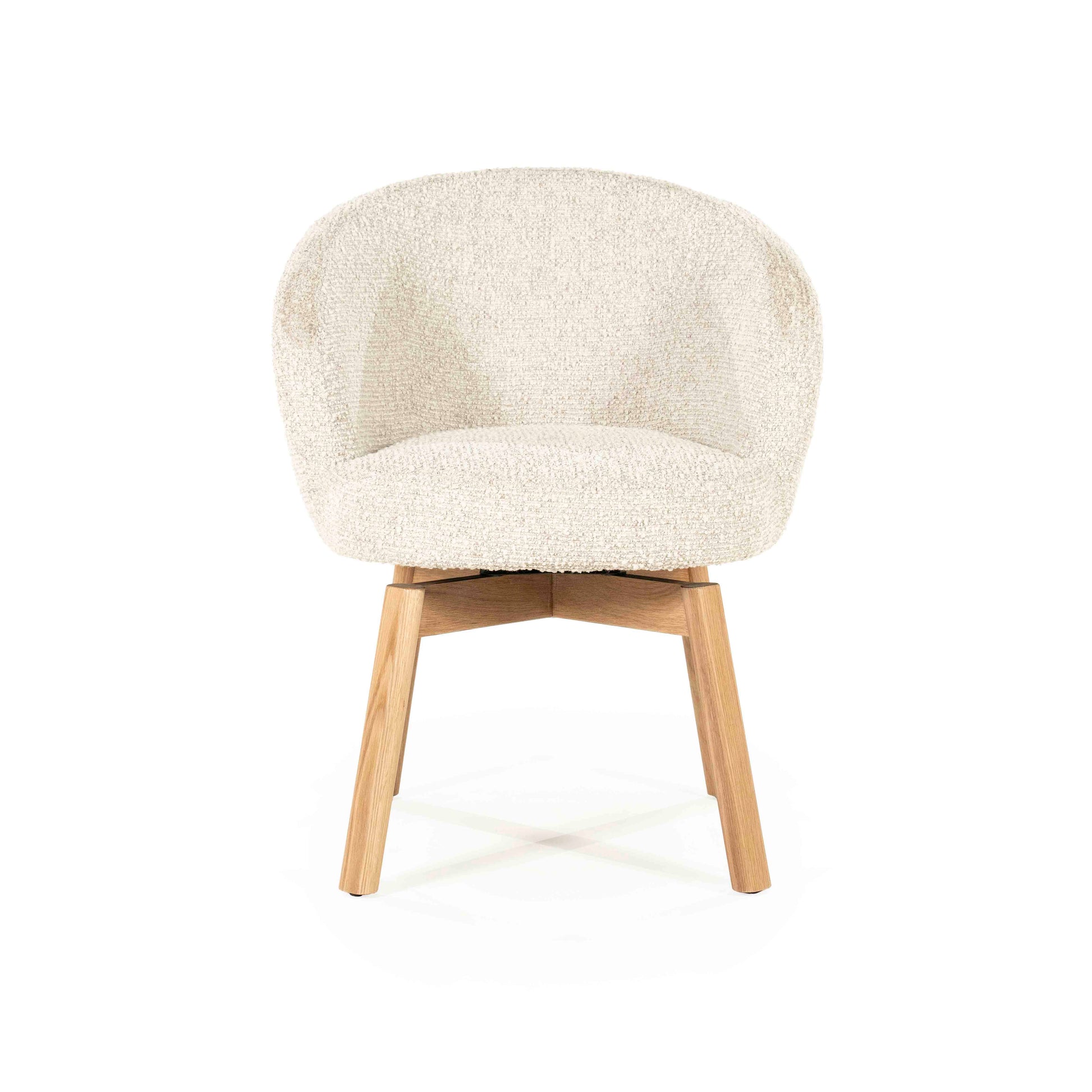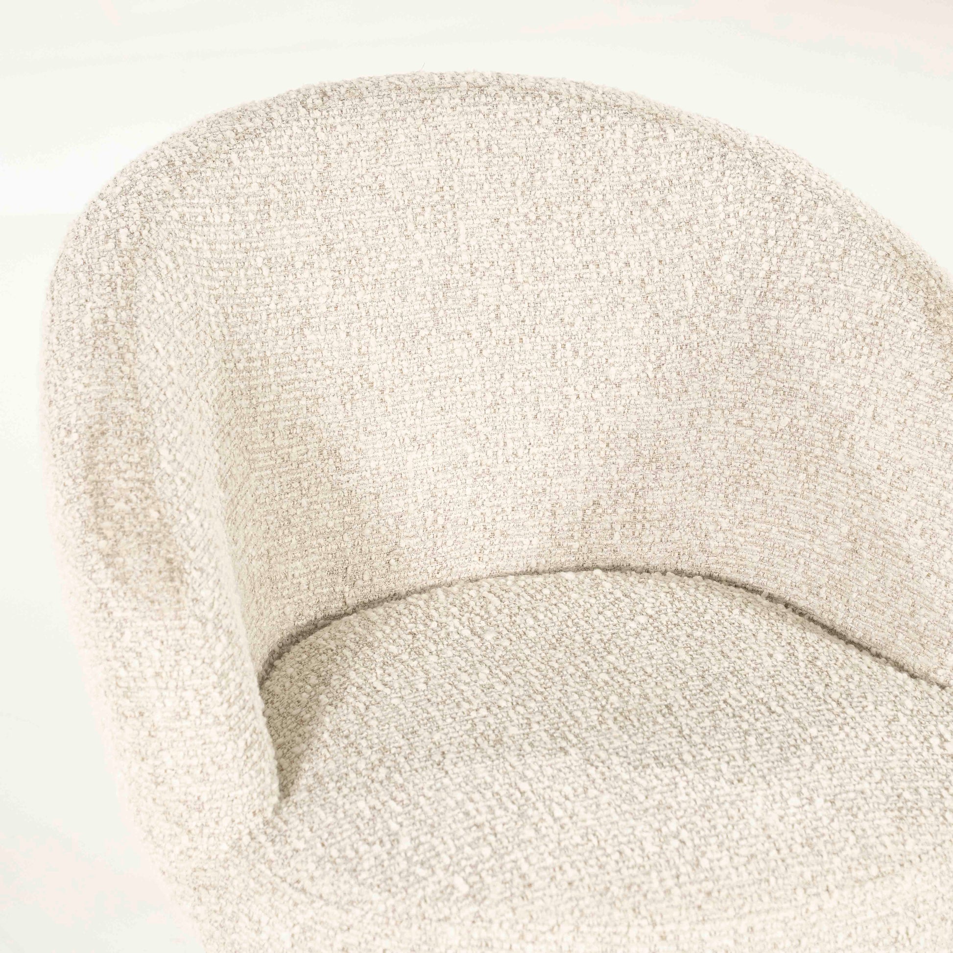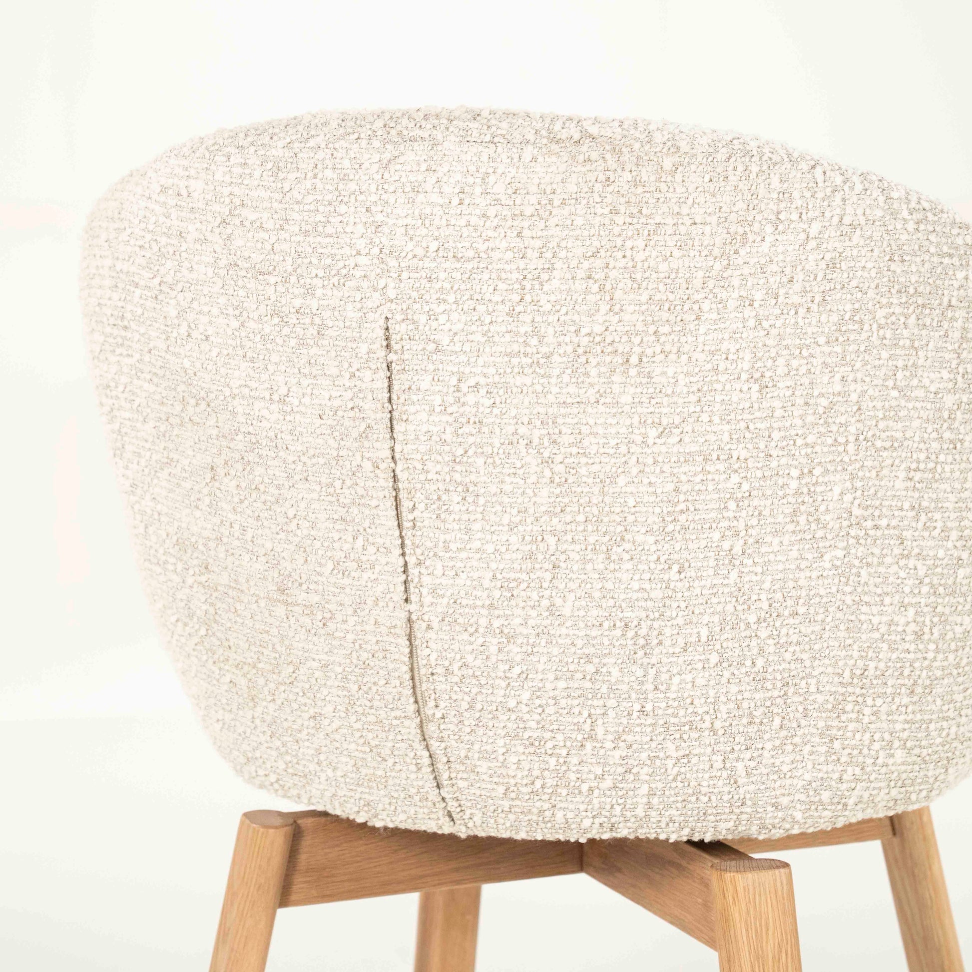 Elegant spisestol med avrundet rygg og myk polstring i lyst boucléstoff. De skrå bena i naturlig eik gir stolen et varmt og moderne uttrykk, mens den runde formen innbyr til lange, komfortable måltider. En perfekt kombinasjon av skandinavisk enkelhet og luksuriøs komfort.