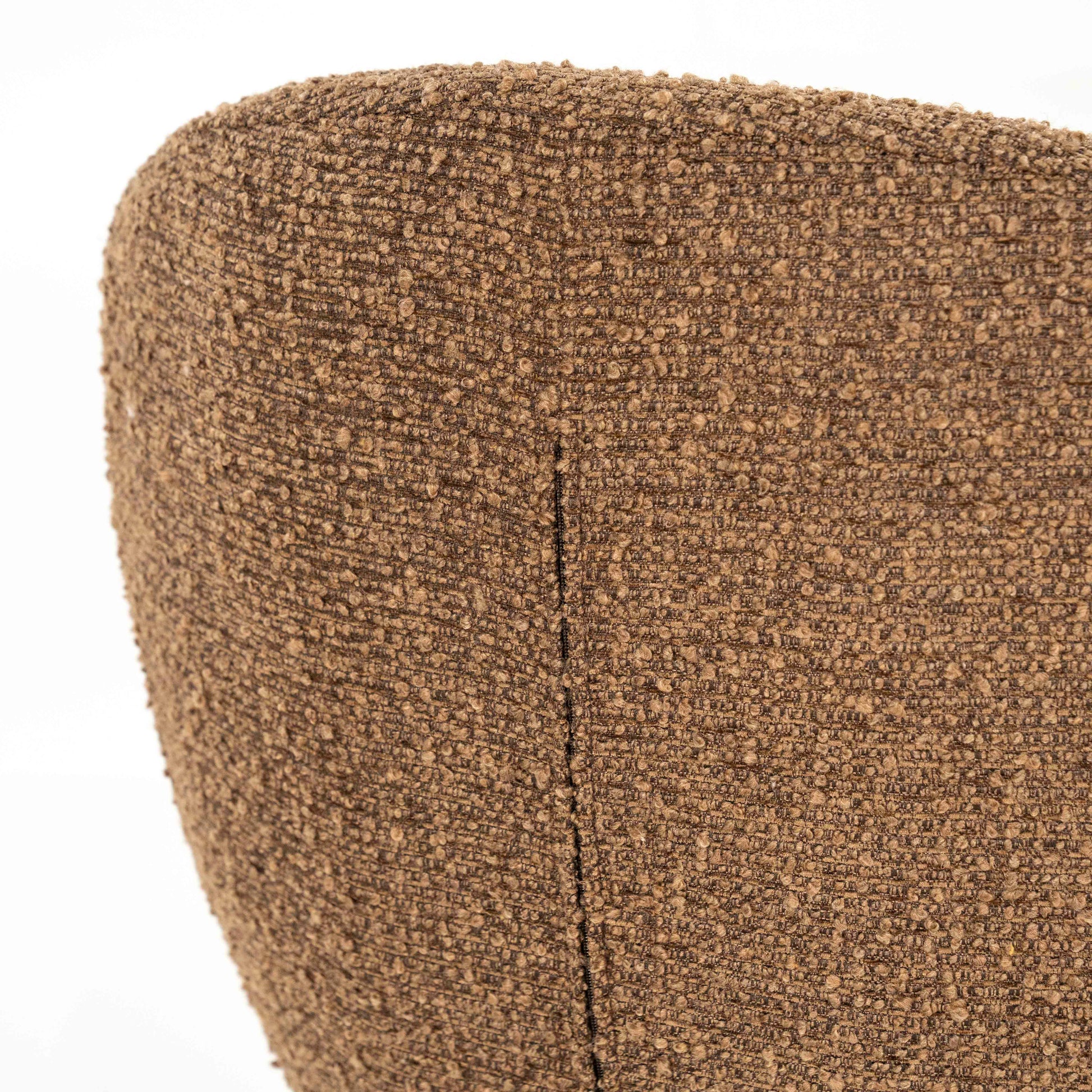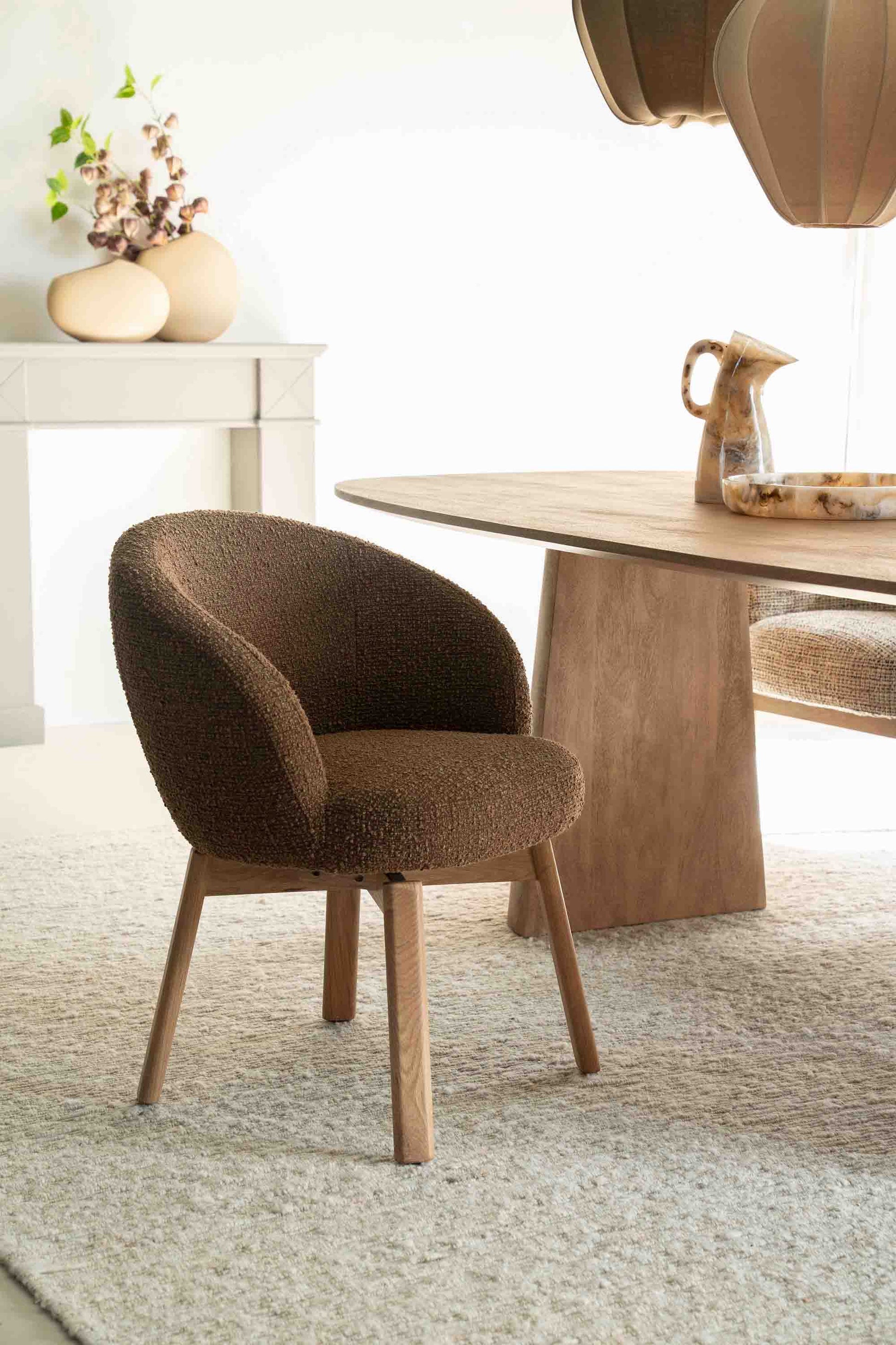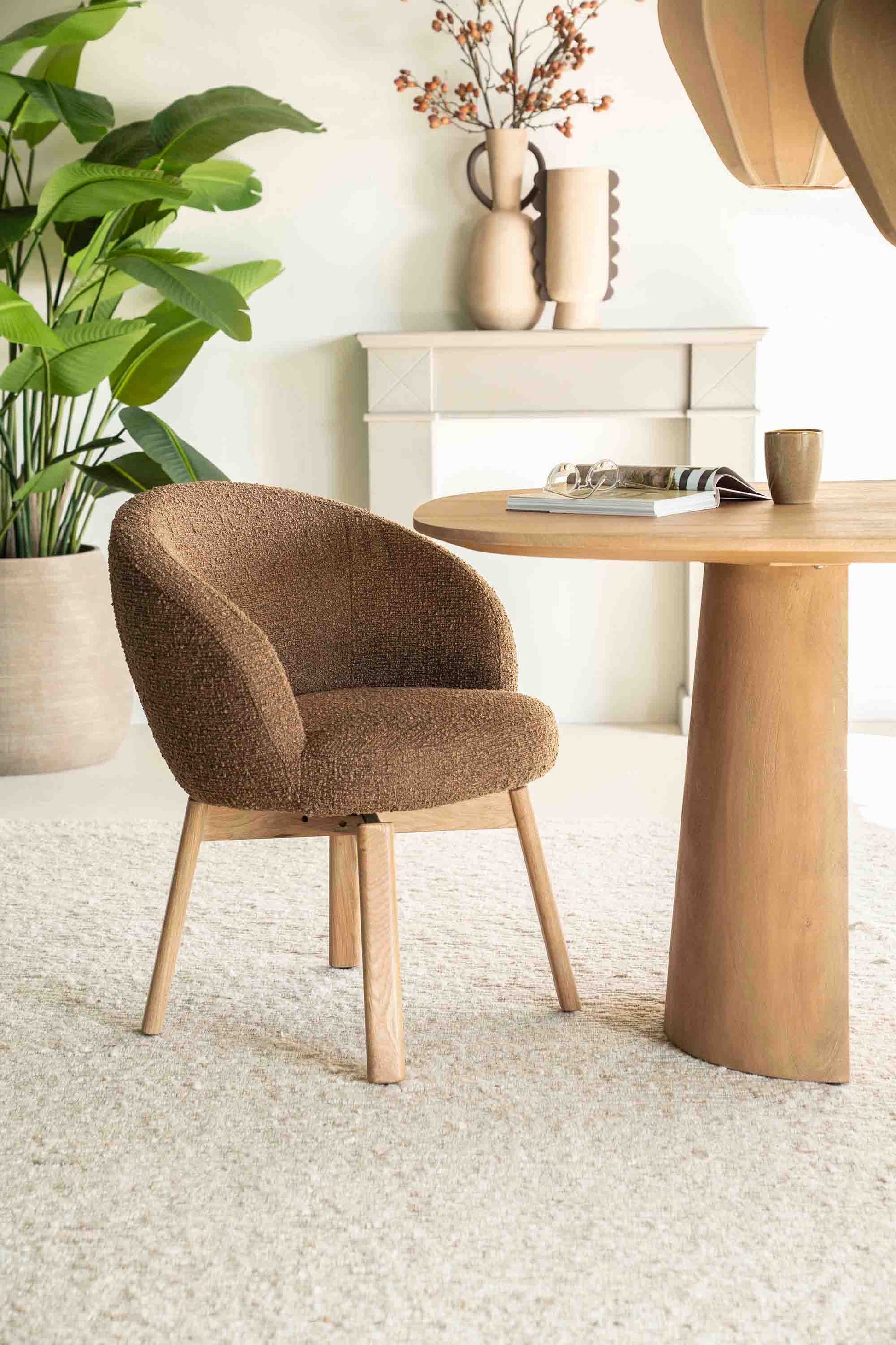 Elegant spisestol med avrundet rygg og myk polstring i lyst boucléstoff. De skrå bena i naturlig eik gir stolen et varmt og moderne uttrykk, mens den runde formen innbyr til lange, komfortable måltider. En perfekt kombinasjon av skandinavisk enkelhet og luksuriøs komfort.