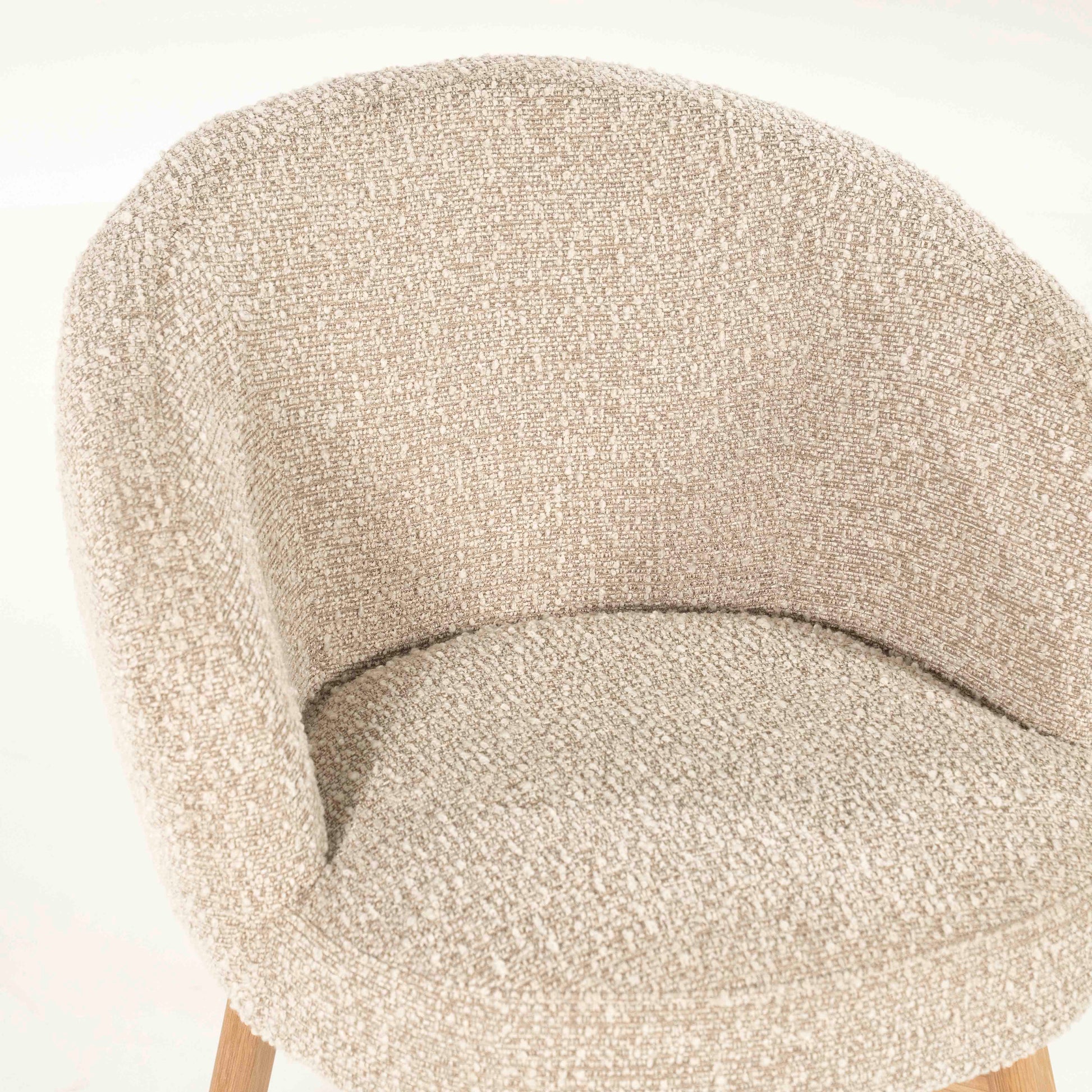 Elegant spisestol med avrundet rygg og myk polstring i lyst boucléstoff. De skrå bena i naturlig eik gir stolen et varmt og moderne uttrykk, mens den runde formen innbyr til lange, komfortable måltider. En perfekt kombinasjon av skandinavisk enkelhet og luksuriøs komfort.