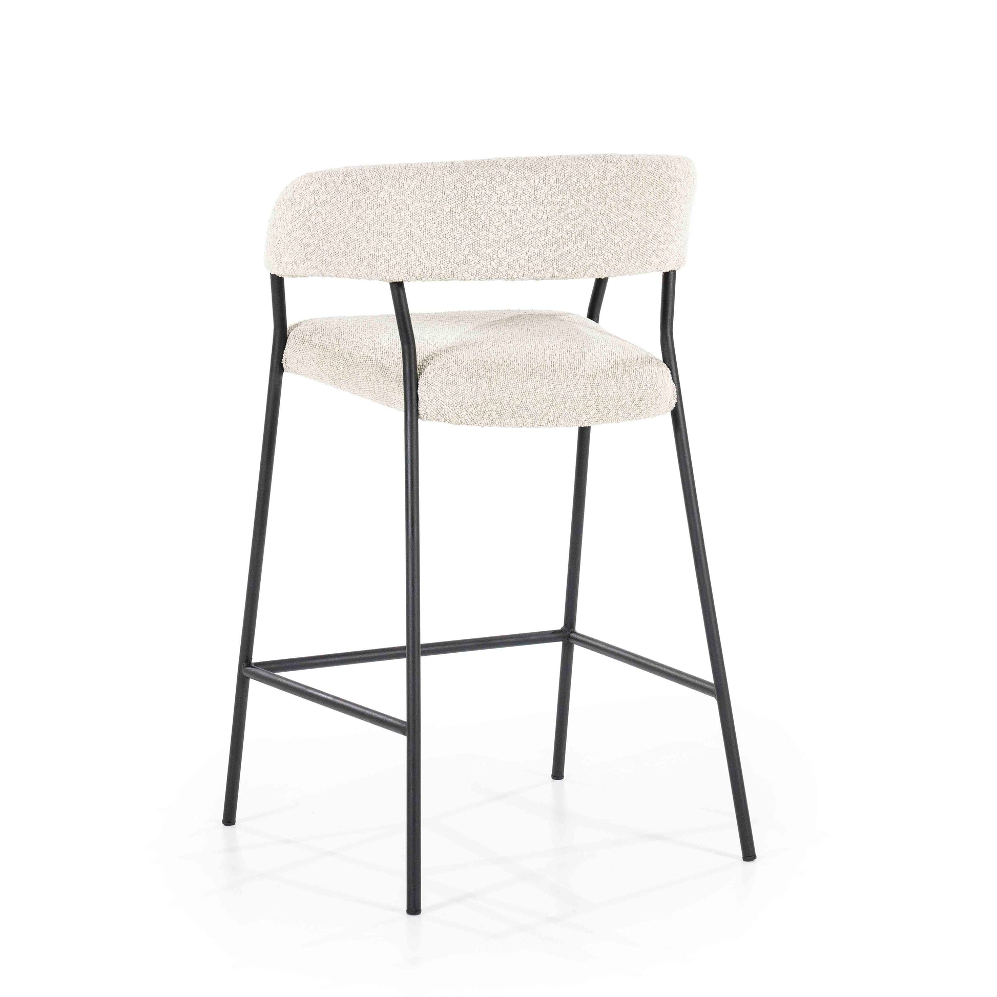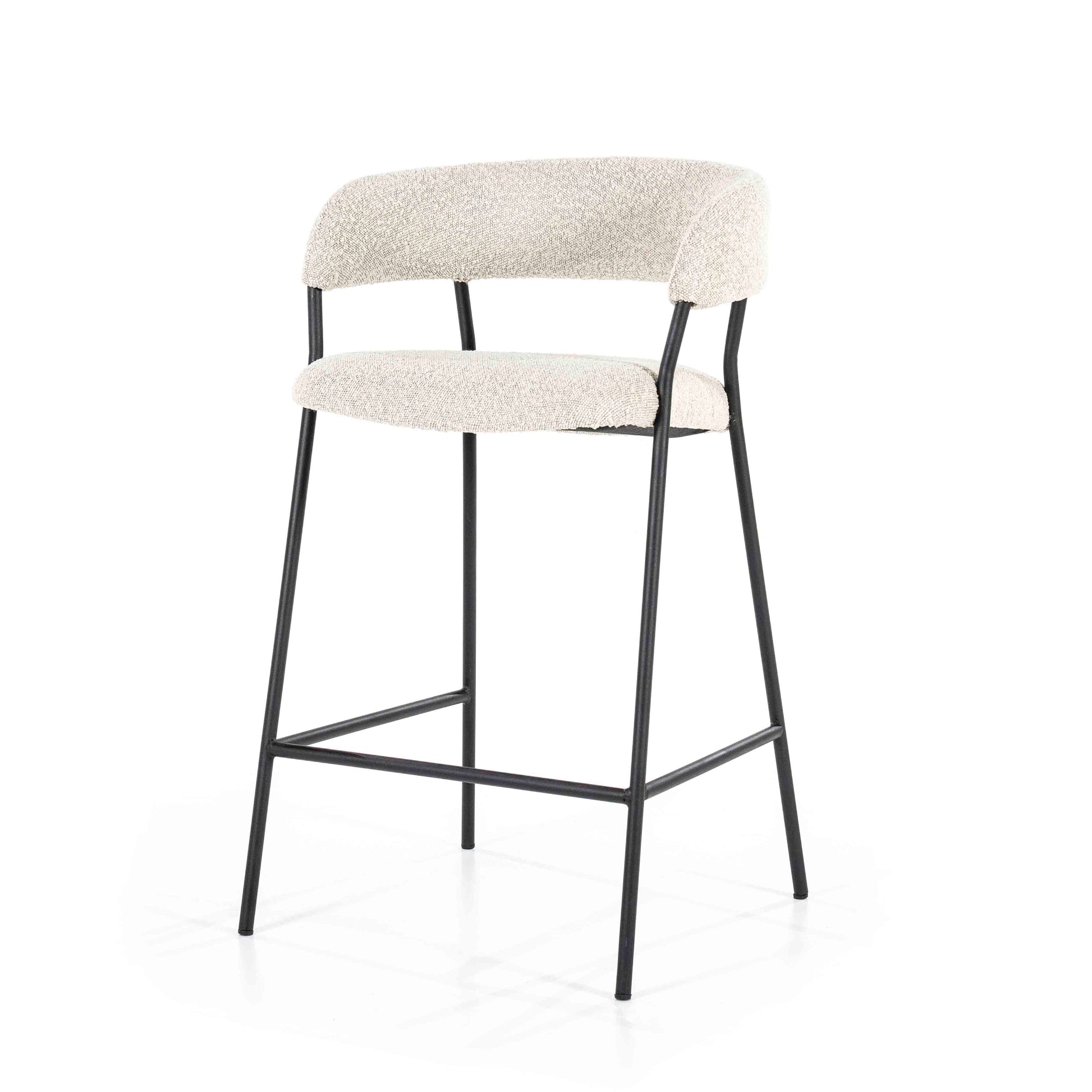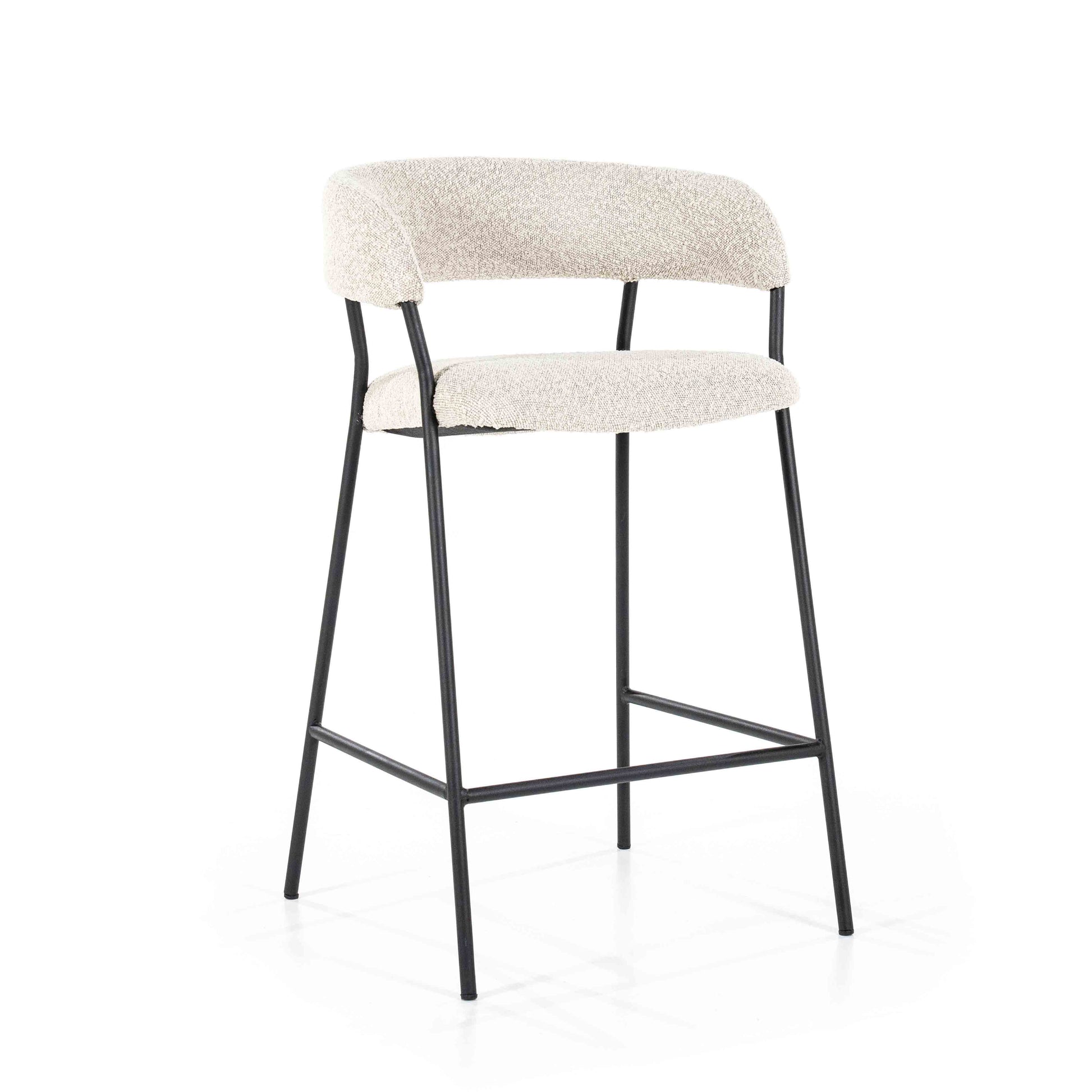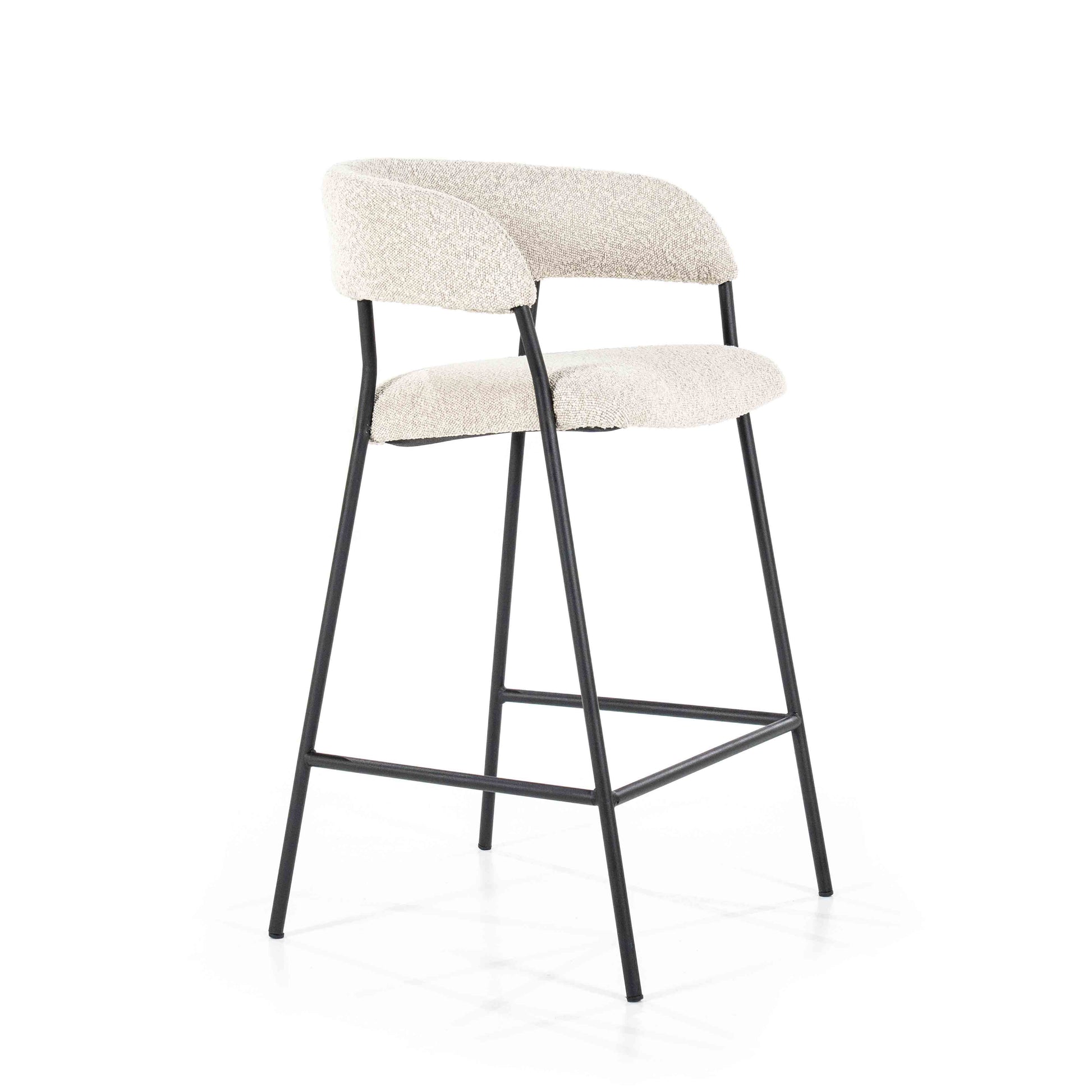 Denne stilrene barstolen kombinerer moderne design med behagelig sittekomfort. Det myke setet og den buede ryggen er trukket i en lekker bouclé-tekstil som gir stolen et lunt og eksklusivt uttrykk. Den sorte metallrammen tilfører et minimalistisk og industrielt preg som balanserer det myke stoffet perfekt.