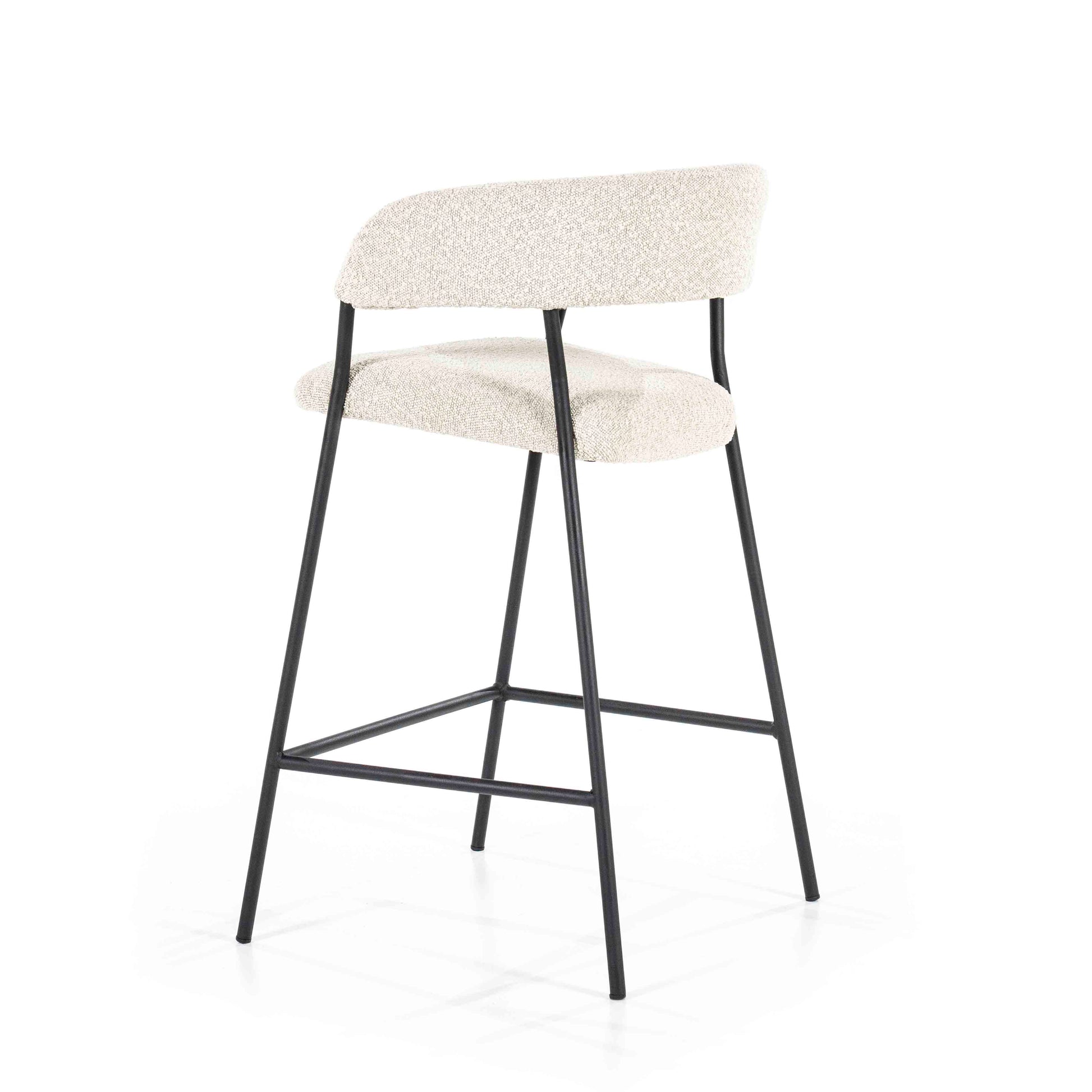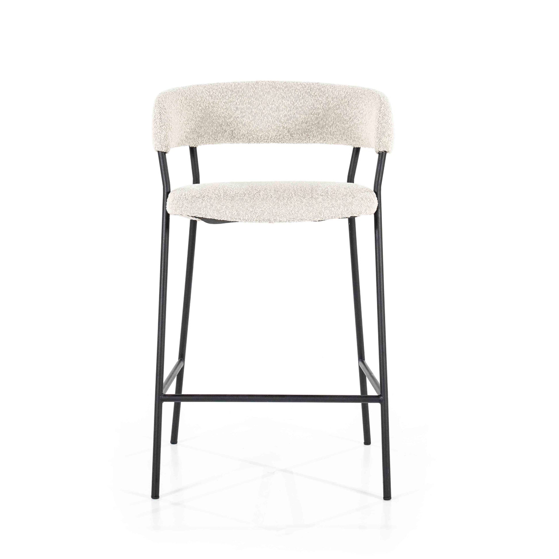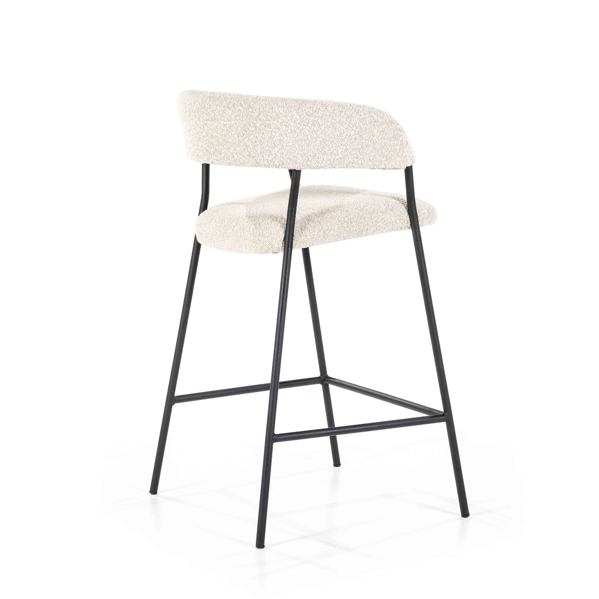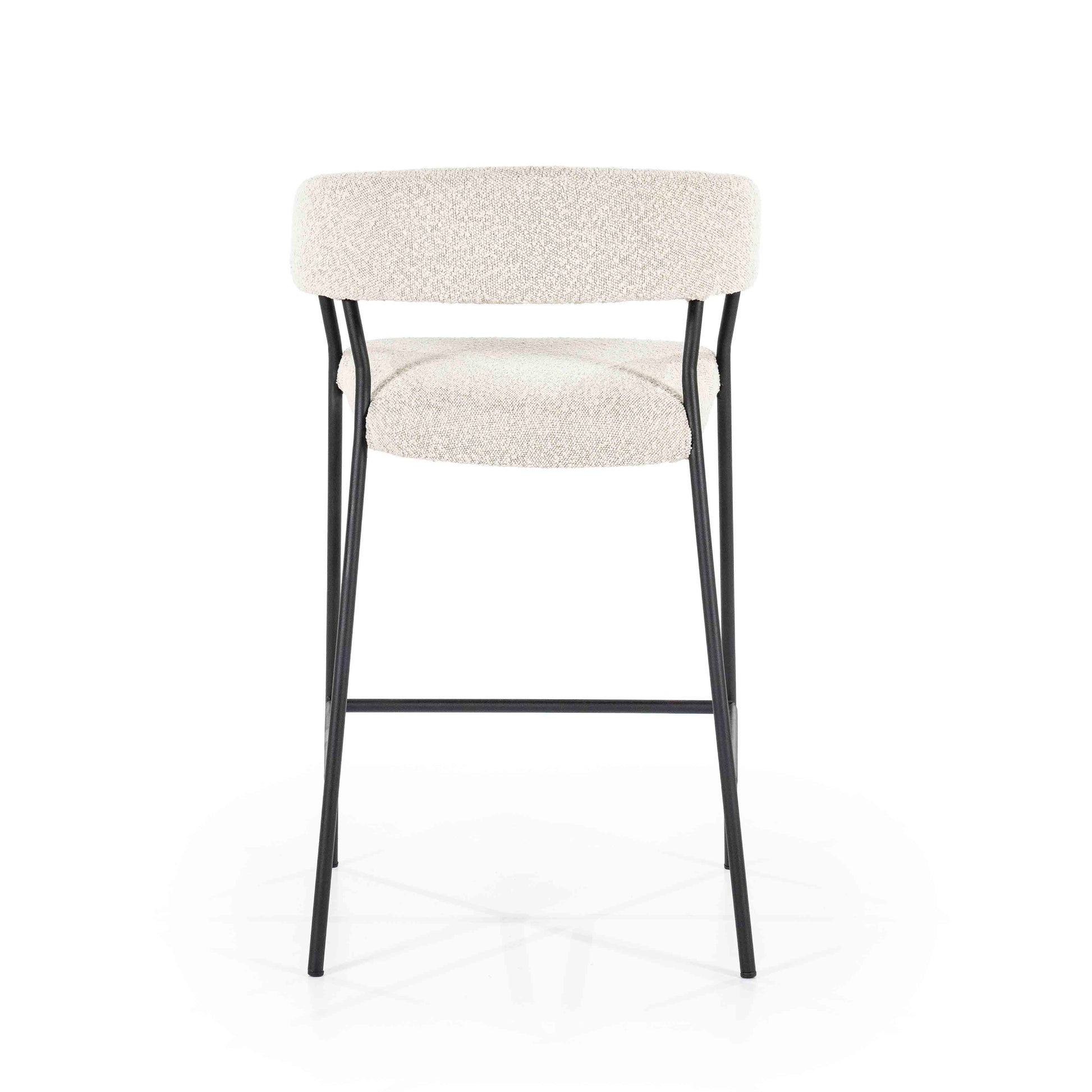 Denne stilrene barstolen kombinerer moderne design med behagelig sittekomfort. Det myke setet og den buede ryggen er trukket i en lekker bouclé-tekstil som gir stolen et lunt og eksklusivt uttrykk. Den sorte metallrammen tilfører et minimalistisk og industrielt preg som balanserer det myke stoffet perfekt.