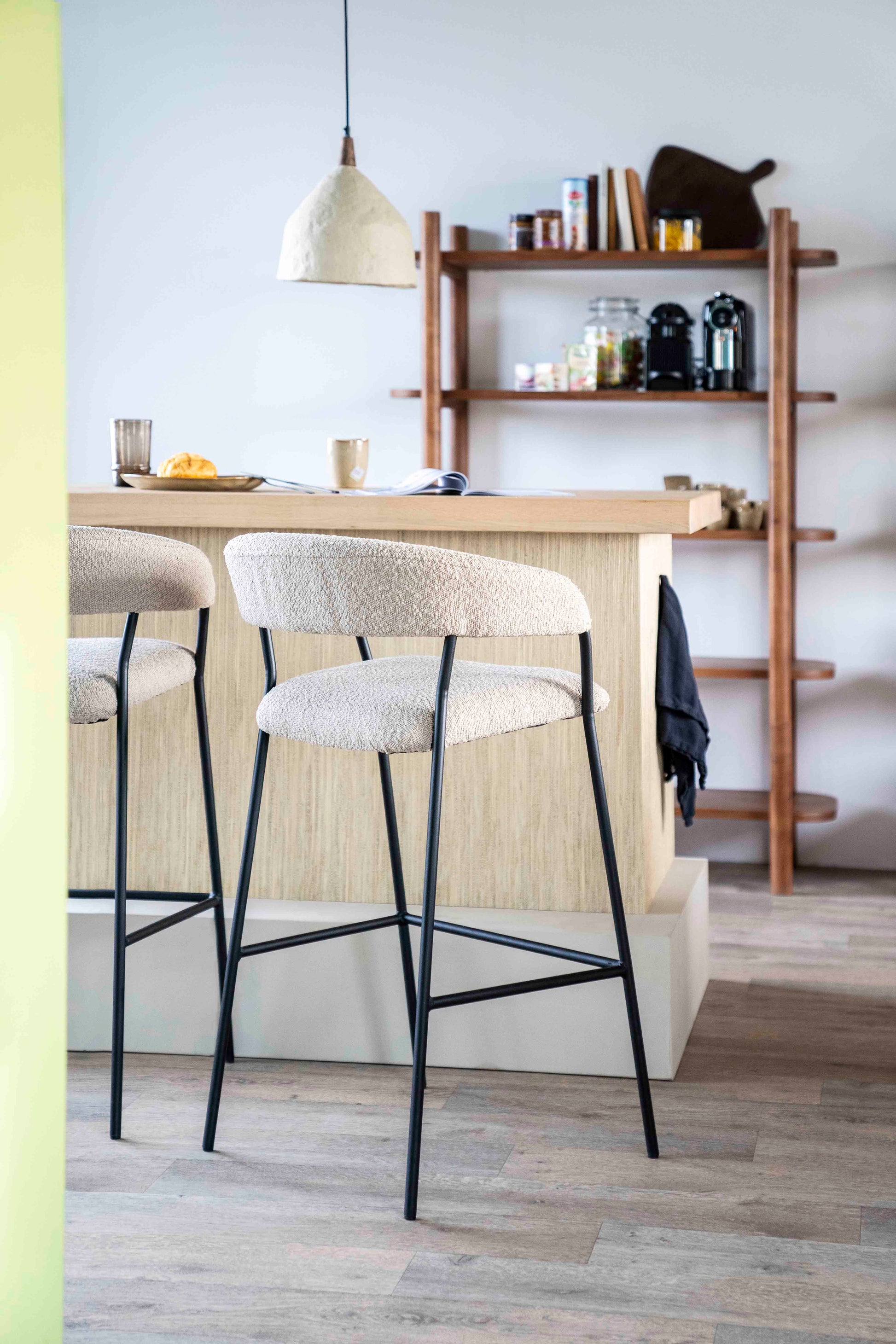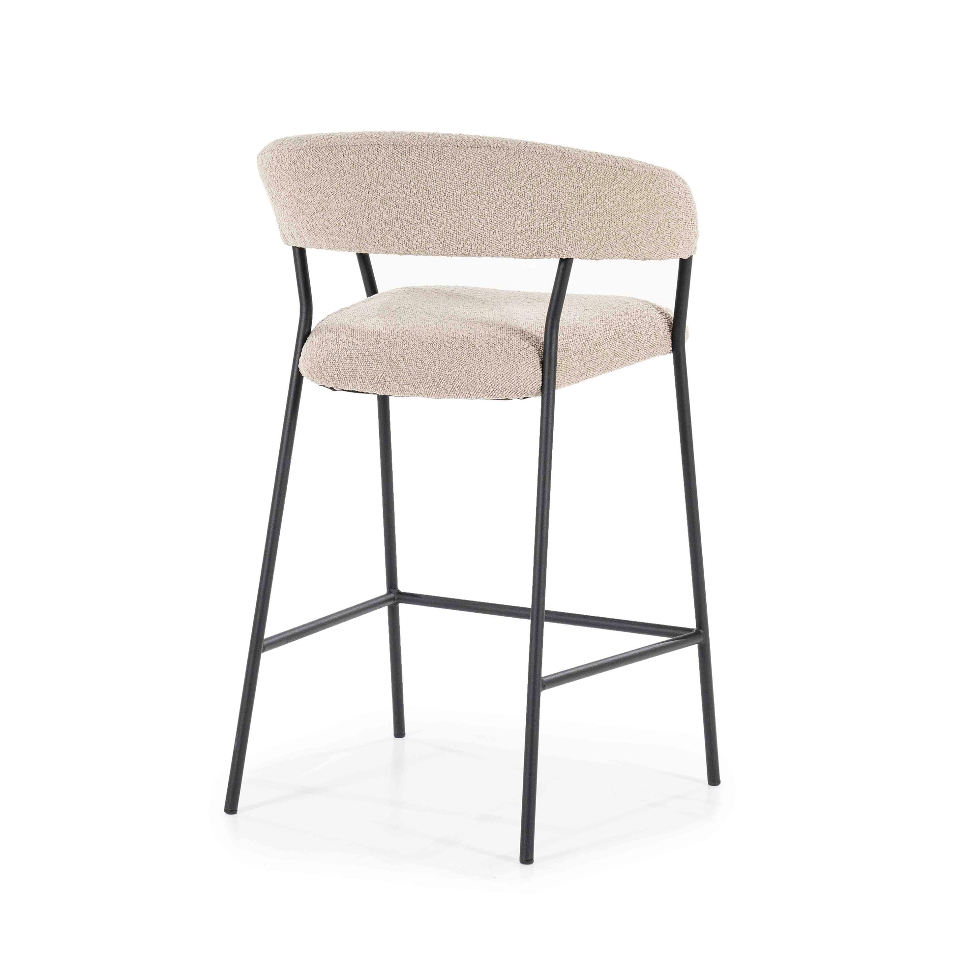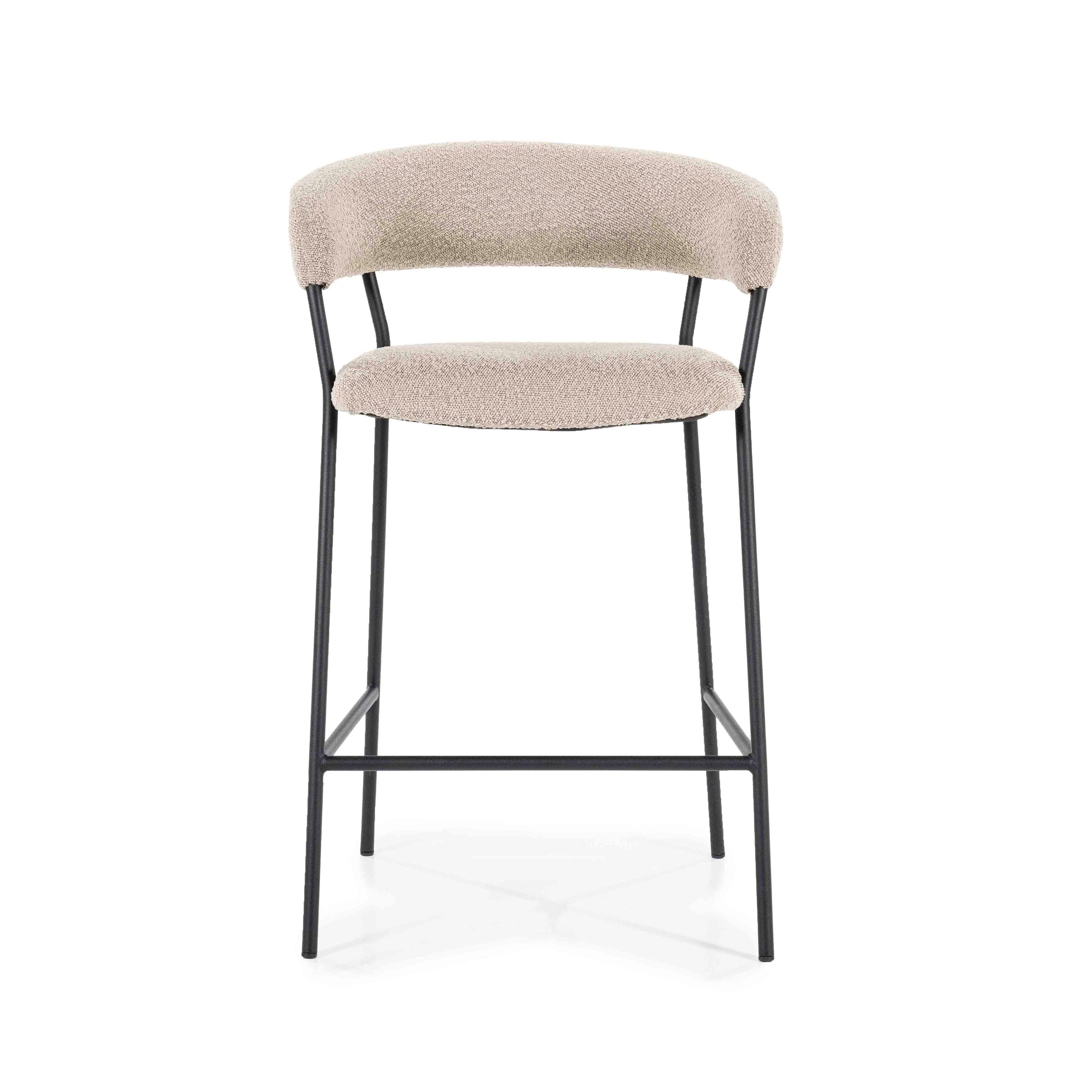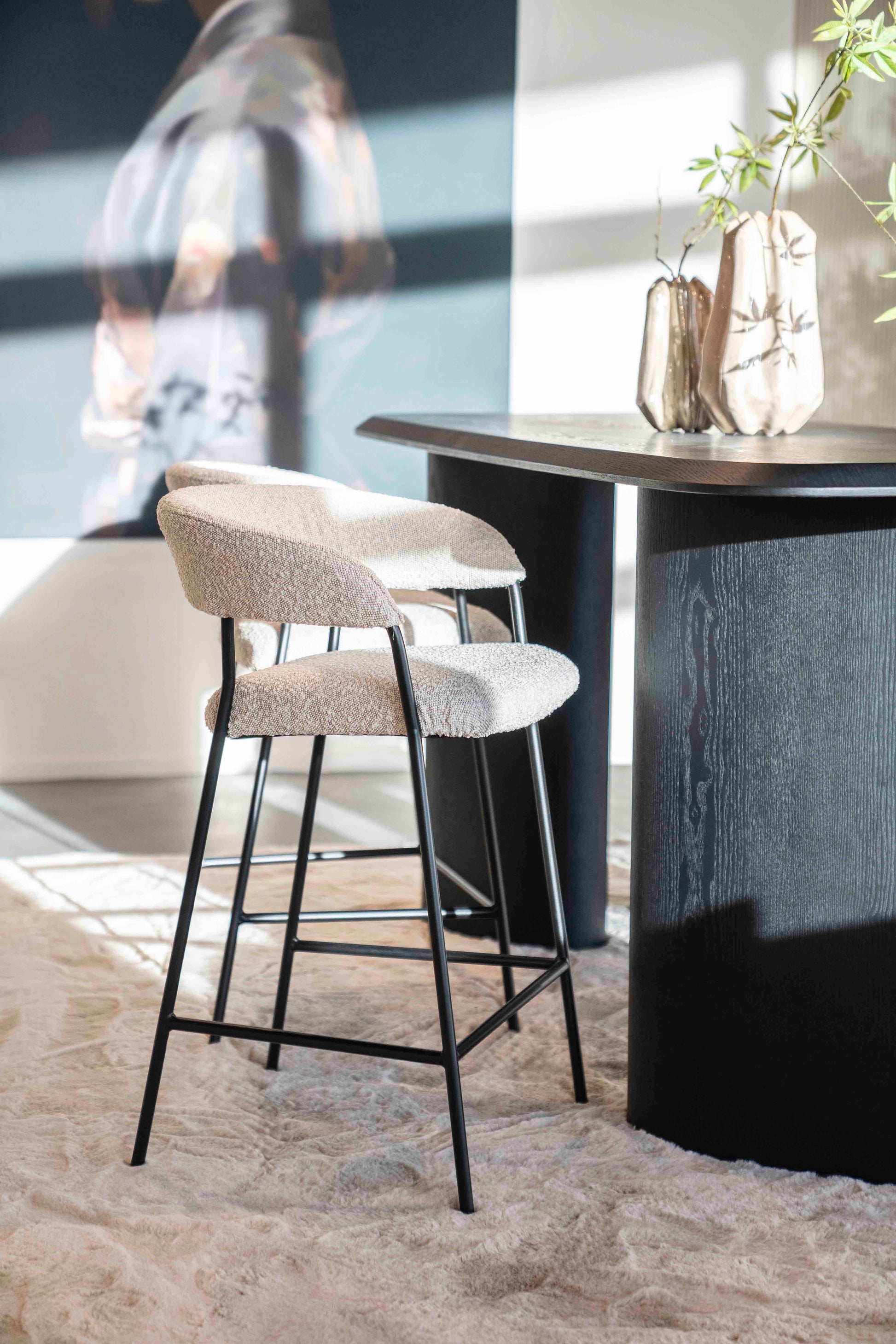 Denne stilrene barstolen kombinerer moderne design med behagelig sittekomfort. Det myke setet og den buede ryggen er trukket i en lekker bouclé-tekstil som gir stolen et lunt og eksklusivt uttrykk. Den sorte metallrammen tilfører et minimalistisk og industrielt preg som balanserer det myke stoffet perfekt.