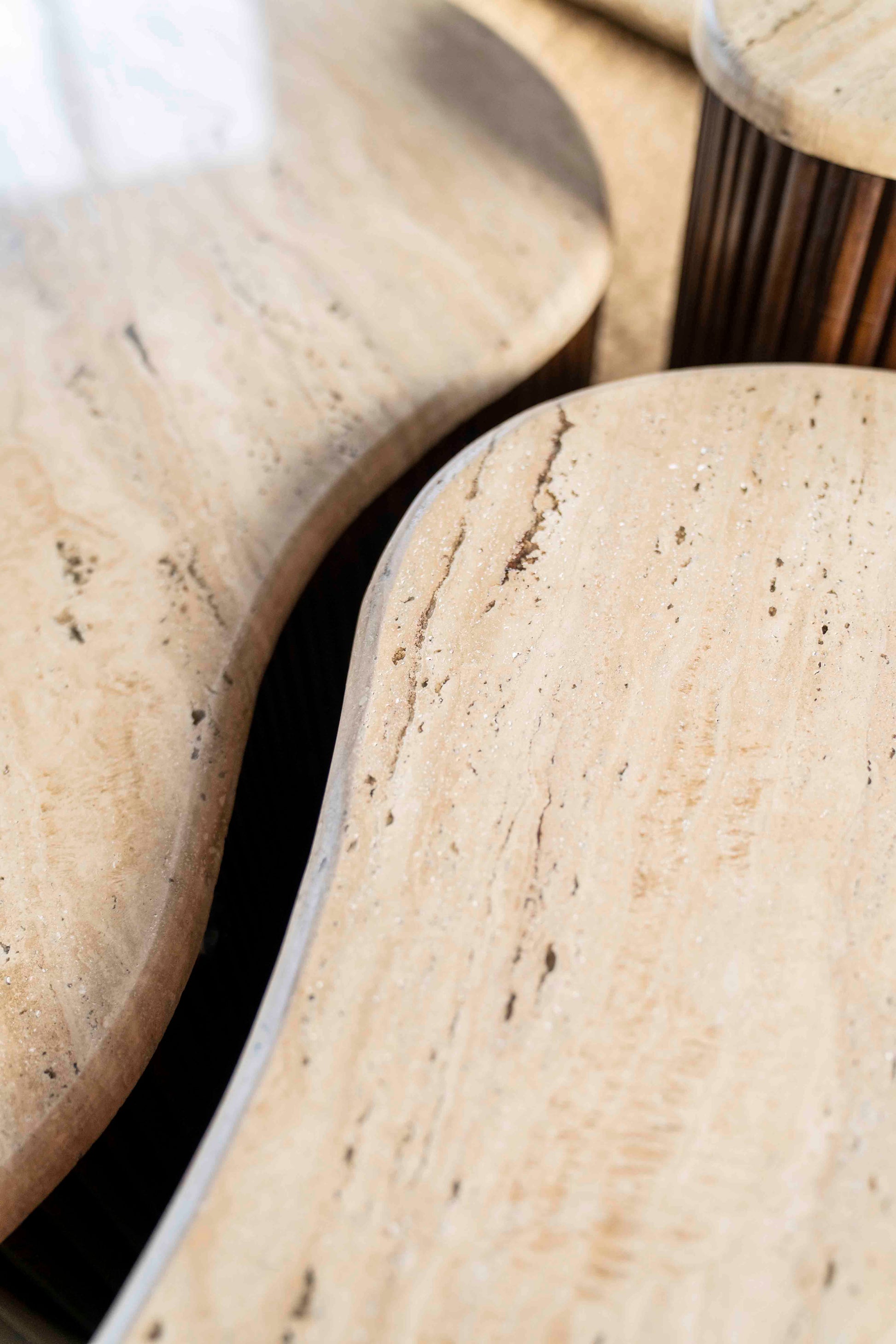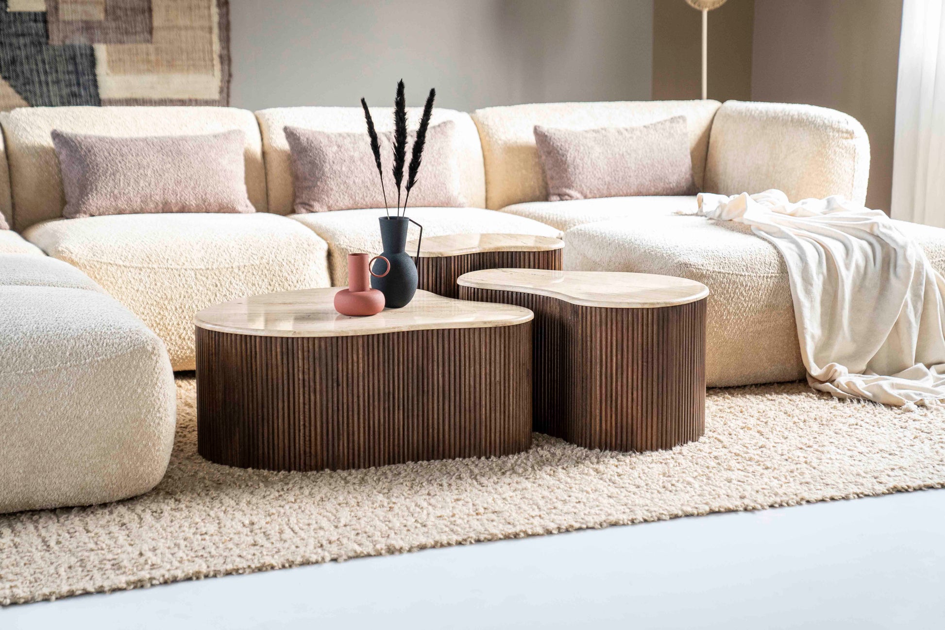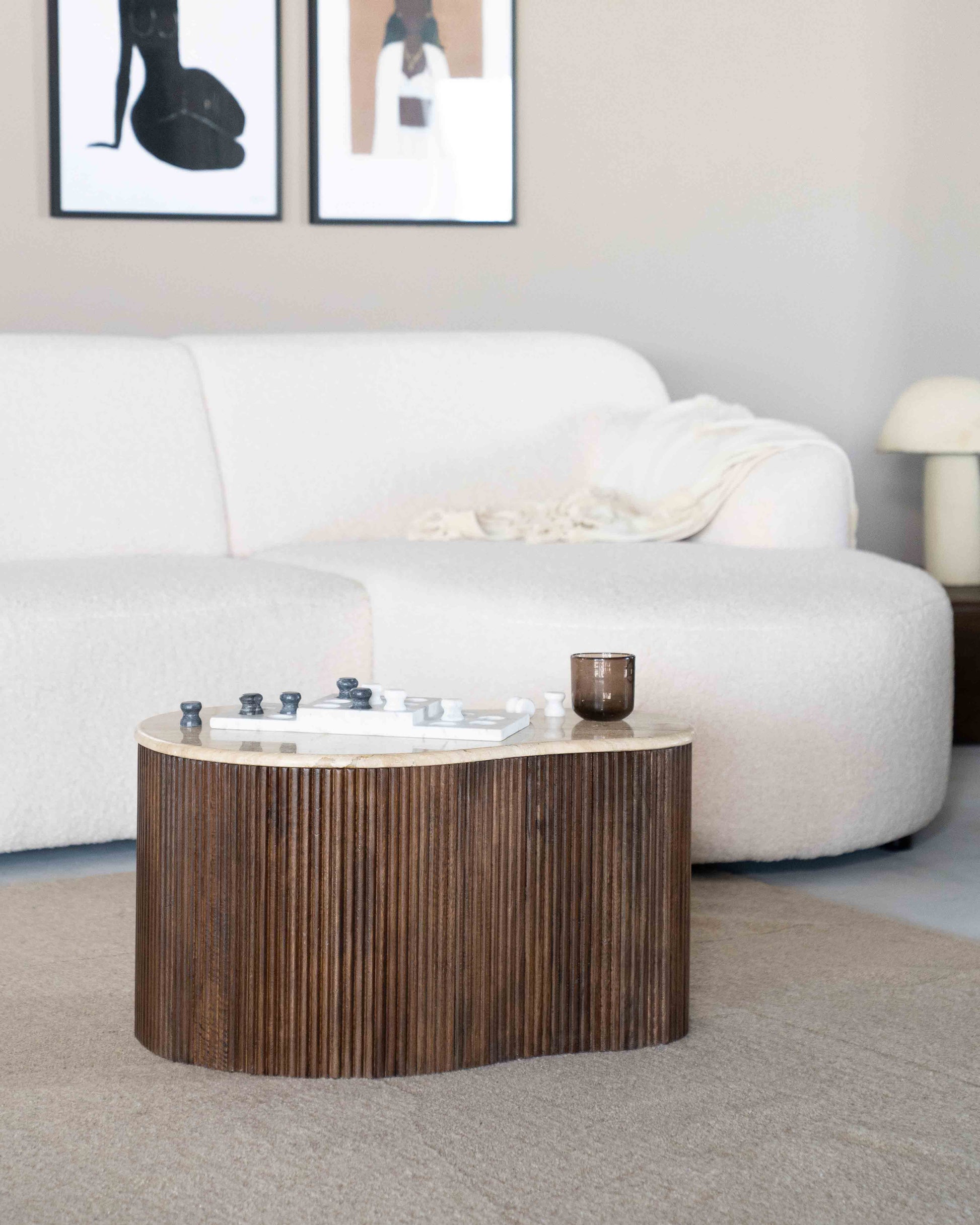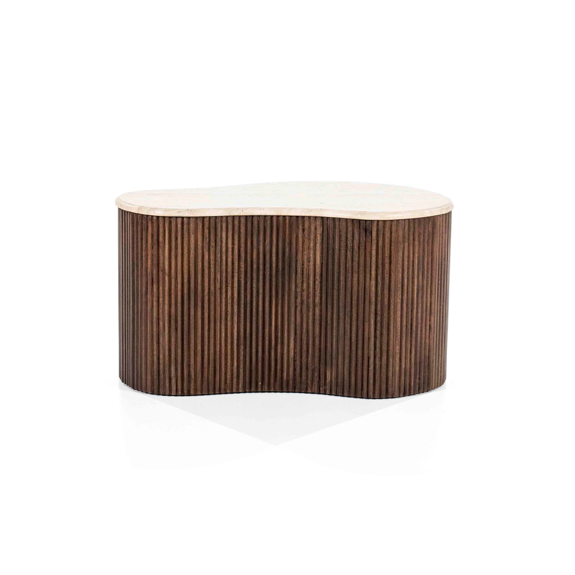 Et eksklusivt sofabord med myke, organiske linjer og en vakker kombinasjon av naturmaterialer. Bordet har en base i mørk mangotre med vertikale ribber som gir dybde og struktur, mens den lyse steintoppen tilfører et elegant og tidløst uttrykk.