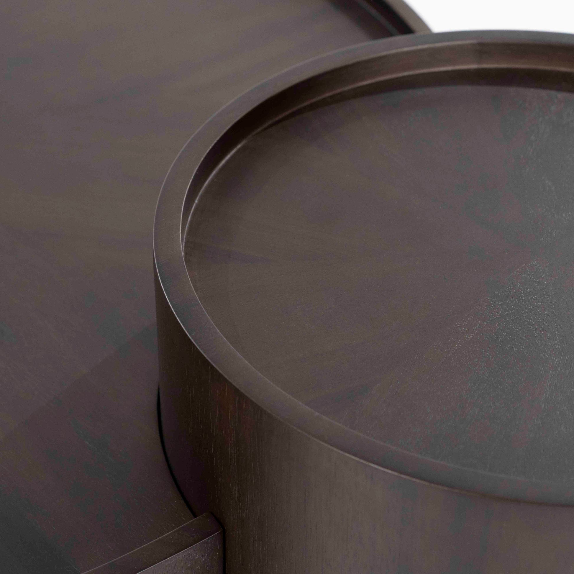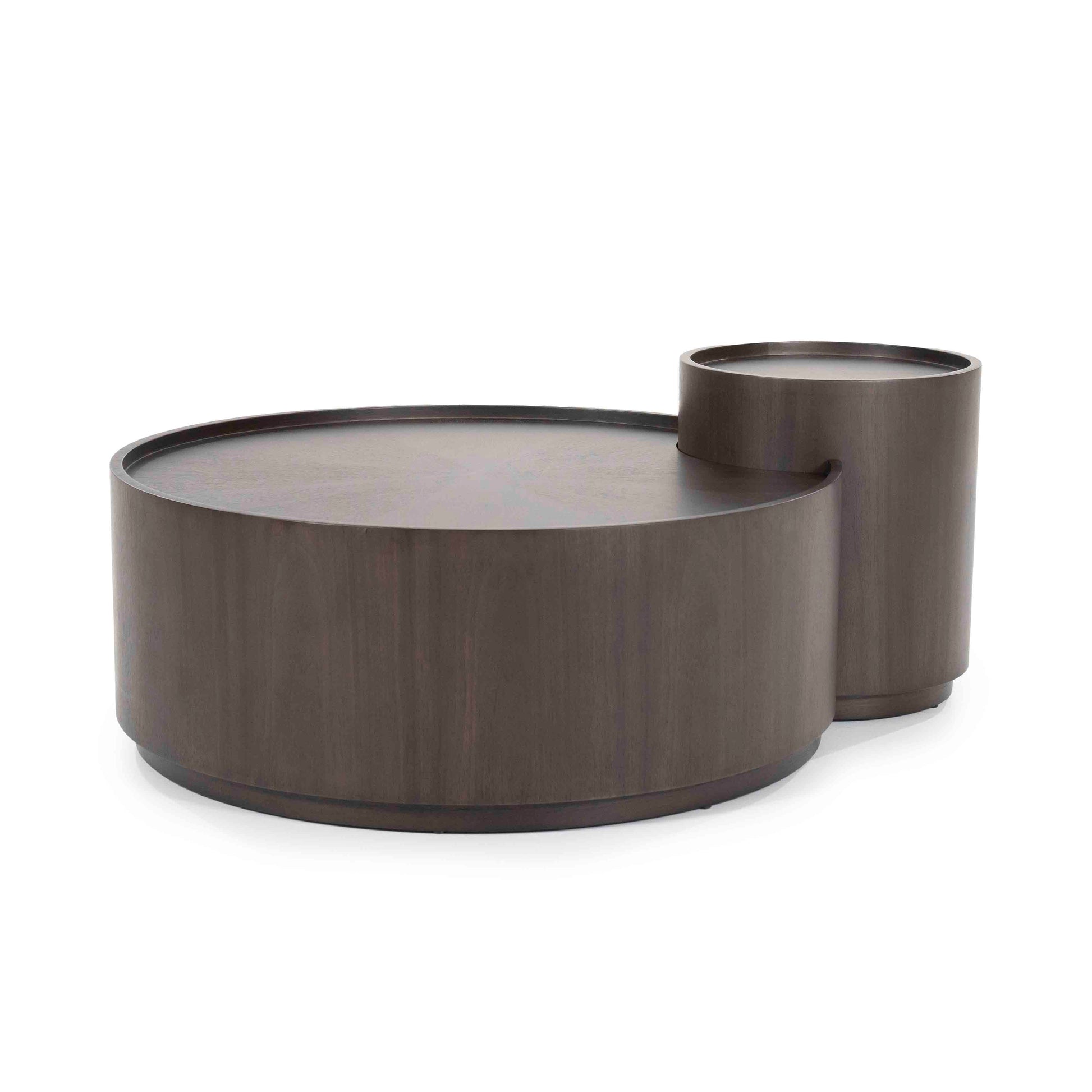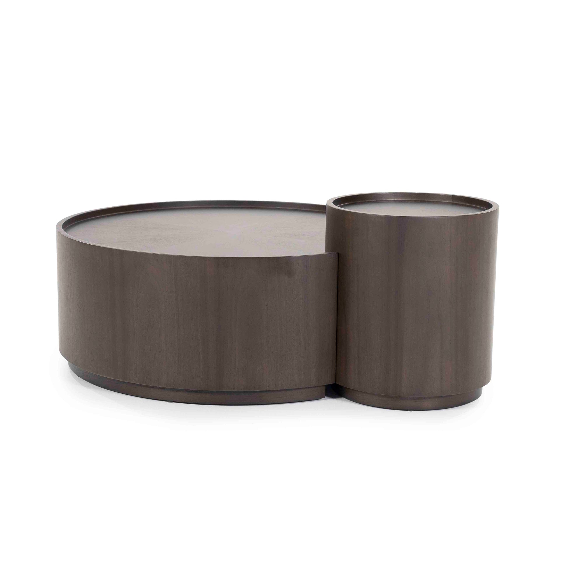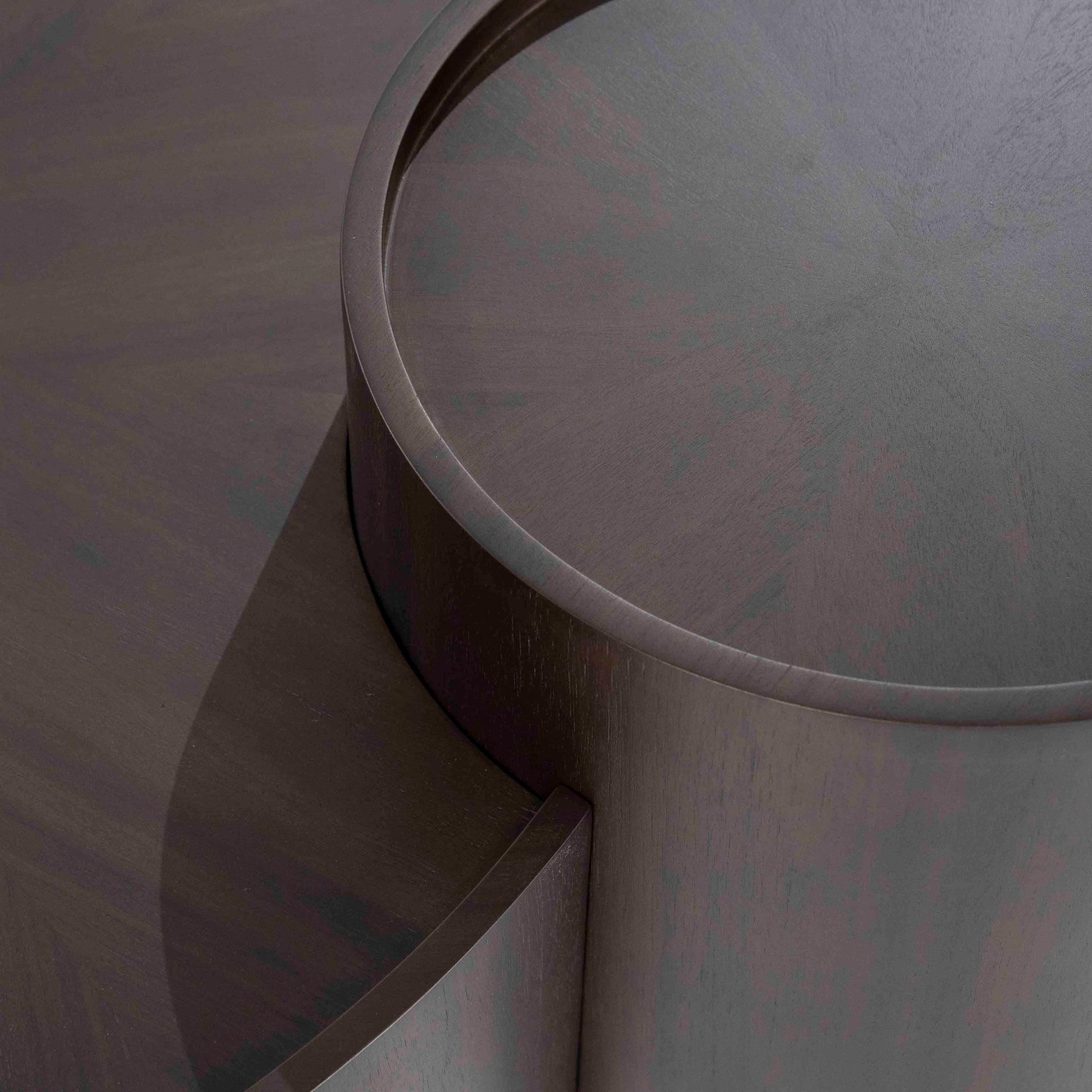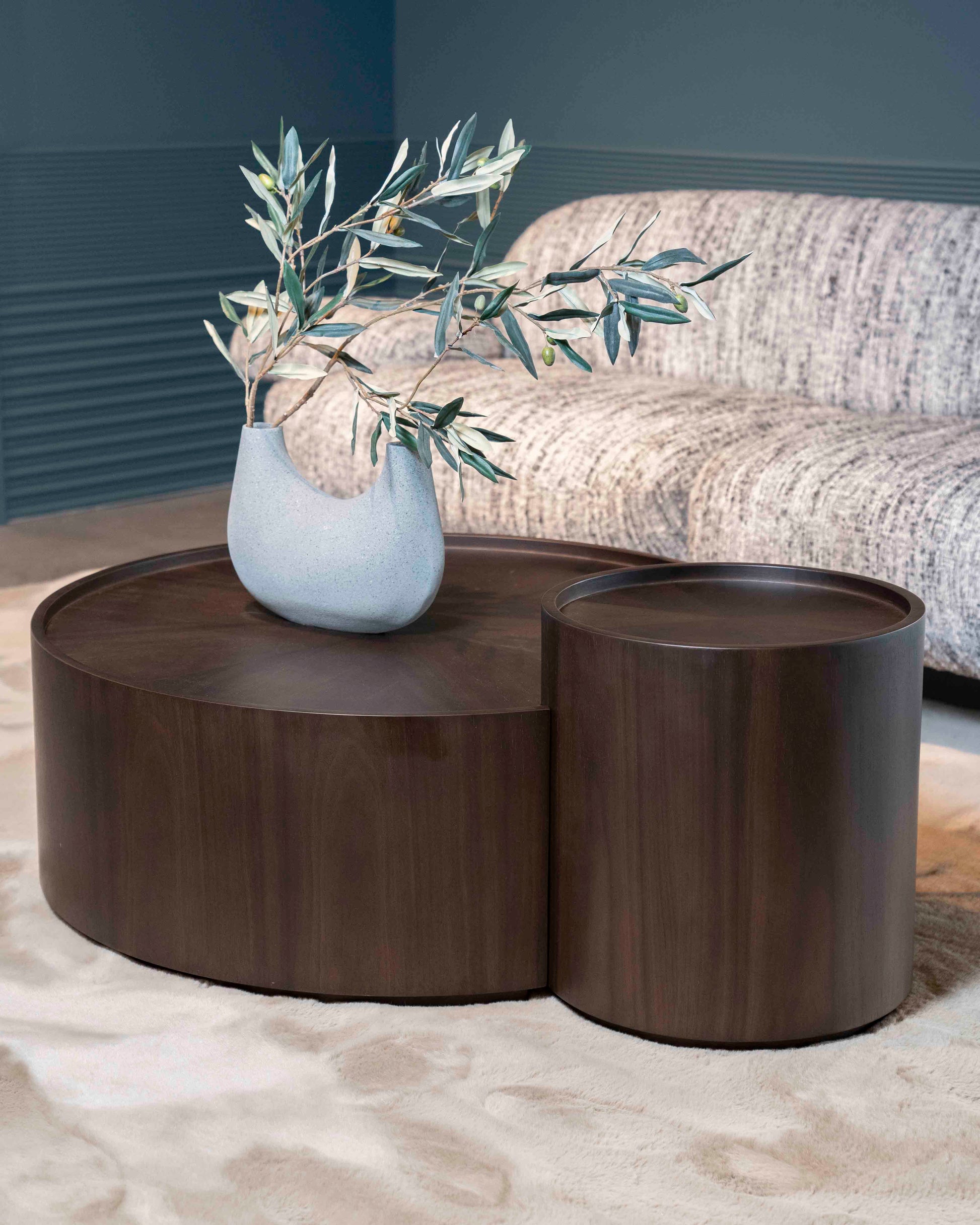 Et stilrent sofabord med avrundede former og en harmonisk asymmetri. Bordet består av to sammenkoblede sylindriske former som gir et skulpturelt og balansert uttrykk. Den mørke eikefinéren gir et eksklusivt og tidløst preg – perfekt for moderne stuer.