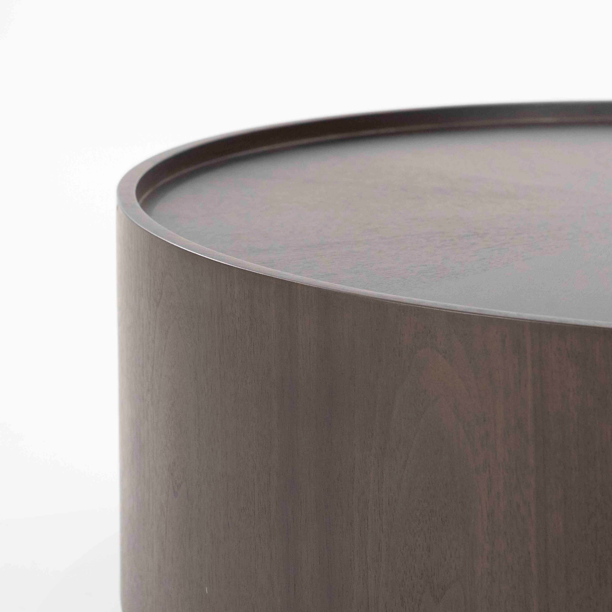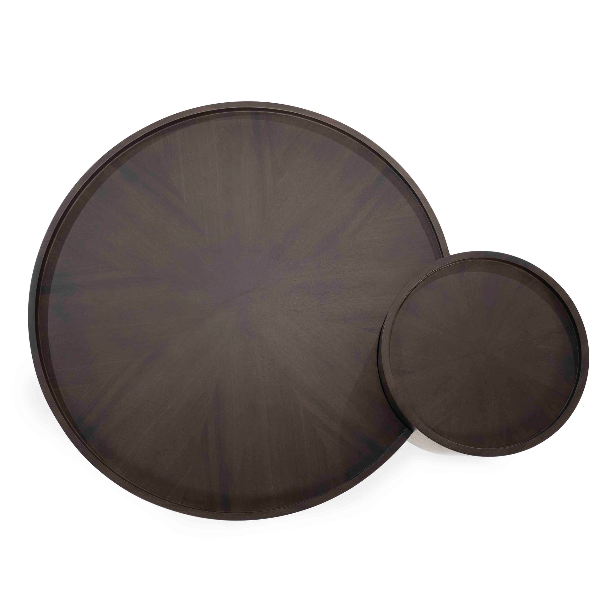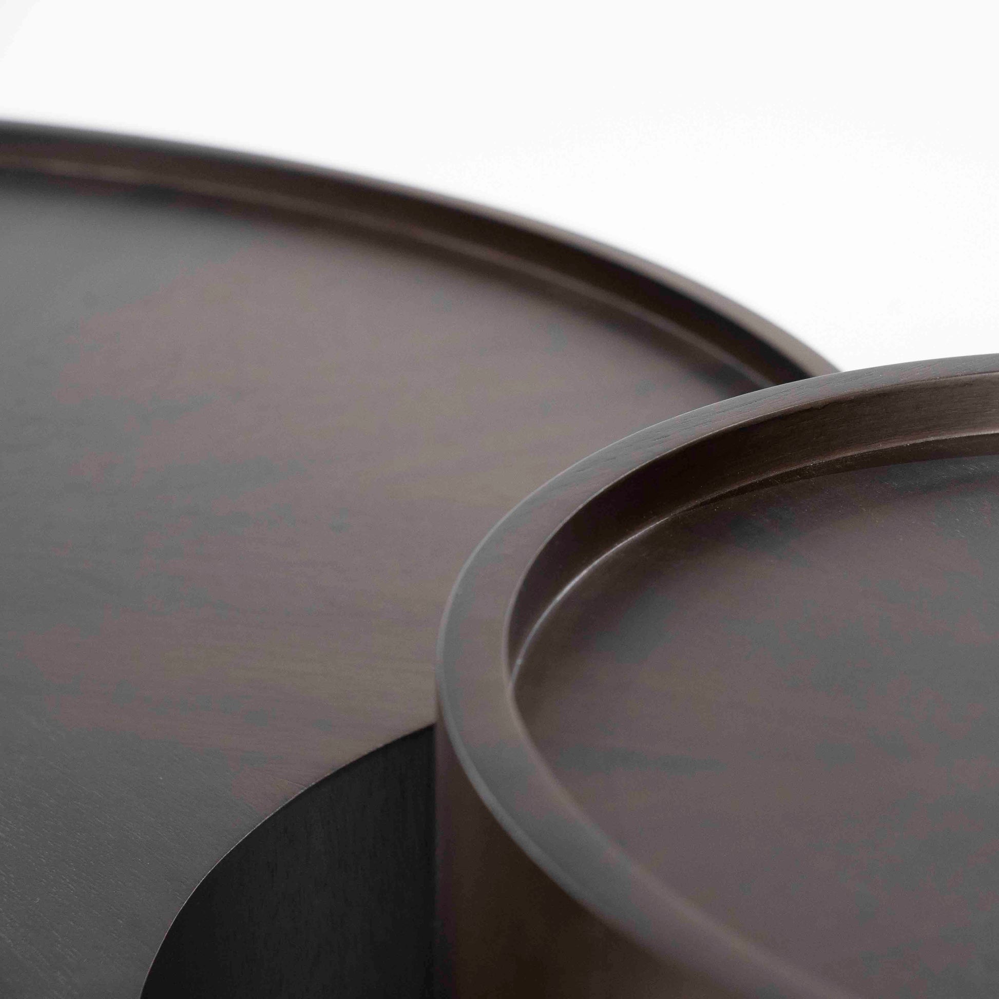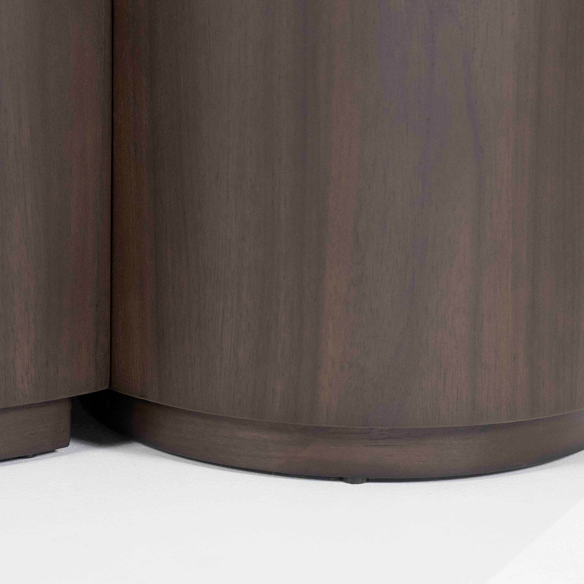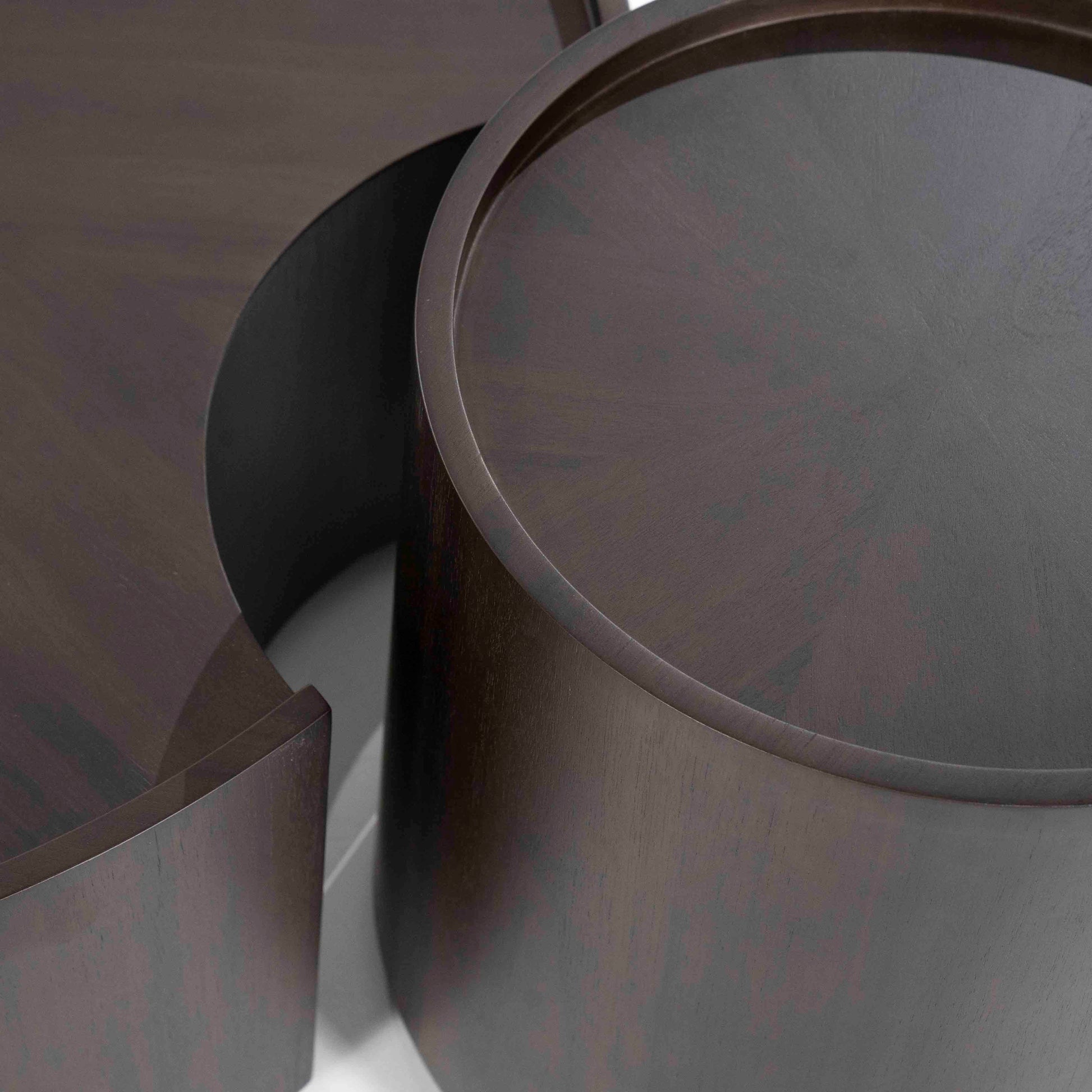 Et stilrent sofabord med avrundede former og en harmonisk asymmetri. Bordet består av to sammenkoblede sylindriske former som gir et skulpturelt og balansert uttrykk. Den mørke eikefinéren gir et eksklusivt og tidløst preg – perfekt for moderne stuer.