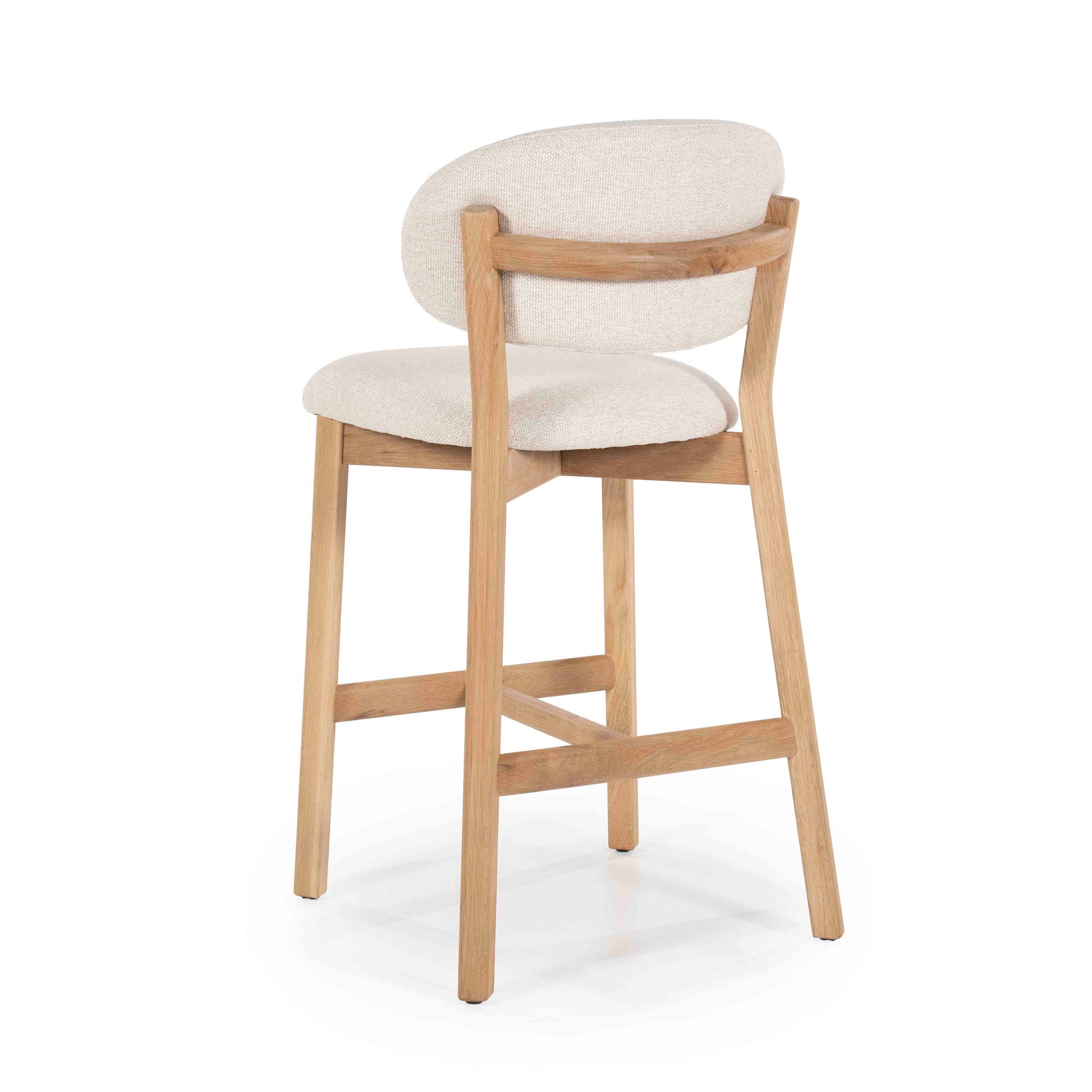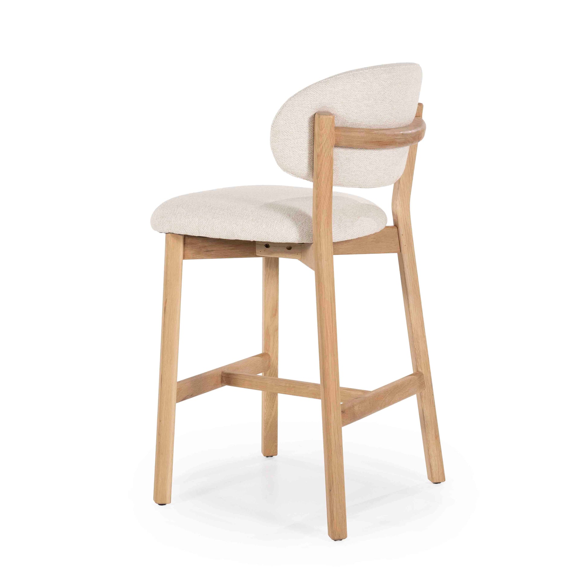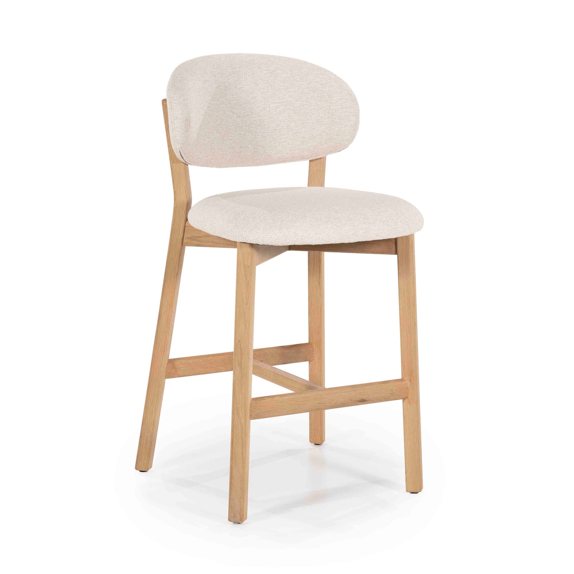 Denne barstolen kombinerer myke linjer med et tidløst, skandinavisk uttrykk. Understellet i lys eik gir en varm og naturlig følelse, mens det polstrede setet og den avrundede ryggen i lys tekstil sørger for god komfort. Et ideelt valg for kjøkkenøyen eller barløsningen.