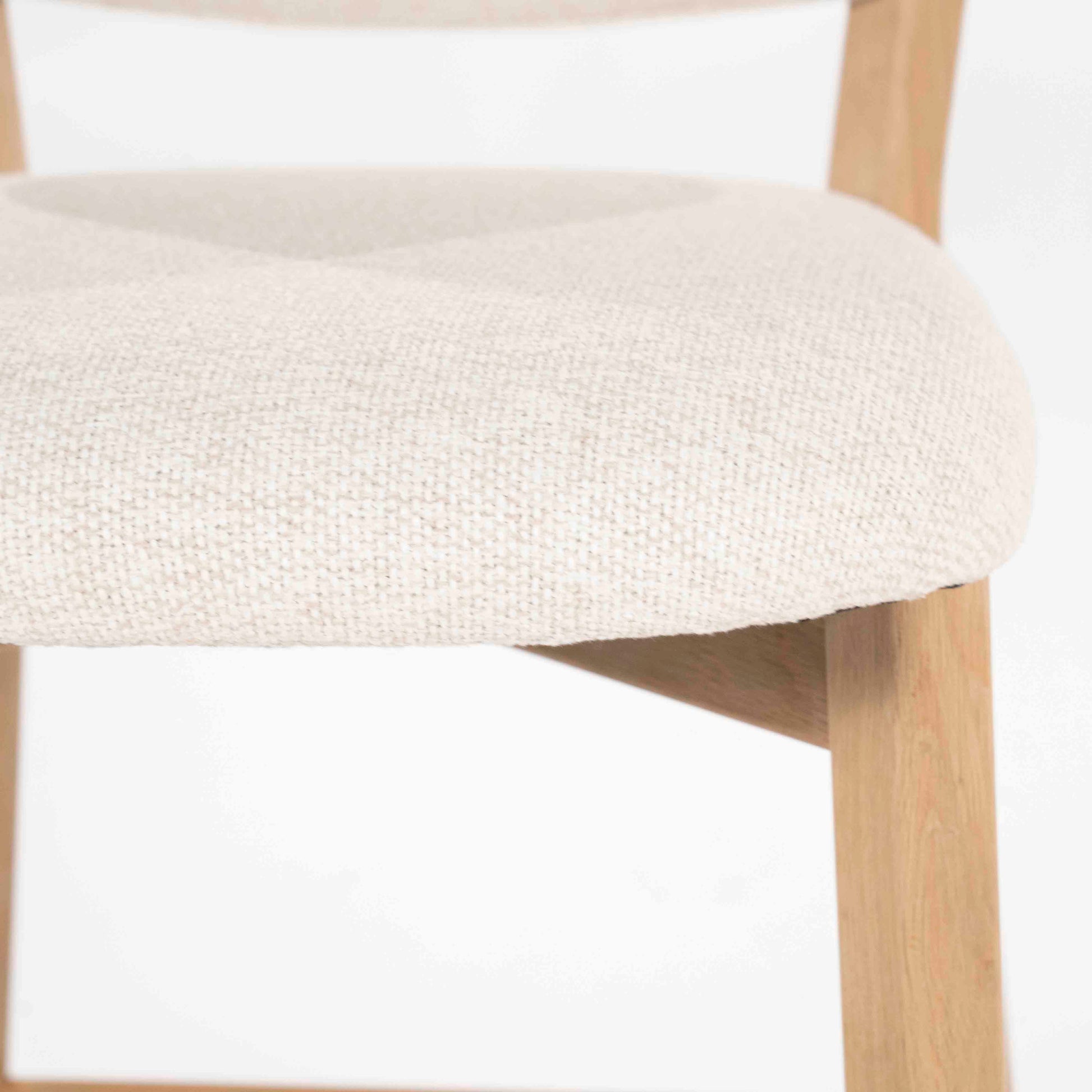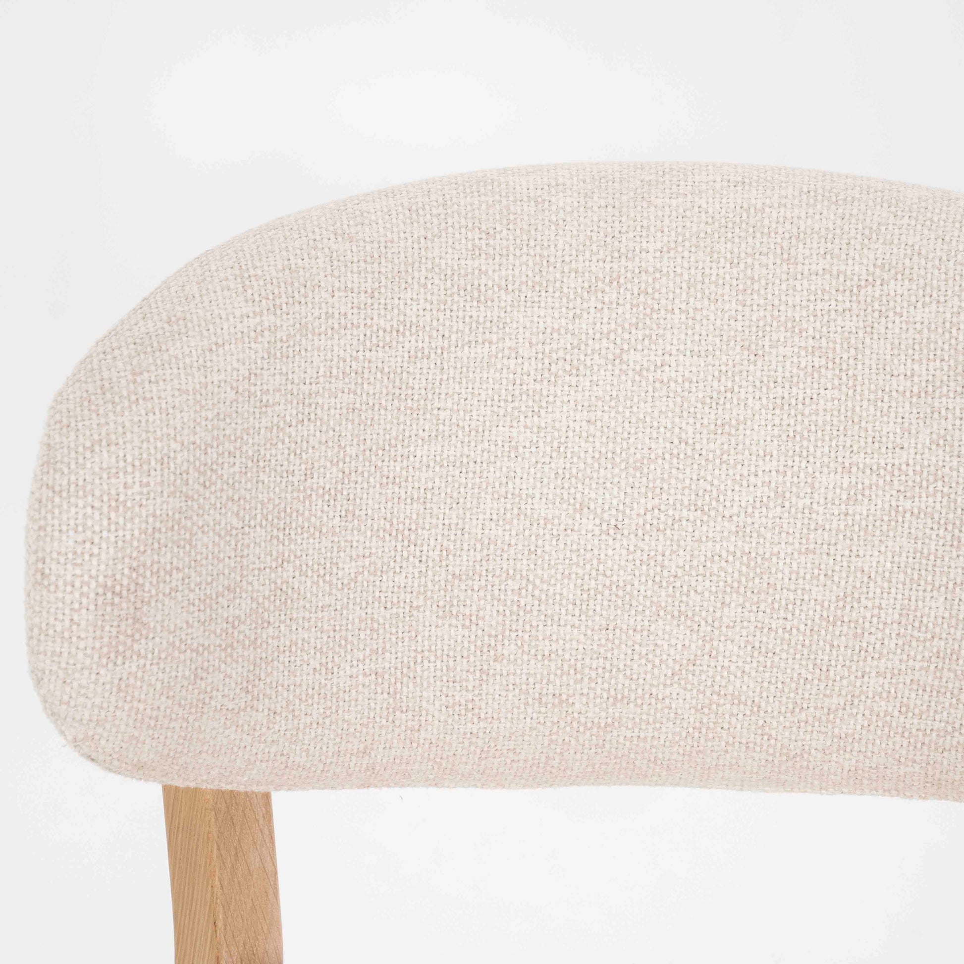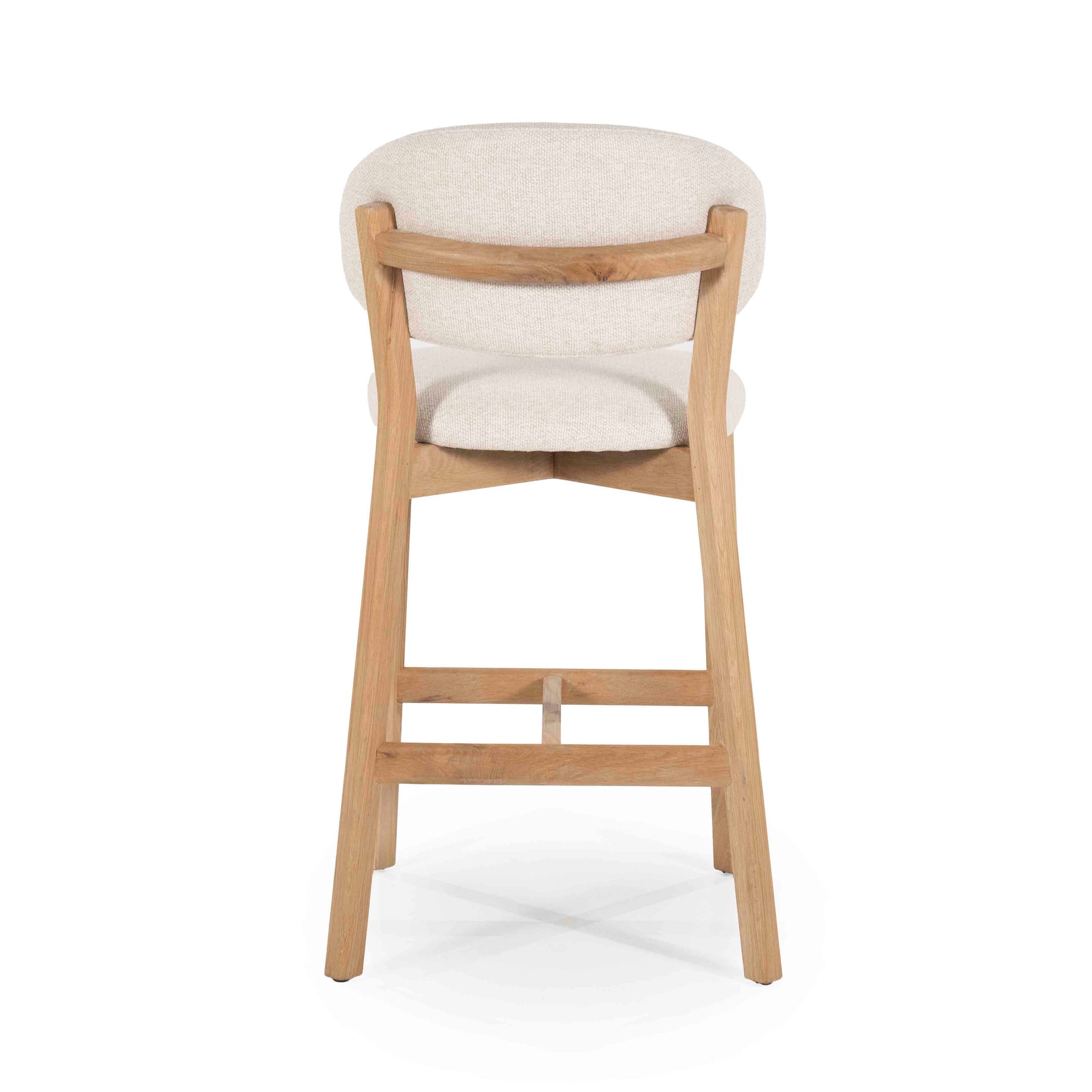 Denne barstolen kombinerer myke linjer med et tidløst, skandinavisk uttrykk. Understellet i lys eik gir en varm og naturlig følelse, mens det polstrede setet og den avrundede ryggen i lys tekstil sørger for god komfort. Et ideelt valg for kjøkkenøyen eller barløsningen.