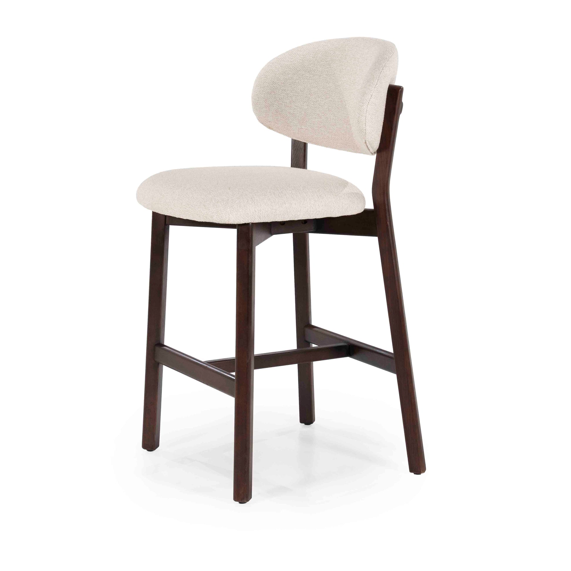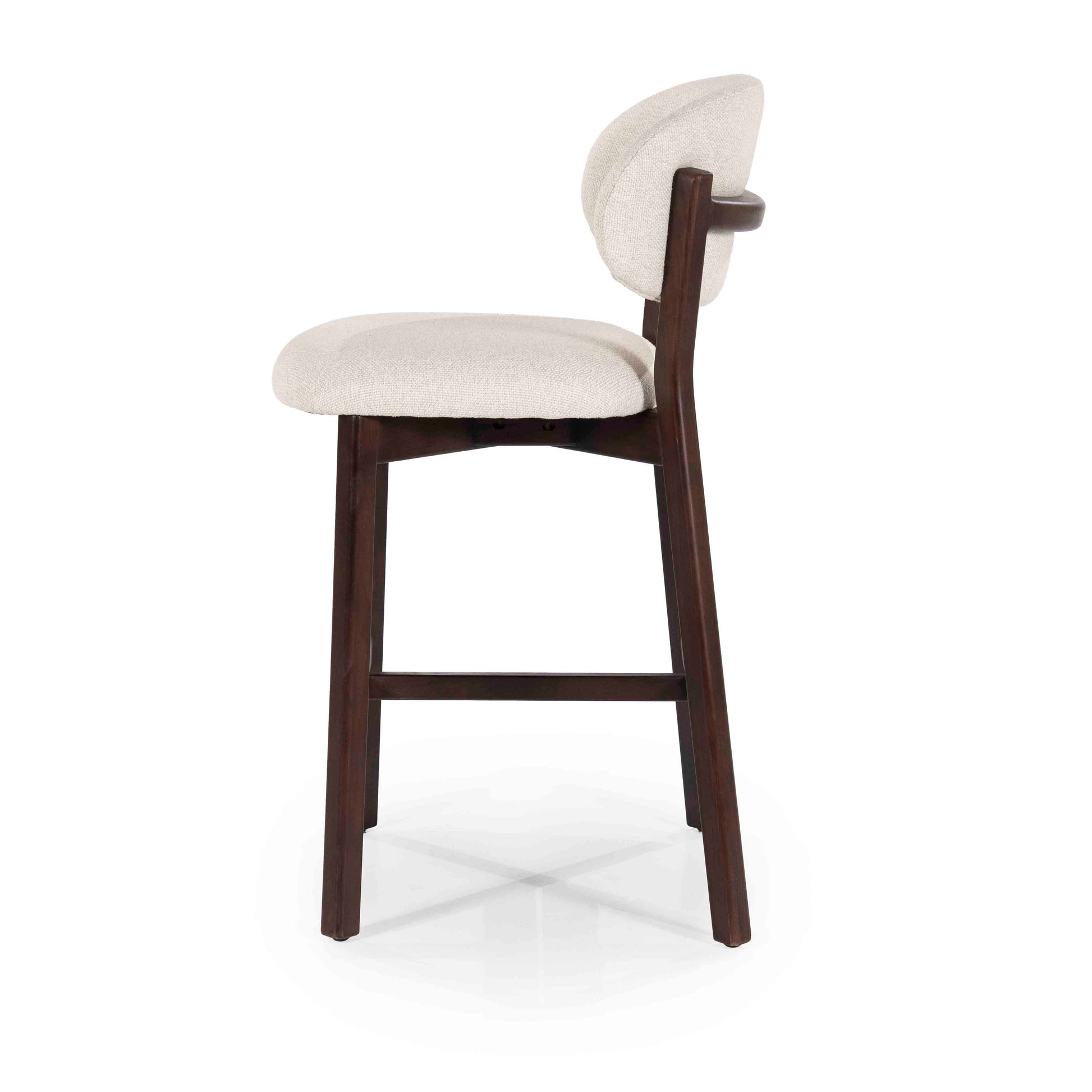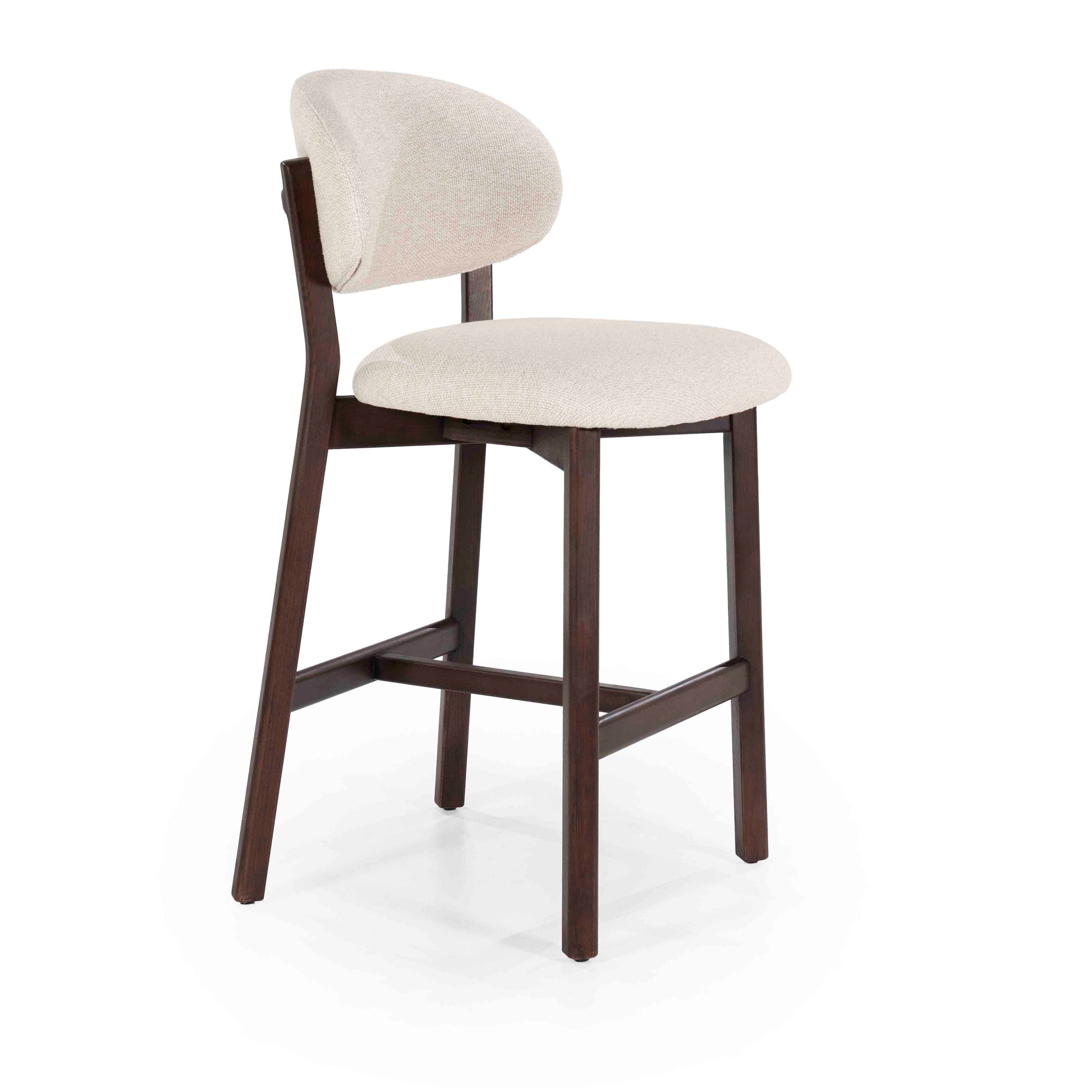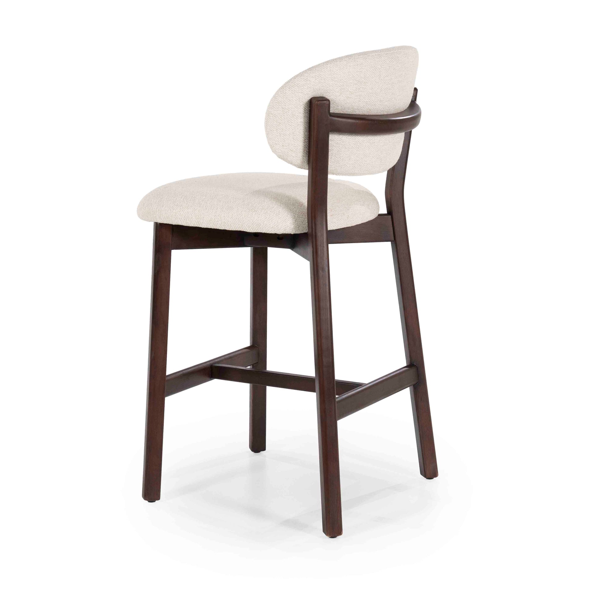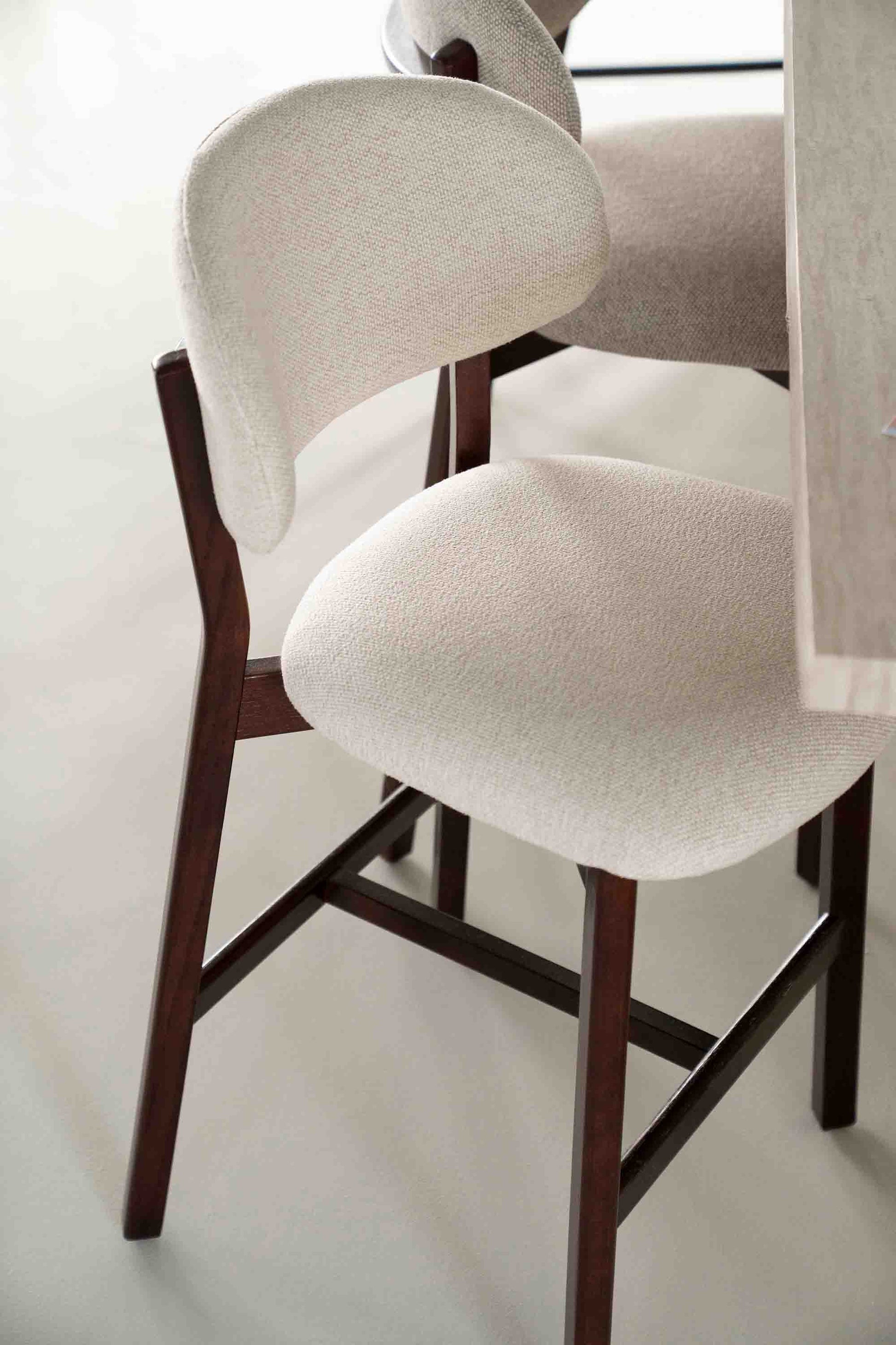 Denne elegante barstolen kombinerer et tidløst design med funksjonell komfort. Det solide understellet i mørkt tre gir et eksklusivt uttrykk, mens det polstrede setet og den avrundede ryggen i lys tekstil gir god sittekomfort.