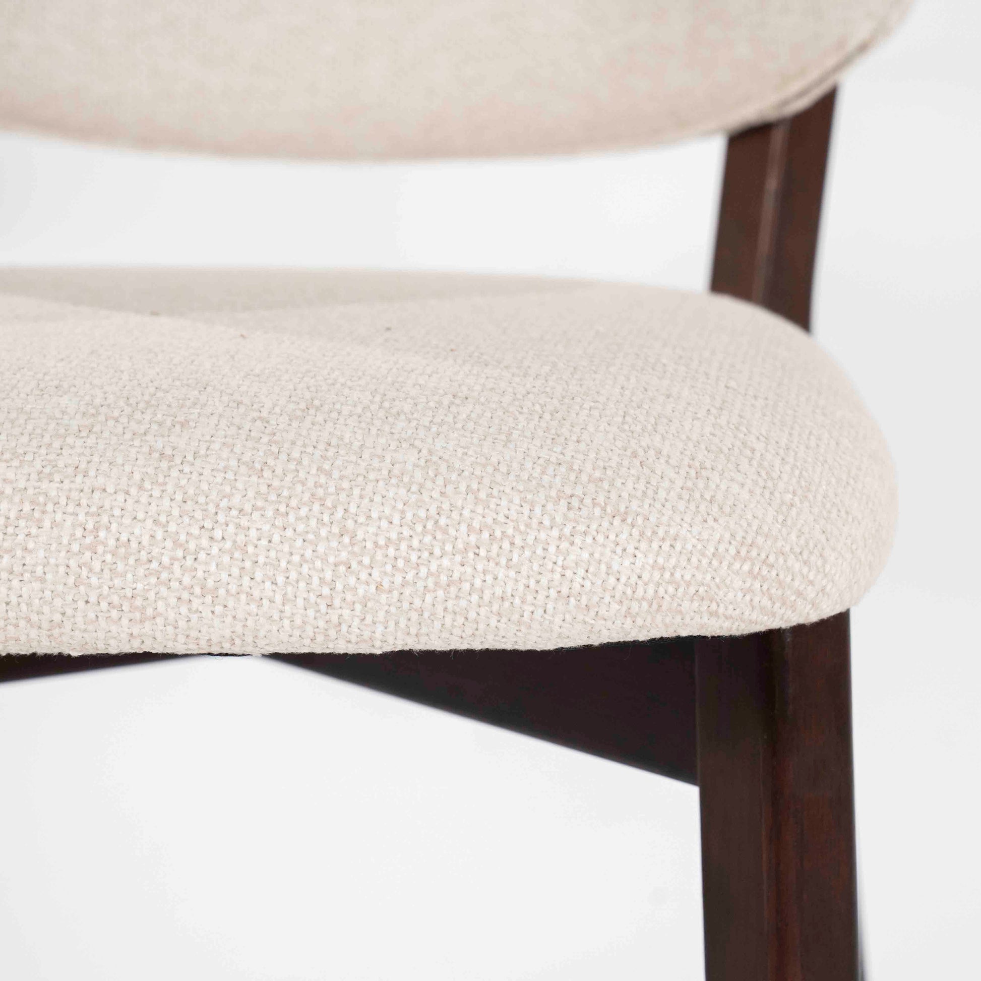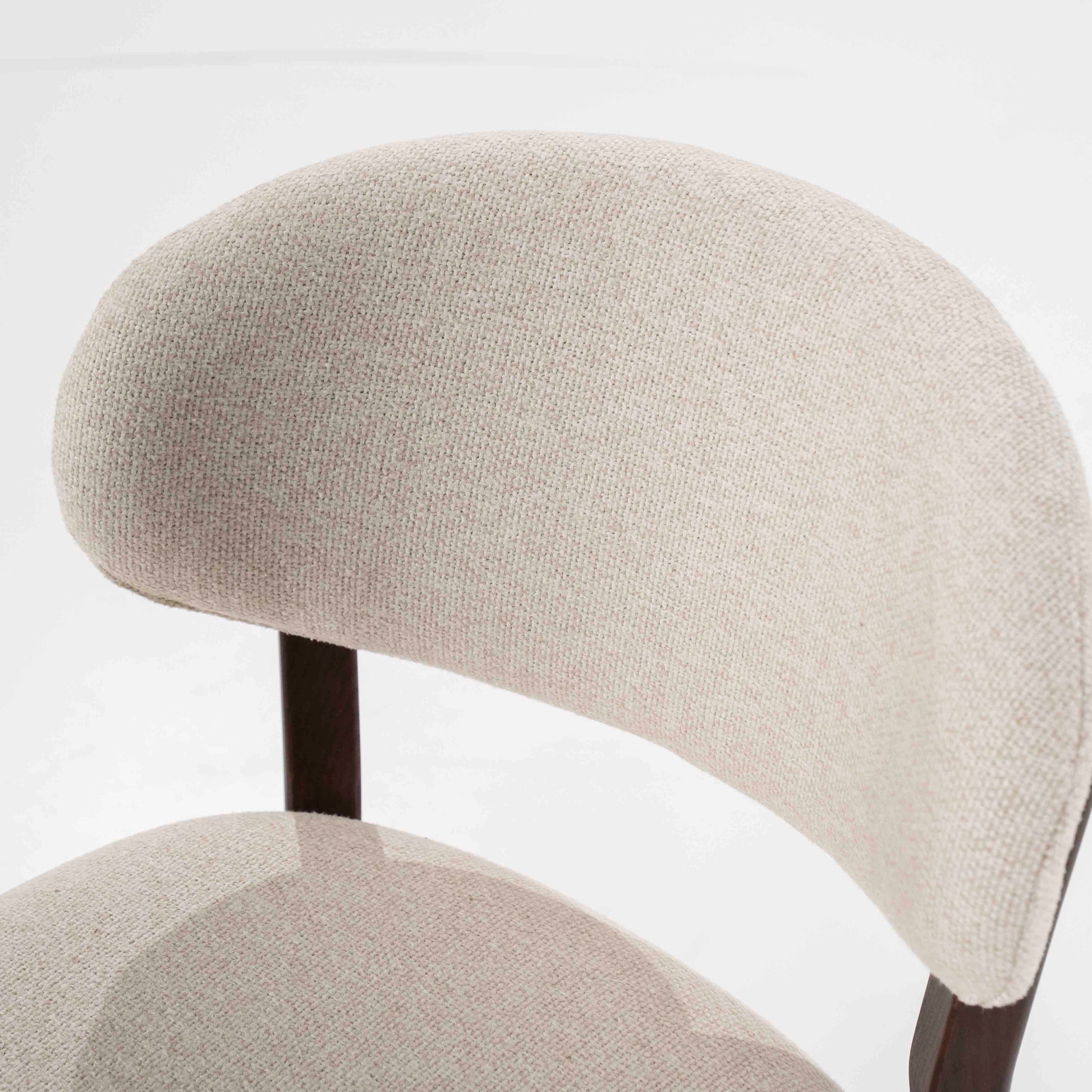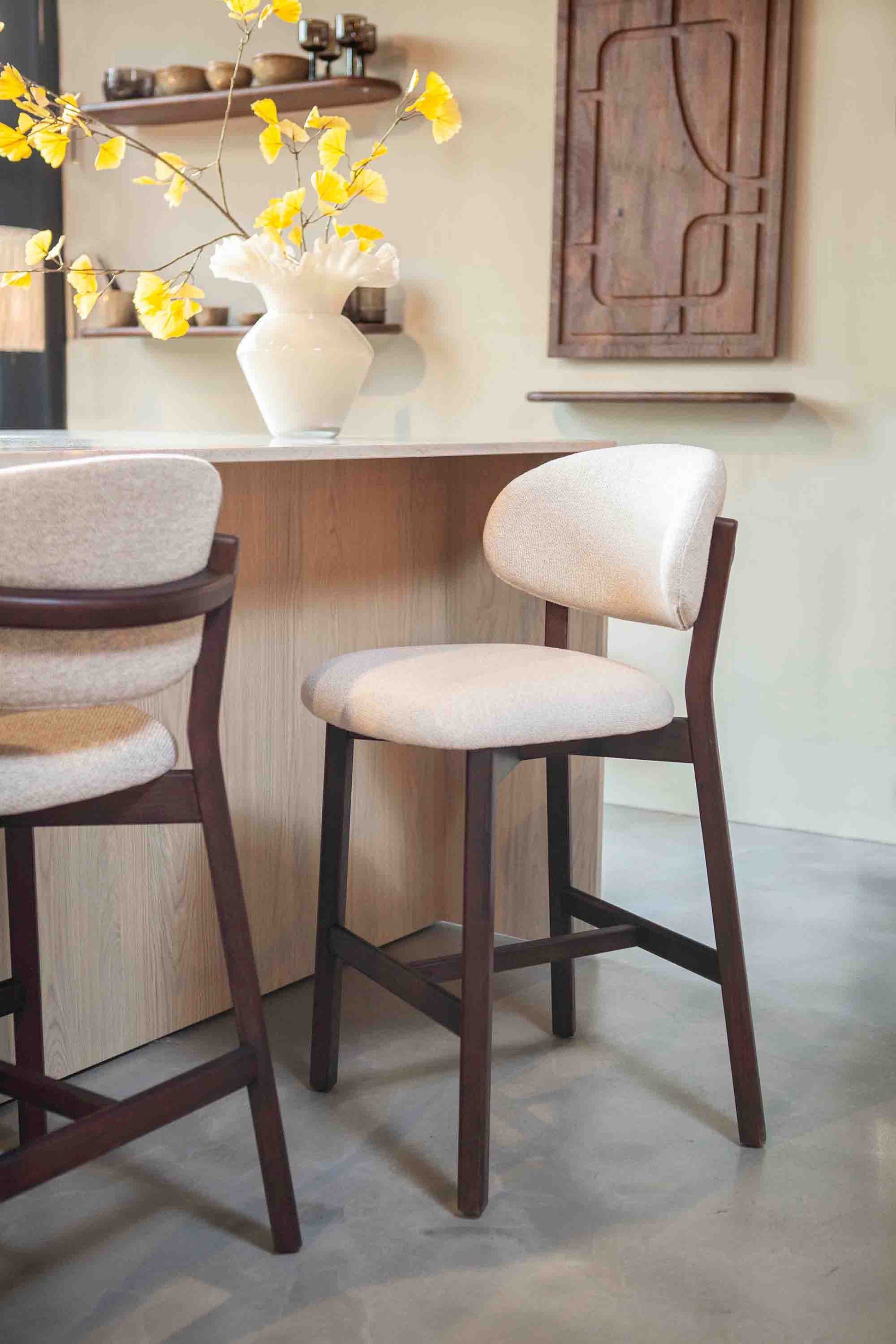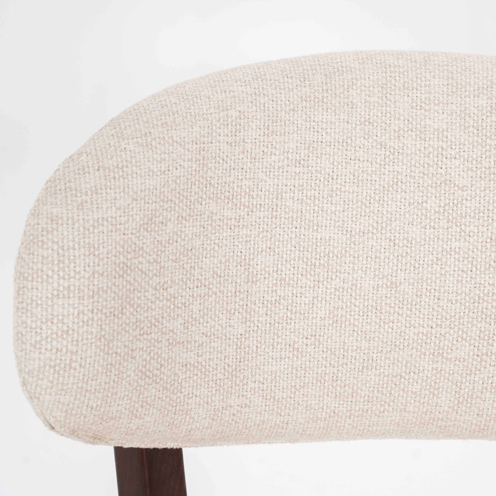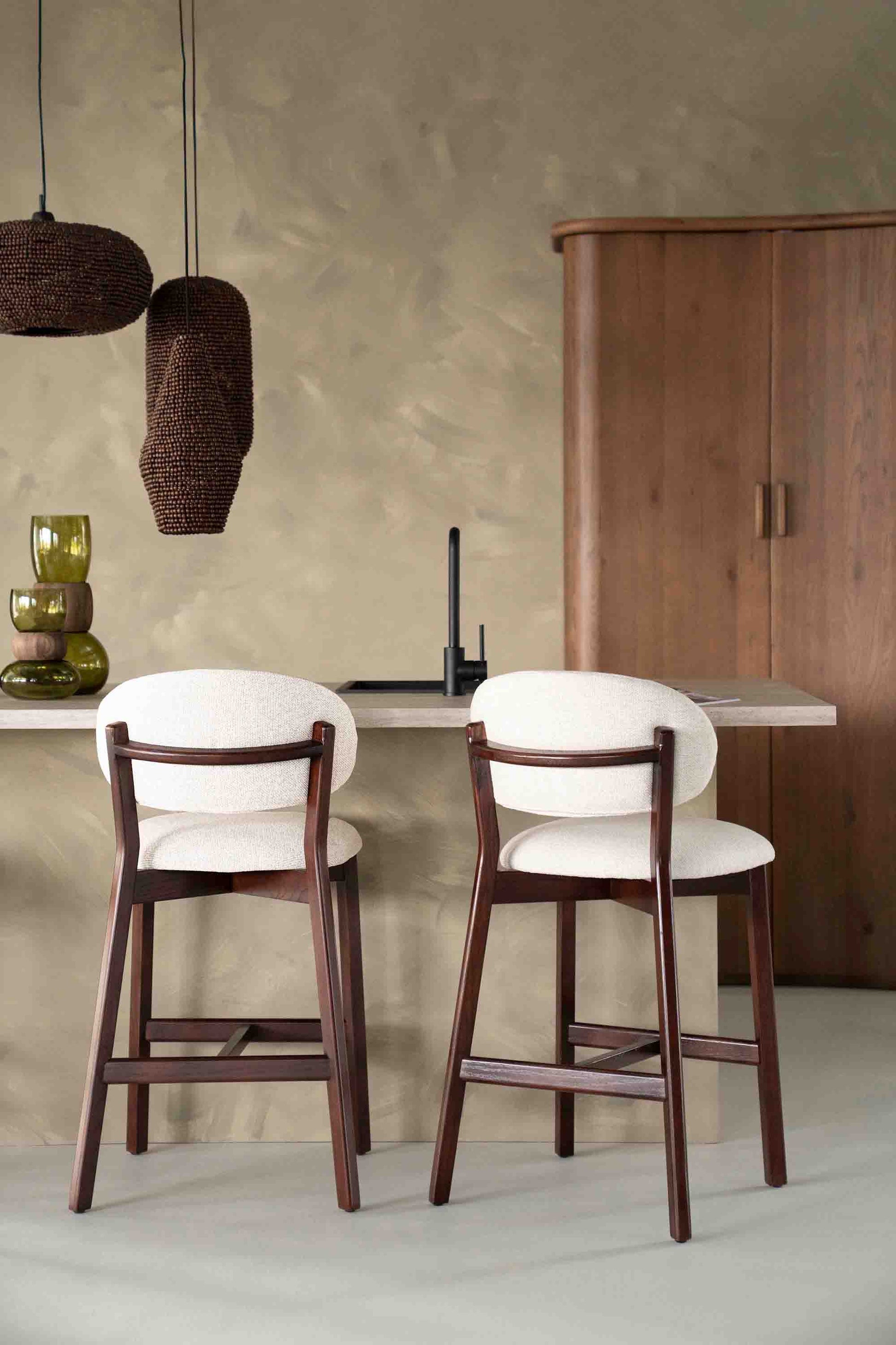 Denne elegante barstolen kombinerer et tidløst design med funksjonell komfort. Det solide understellet i mørkt tre gir et eksklusivt uttrykk, mens det polstrede setet og den avrundede ryggen i lys tekstil gir god sittekomfort.