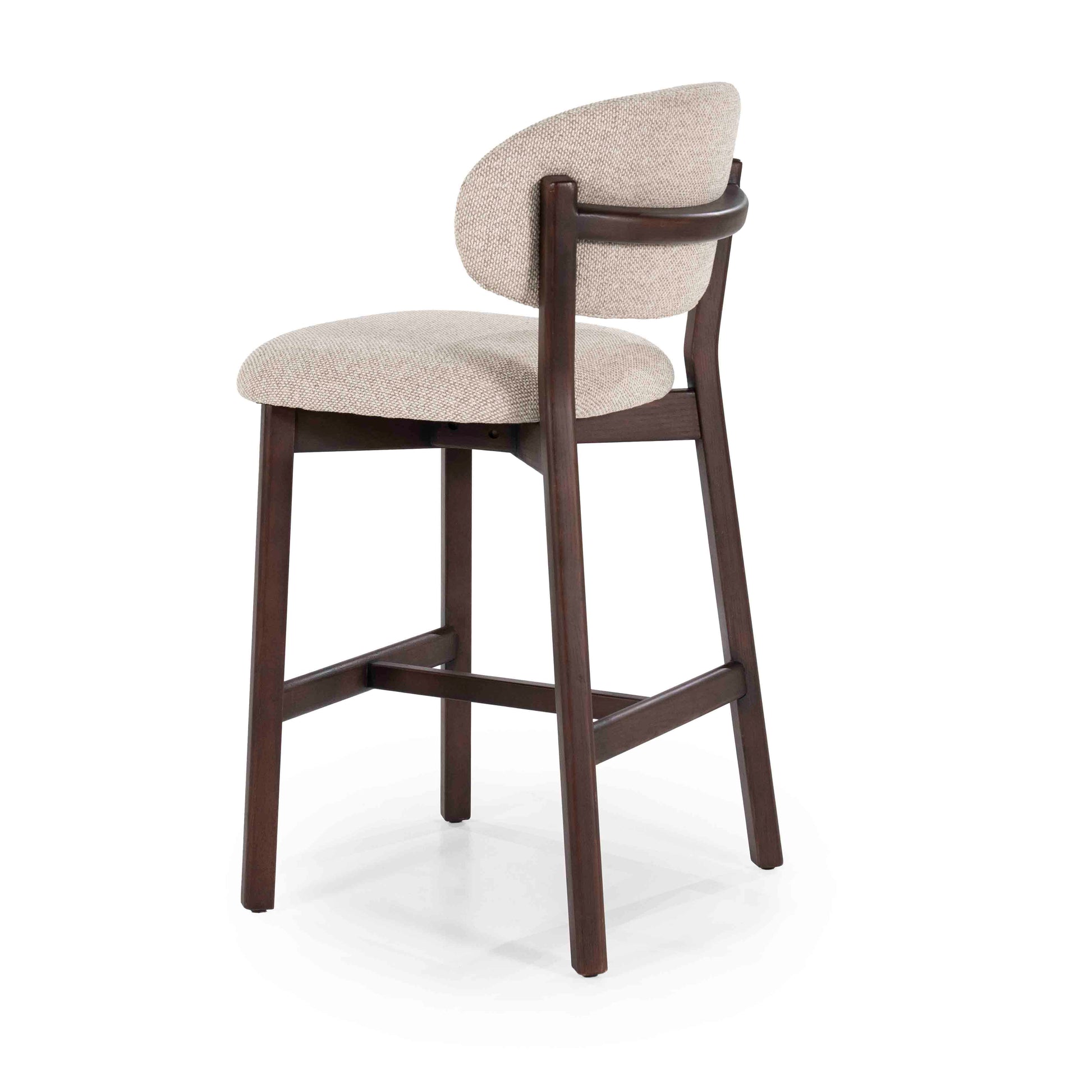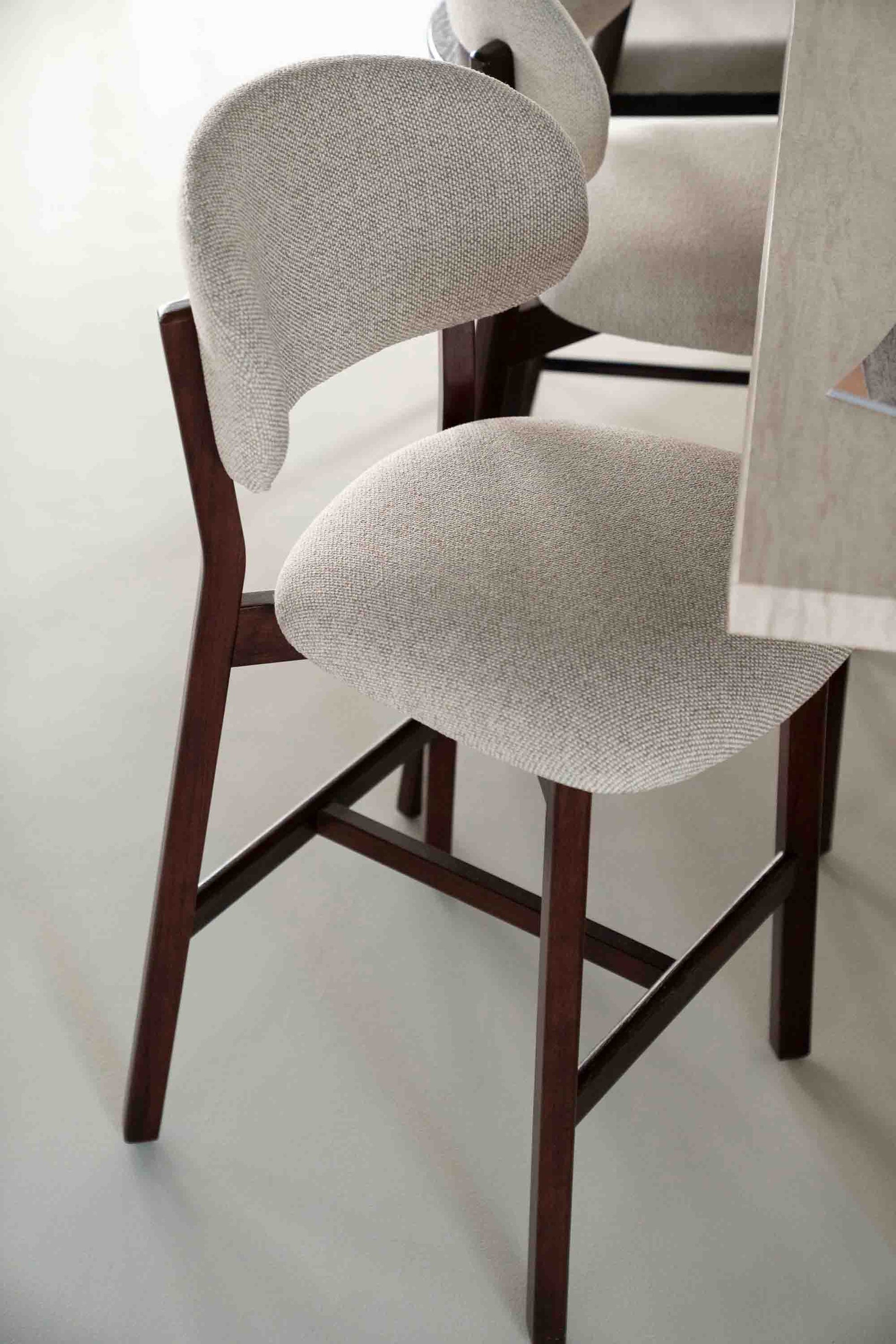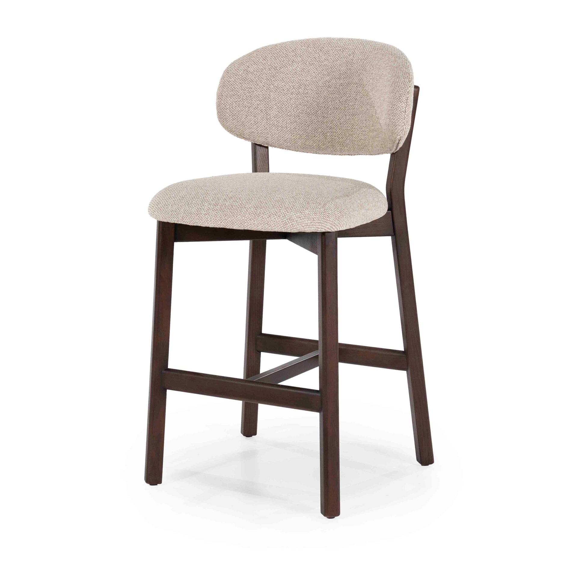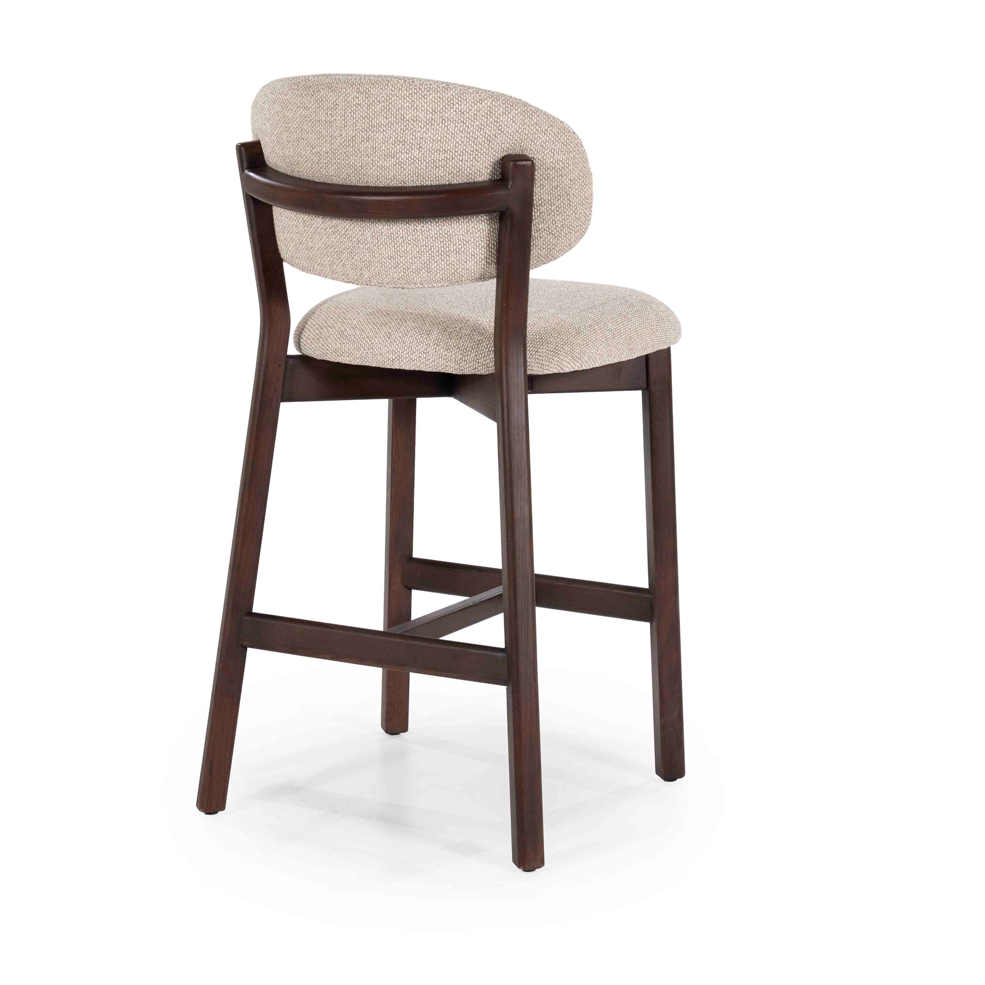 Denne elegante barstolen kombinerer et tidløst design med funksjonell komfort. Det solide understellet i mørkt tre gir et eksklusivt uttrykk, mens det polstrede setet og den avrundede ryggen i lys tekstil gir god sittekomfort.
