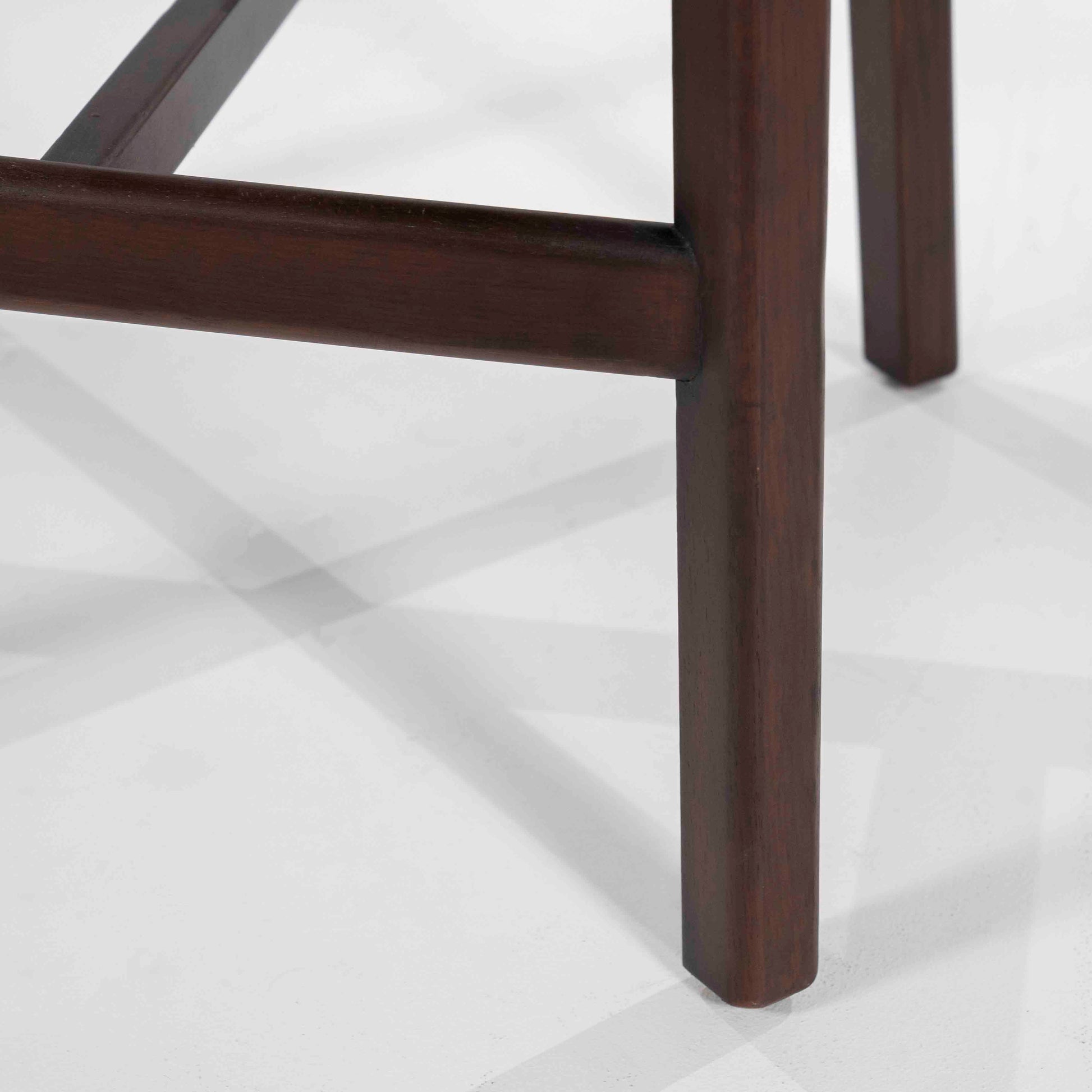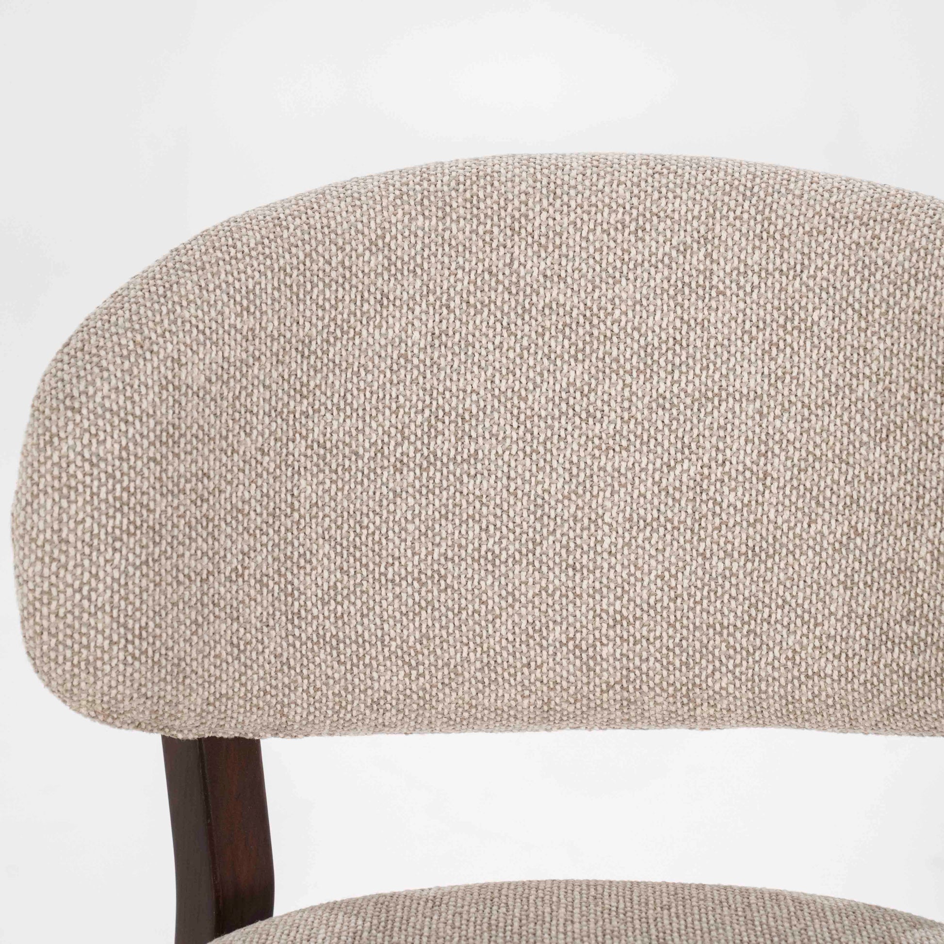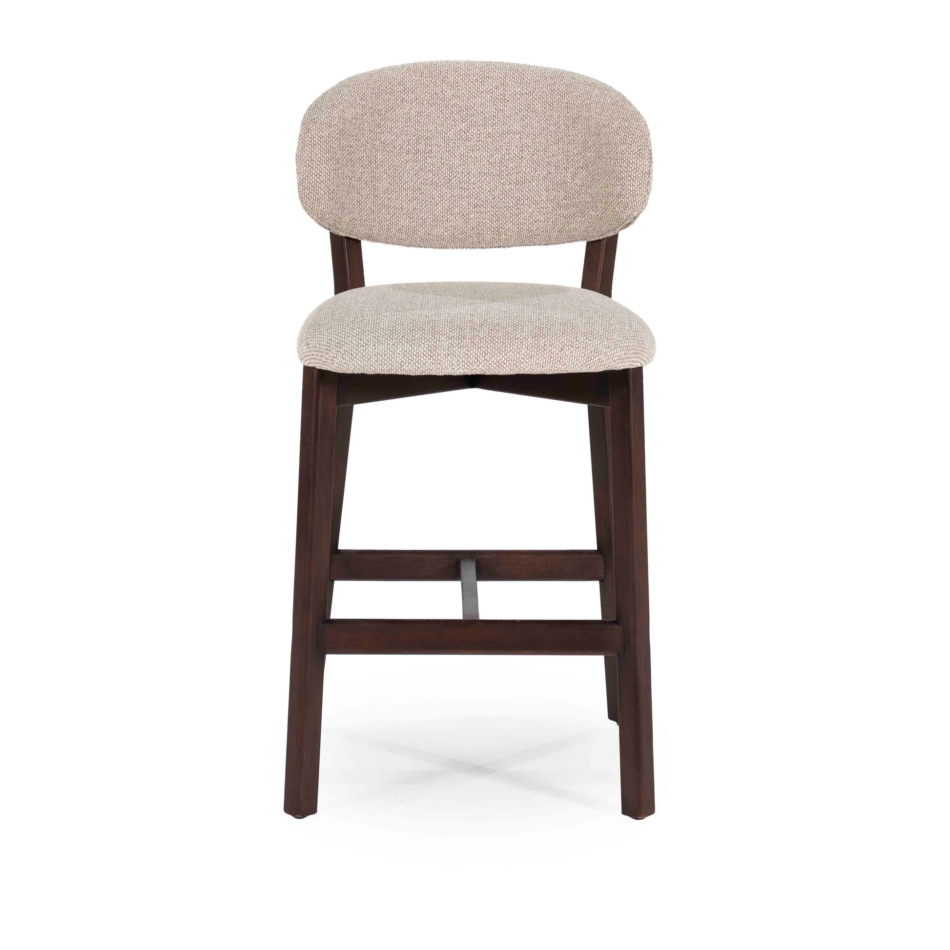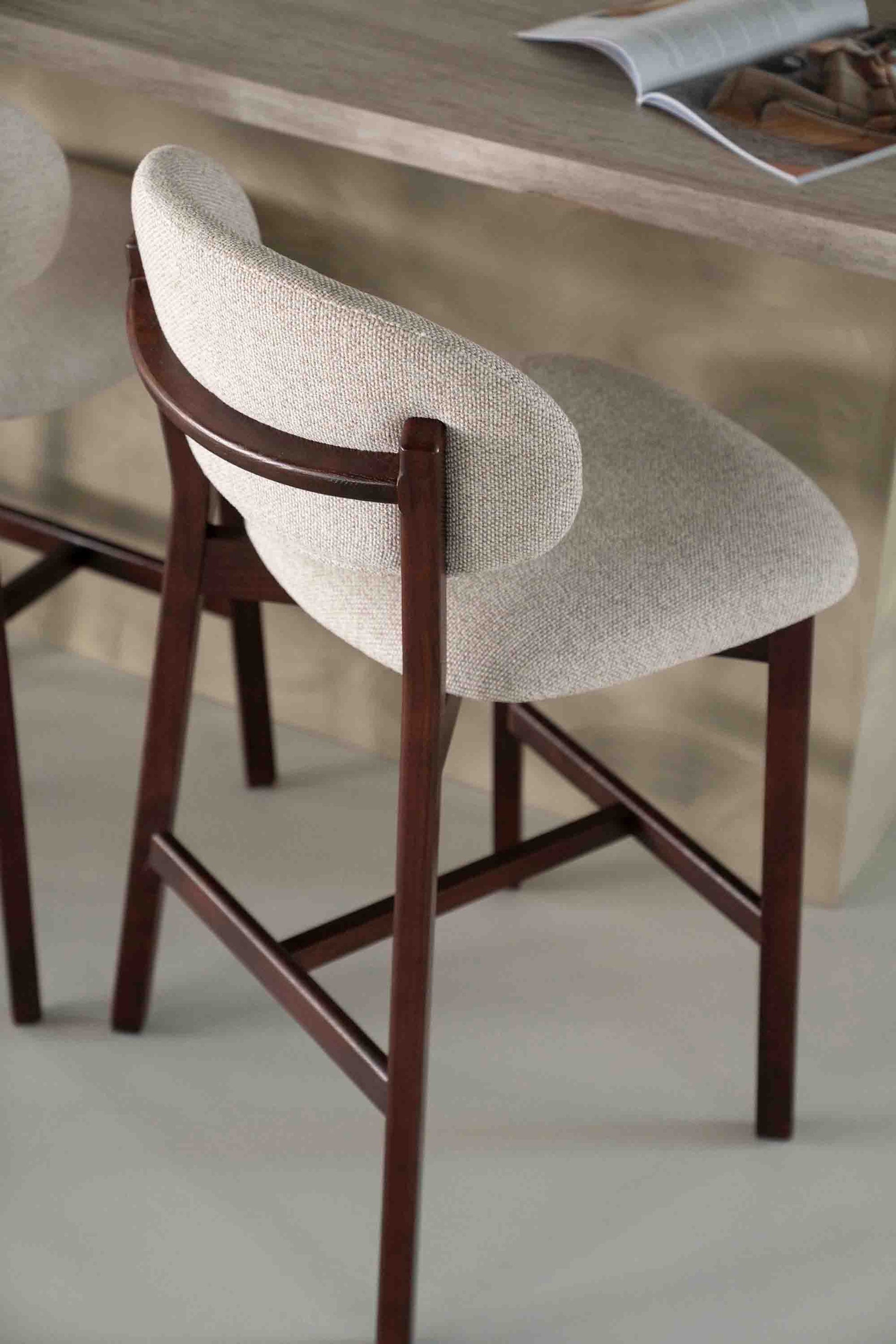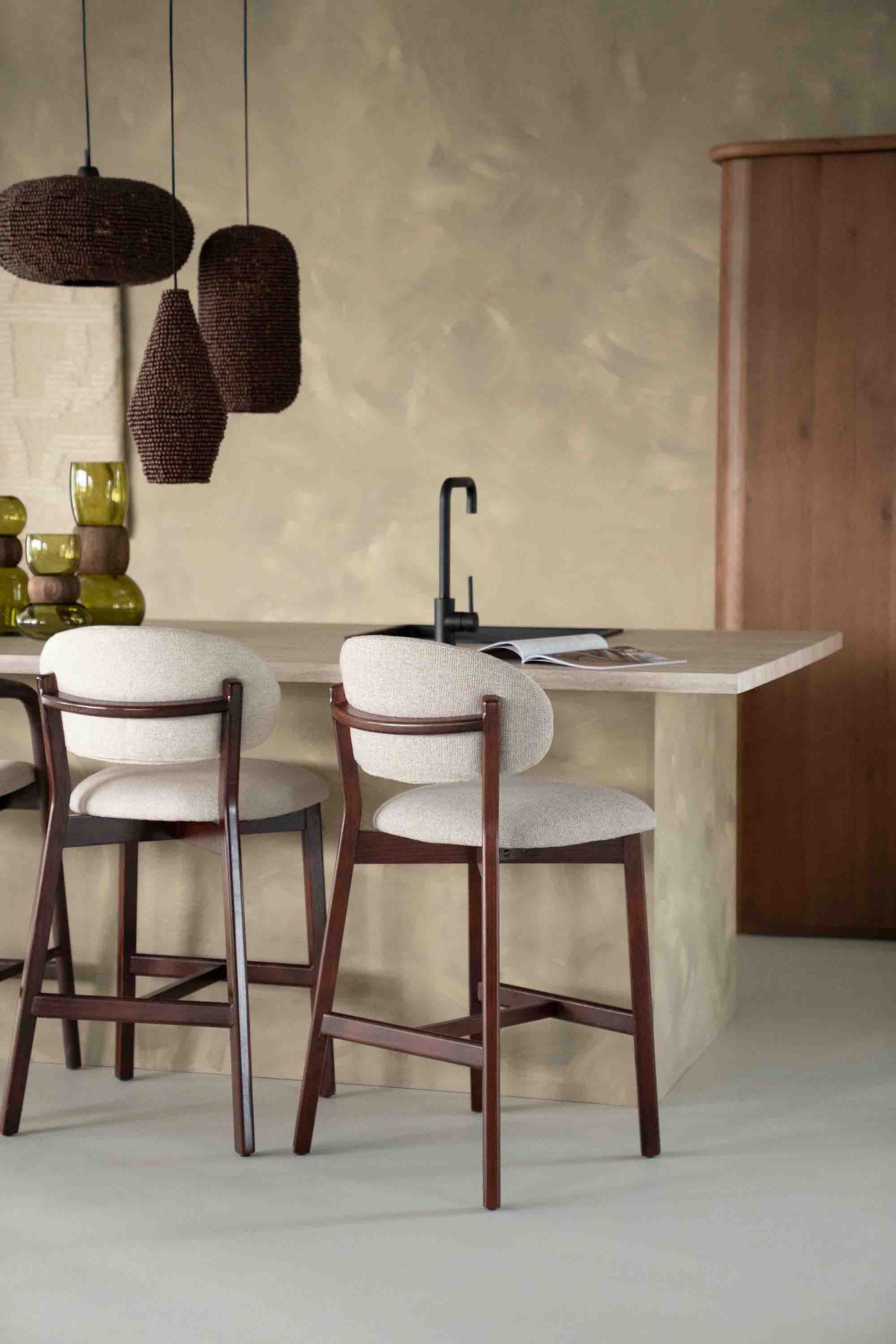 Denne elegante barstolen kombinerer et tidløst design med funksjonell komfort. Det solide understellet i mørkt tre gir et eksklusivt uttrykk, mens det polstrede setet og den avrundede ryggen i lys tekstil gir god sittekomfort.