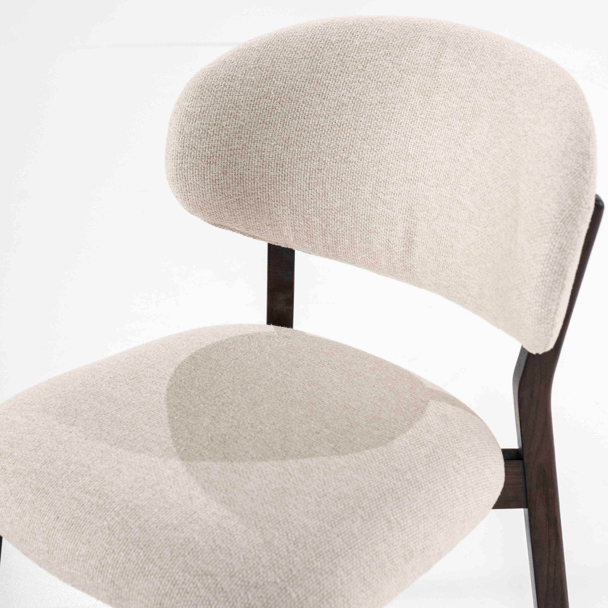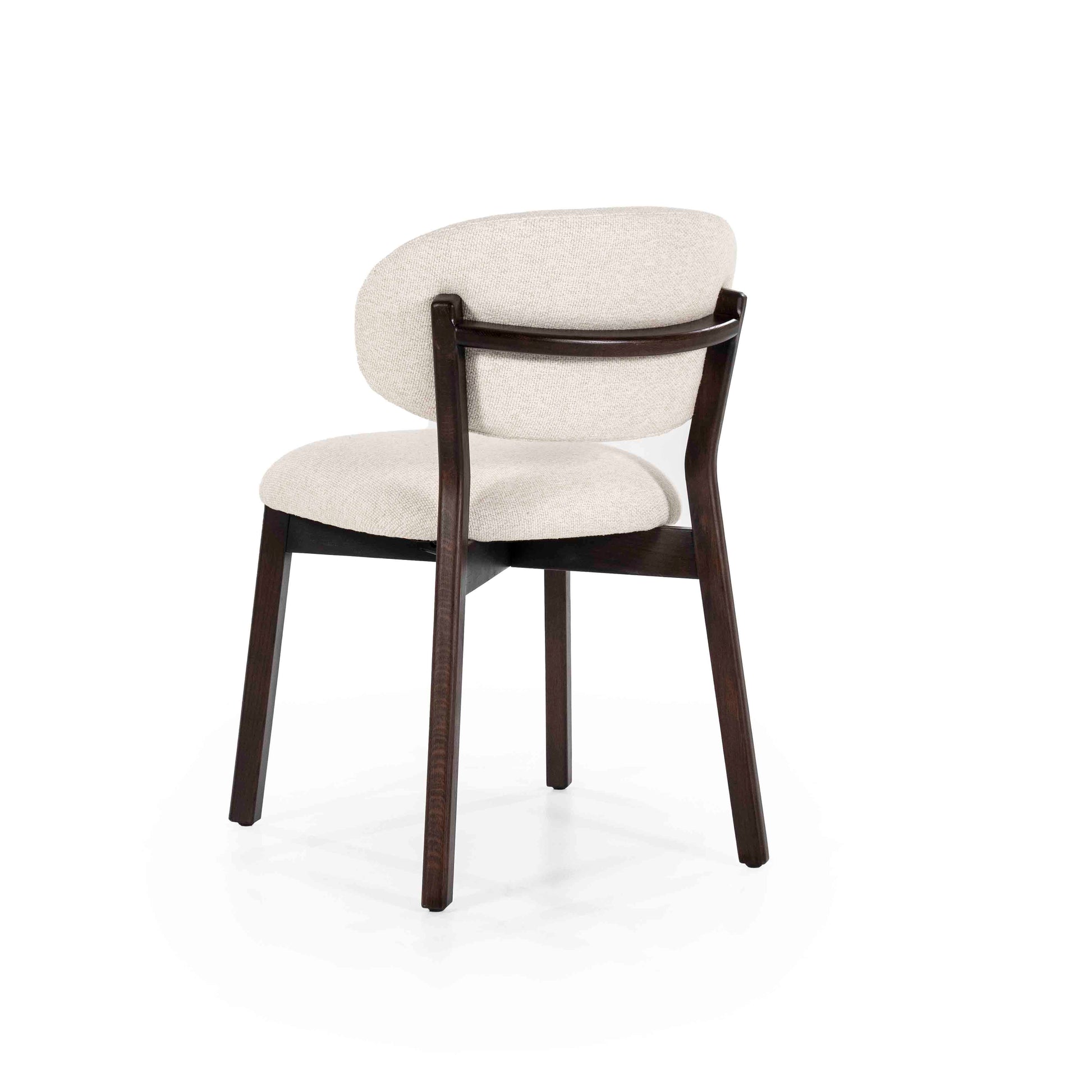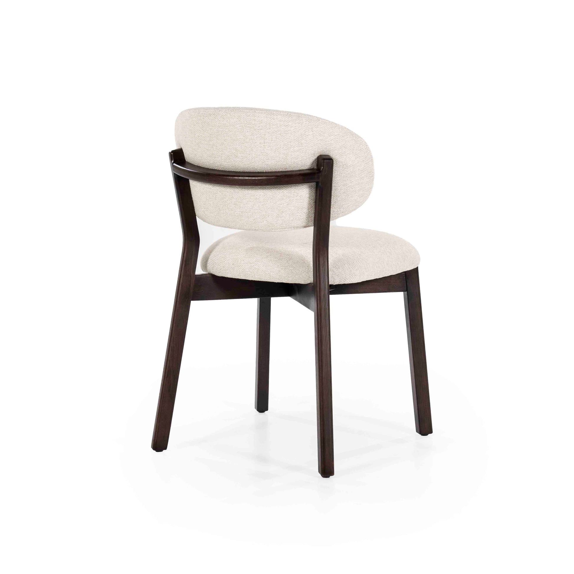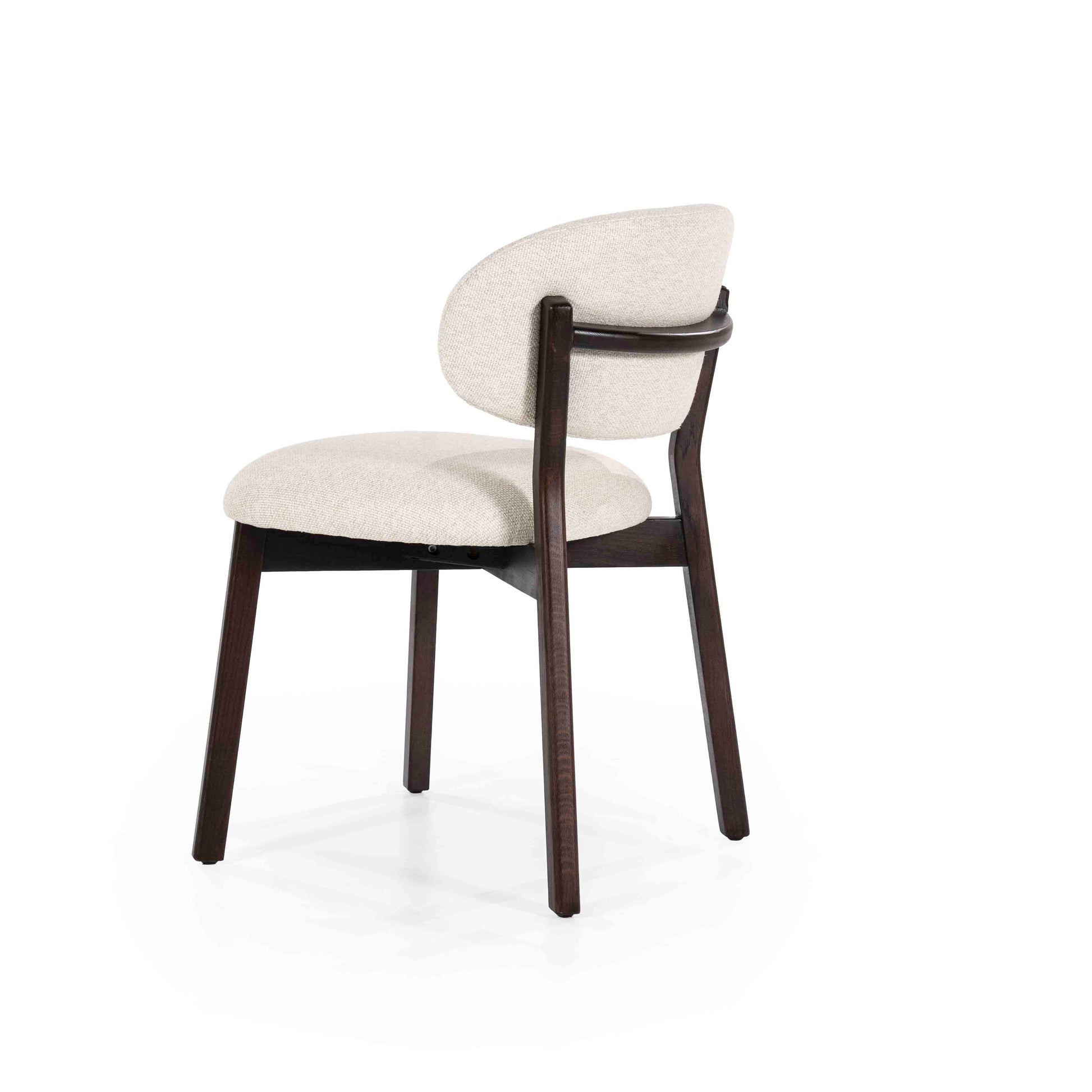 Denne stilrene spisestolen kombinerer nordisk enkelhet med høy komfort. Det solide understellet i mørk tre gir et elegant og varm uttrykk, mens det myke, polstrede setet og den avrundede ryggen sørger for behagelig støtte under lange måltider.