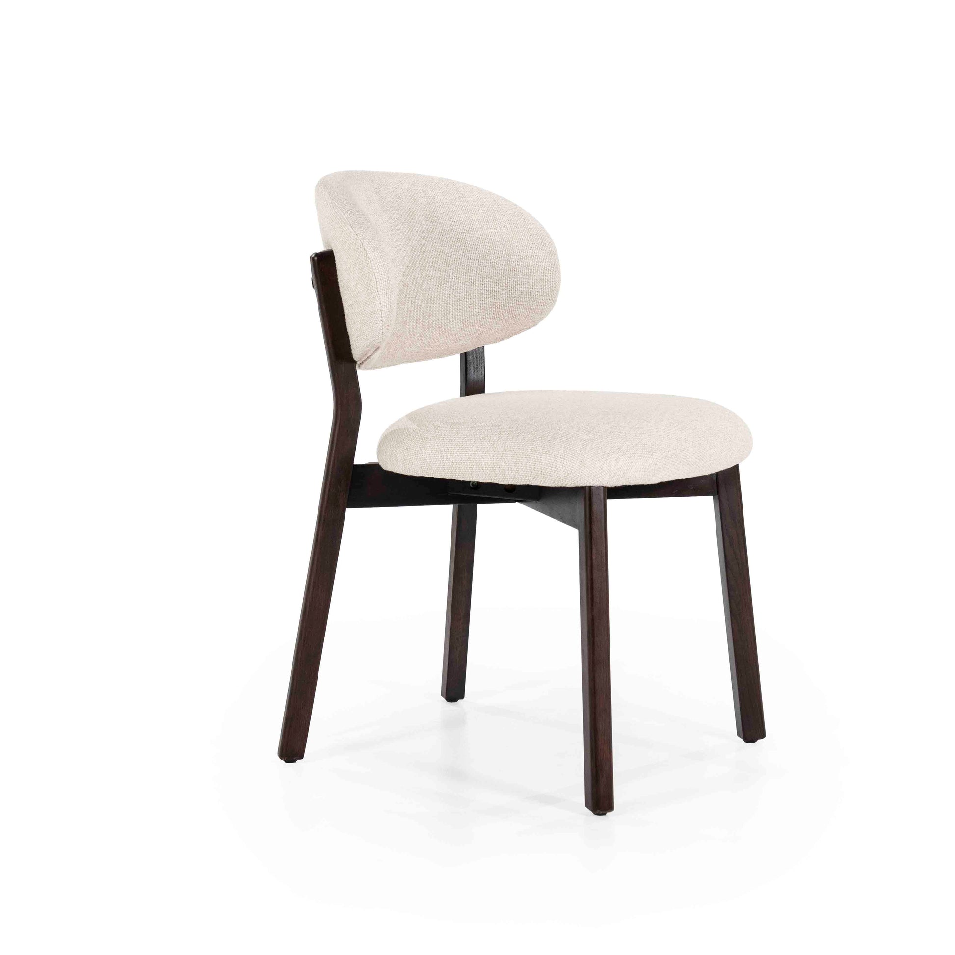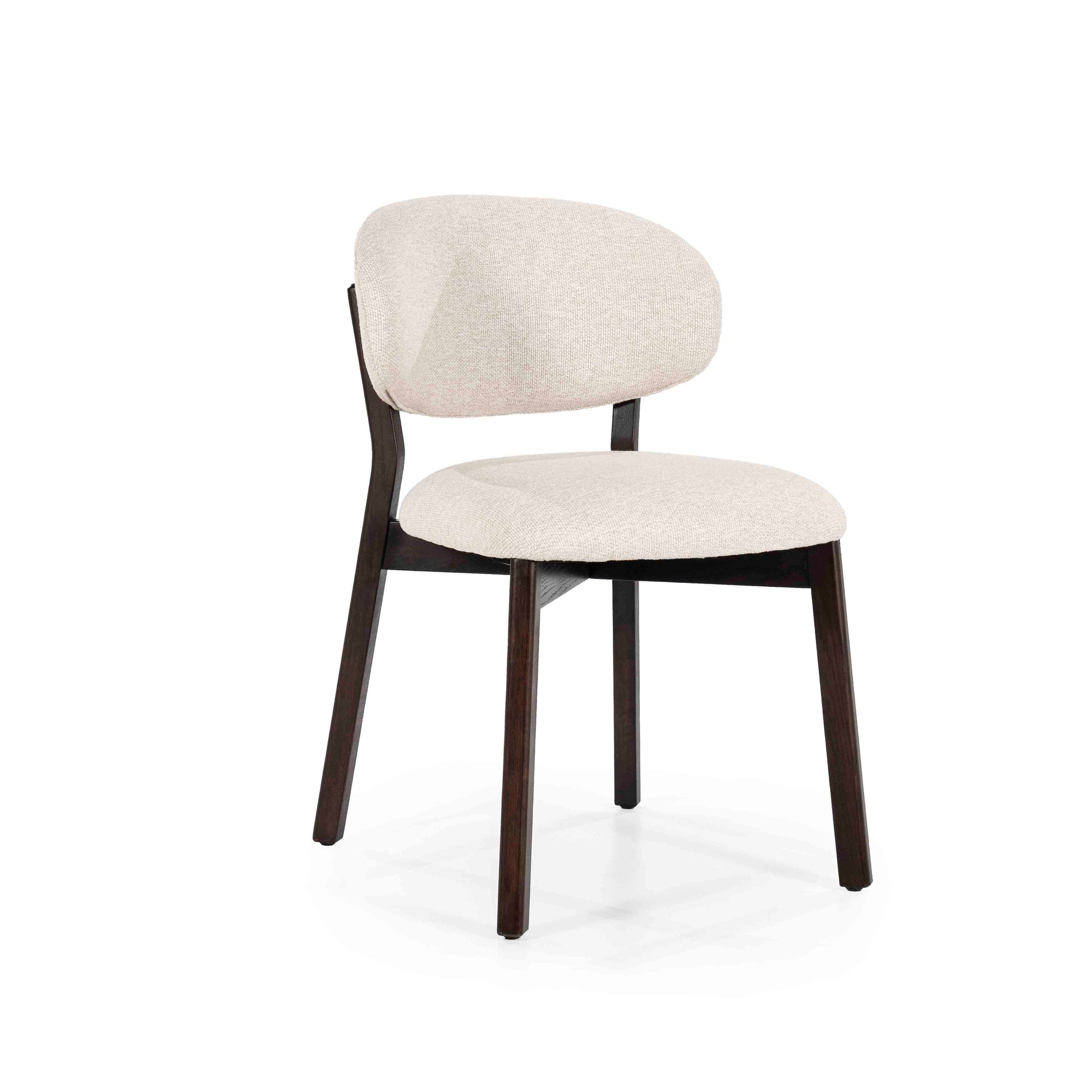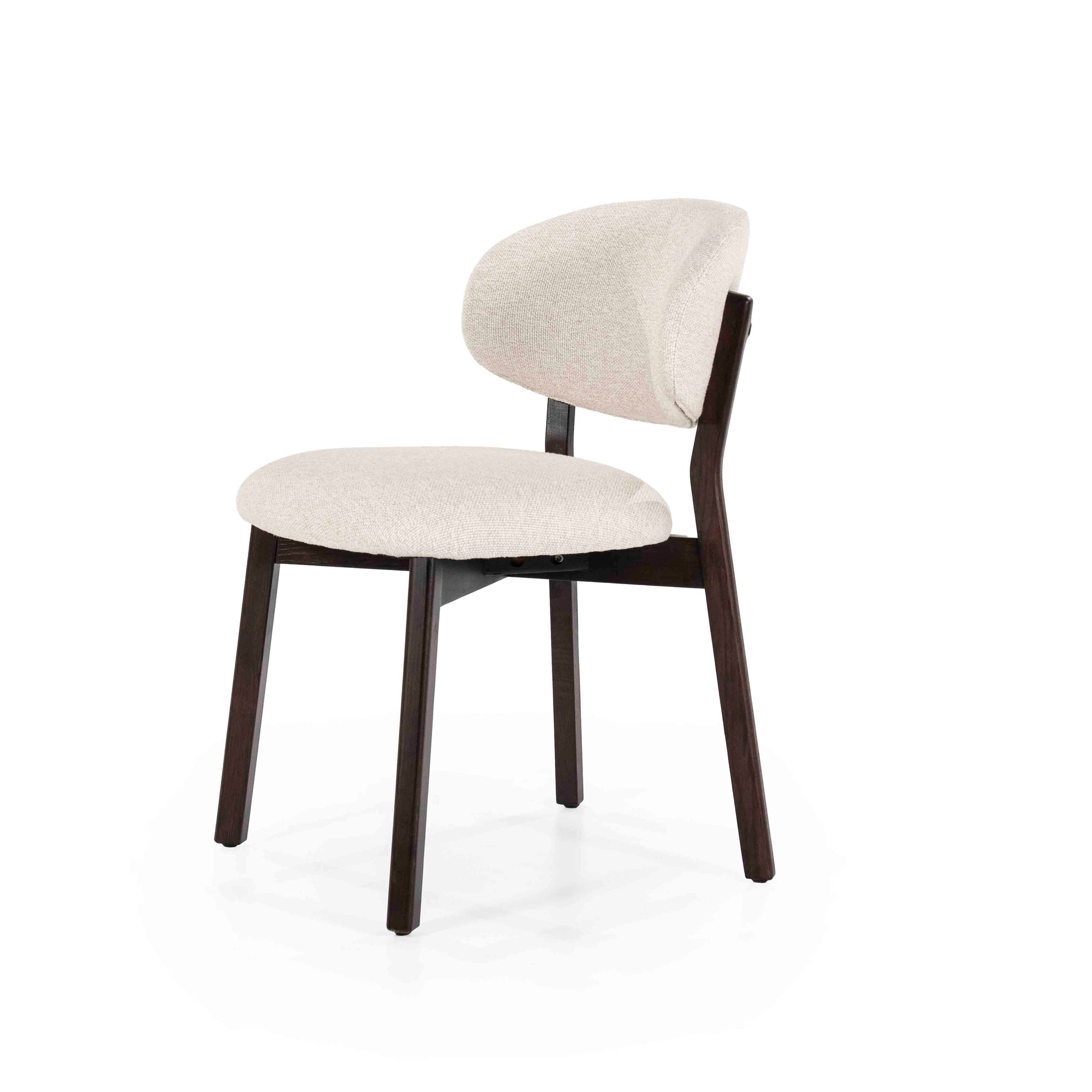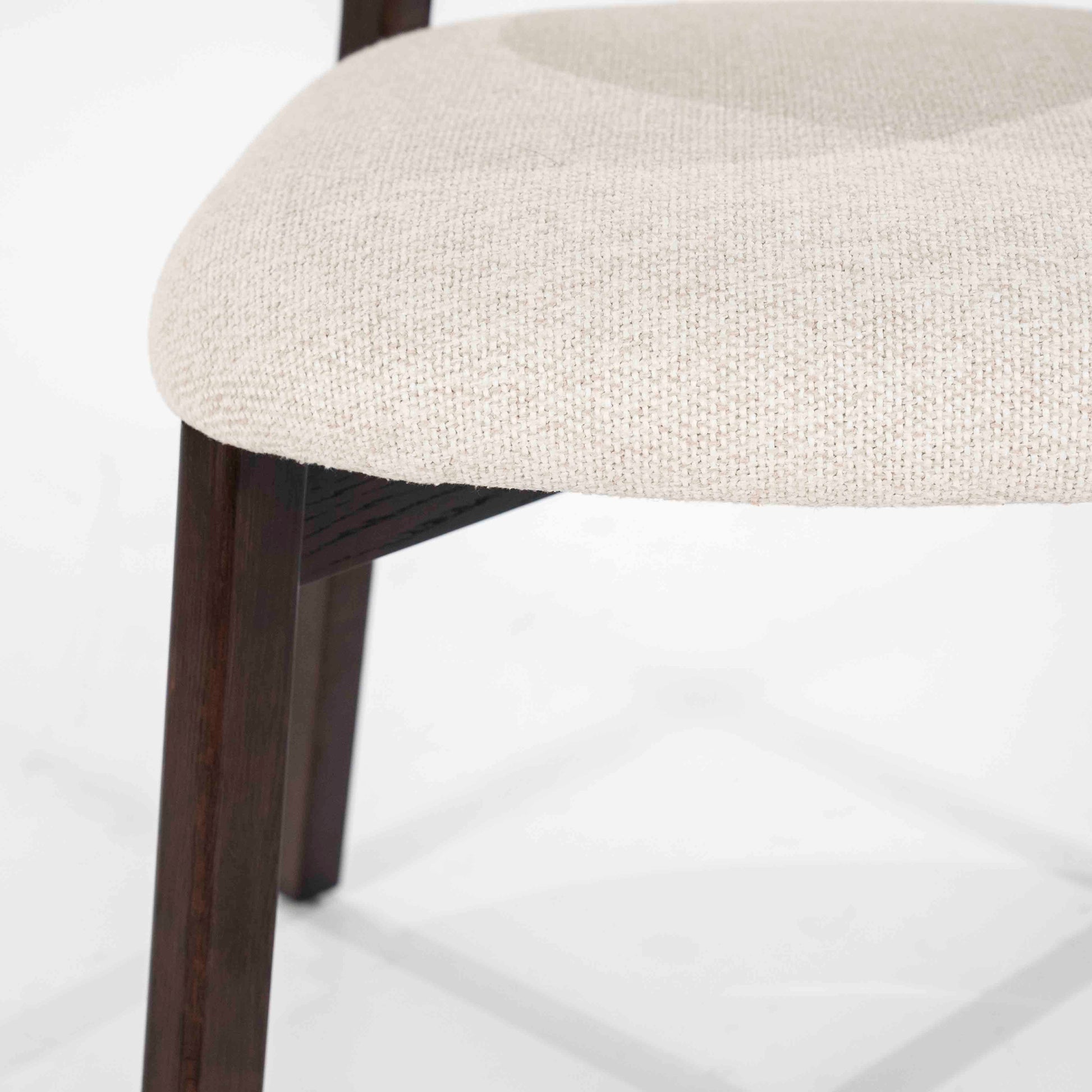 Denne stilrene spisestolen kombinerer nordisk enkelhet med høy komfort. Det solide understellet i mørk tre gir et elegant og varm uttrykk, mens det myke, polstrede setet og den avrundede ryggen sørger for behagelig støtte under lange måltider.