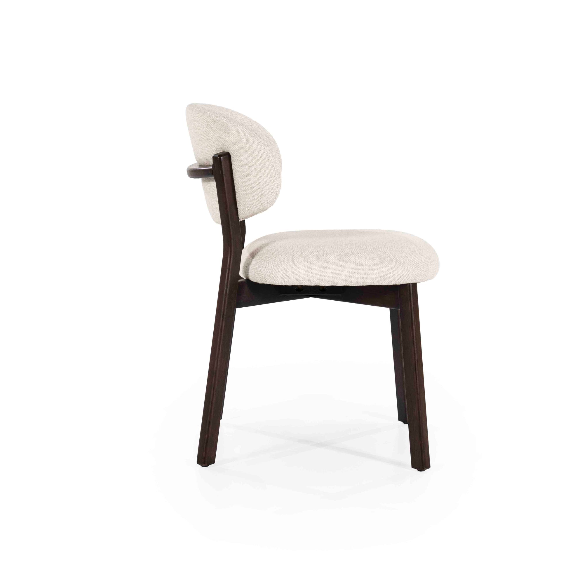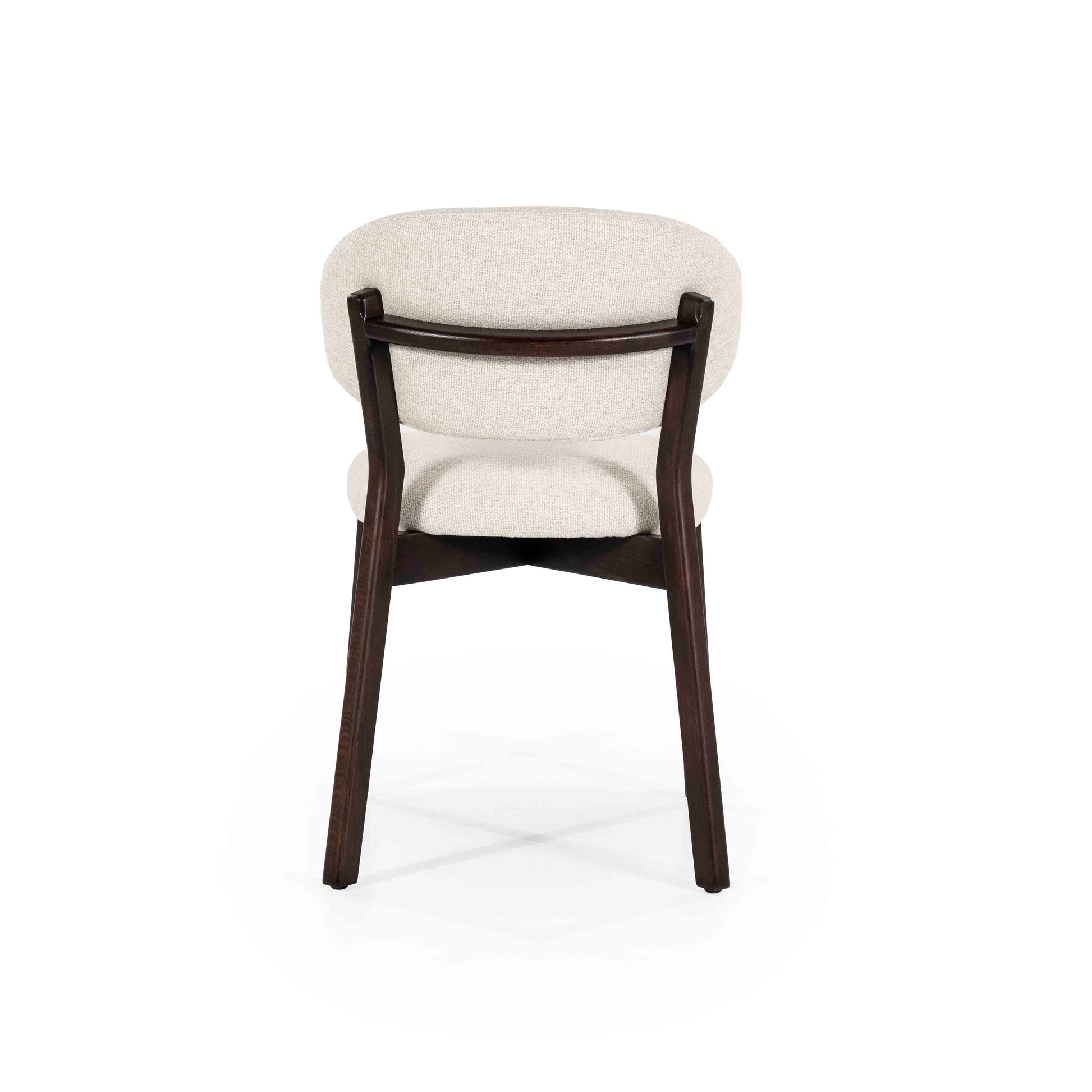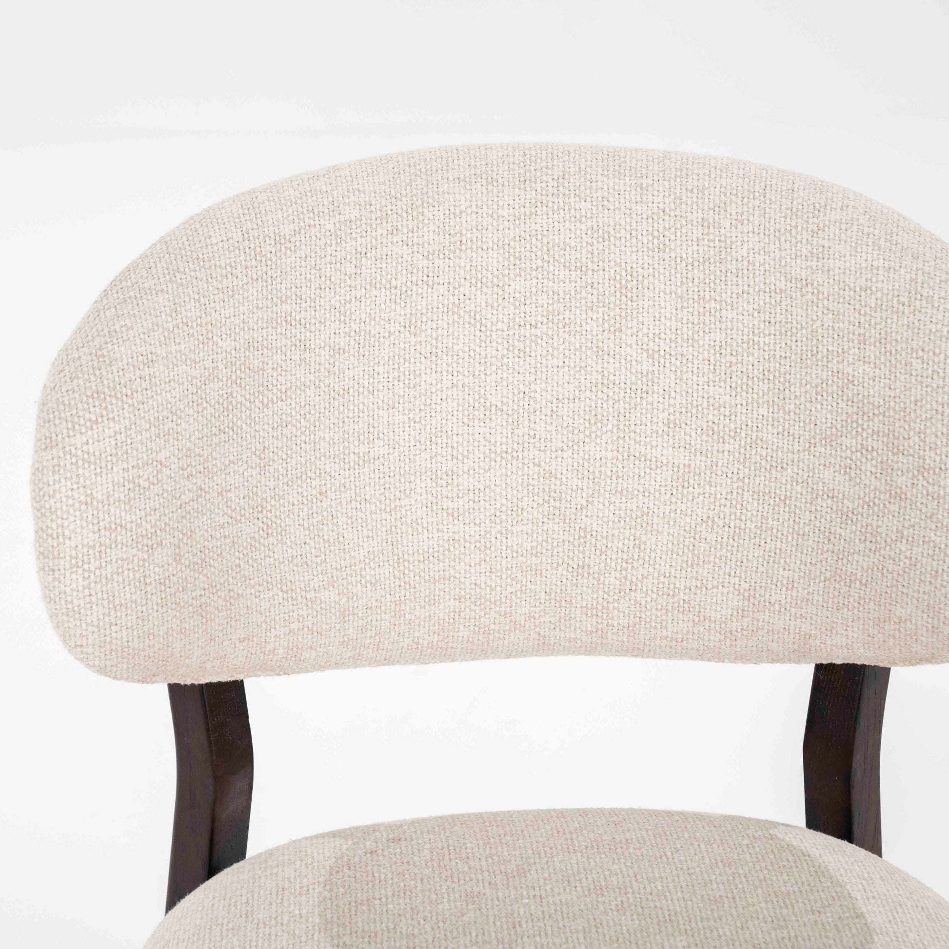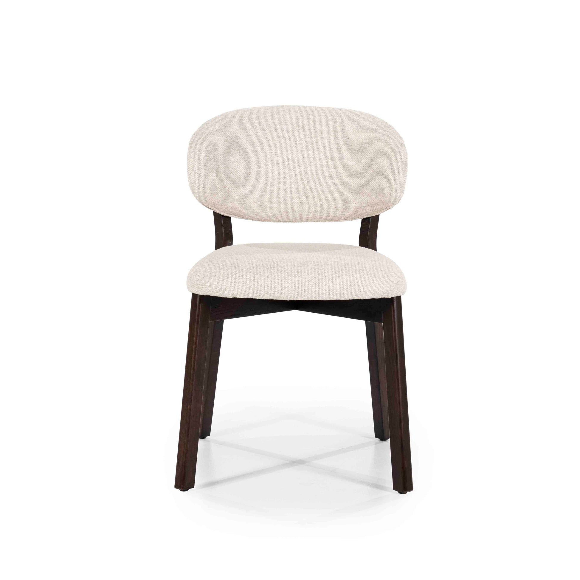 Denne stilrene spisestolen kombinerer nordisk enkelhet med høy komfort. Det solide understellet i mørk tre gir et elegant og varm uttrykk, mens det myke, polstrede setet og den avrundede ryggen sørger for behagelig støtte under lange måltider.